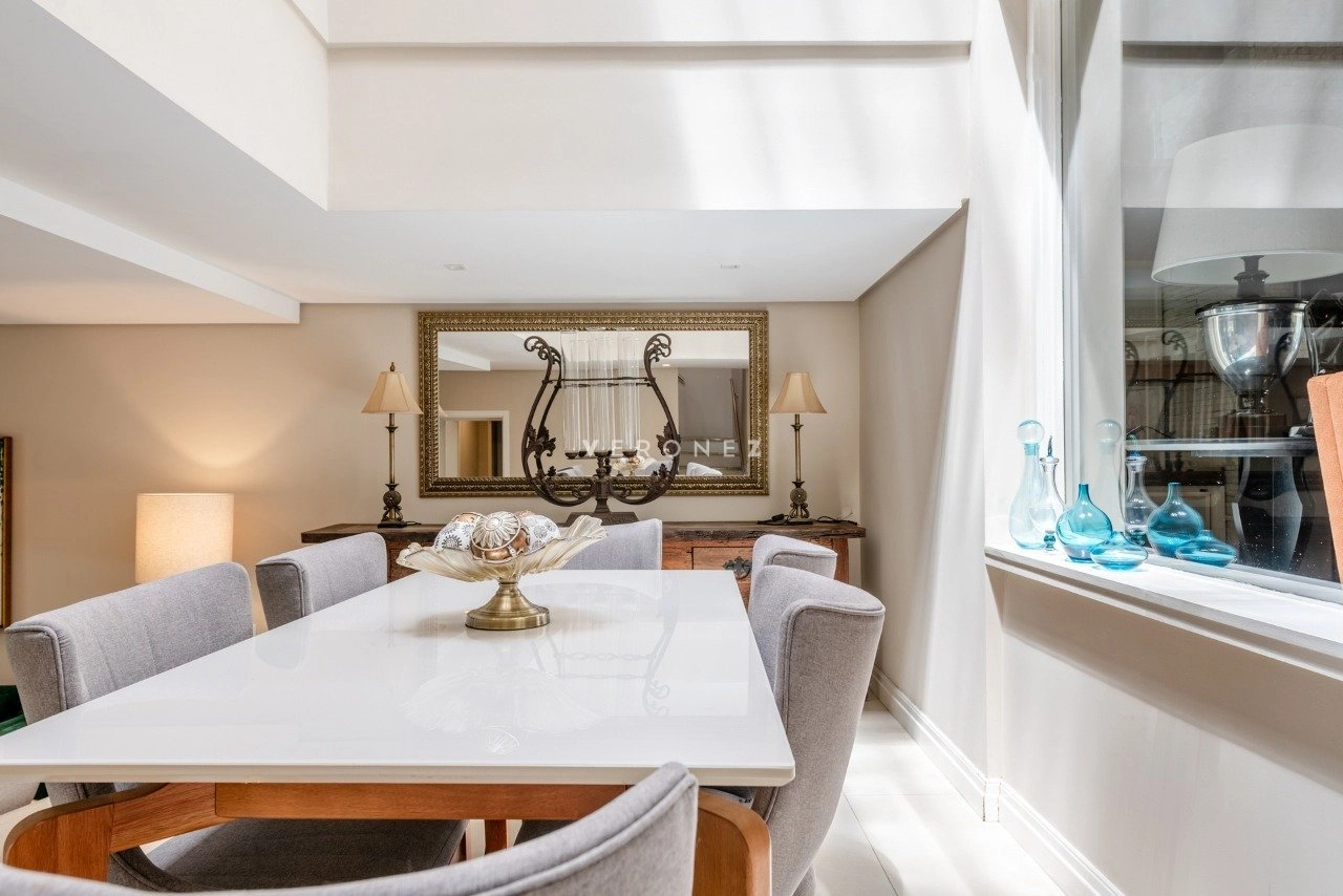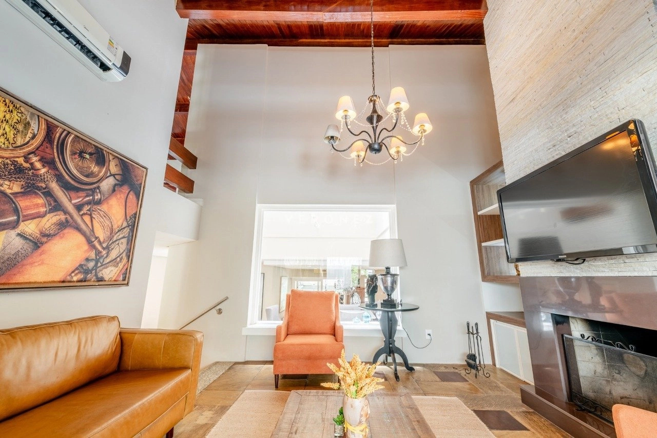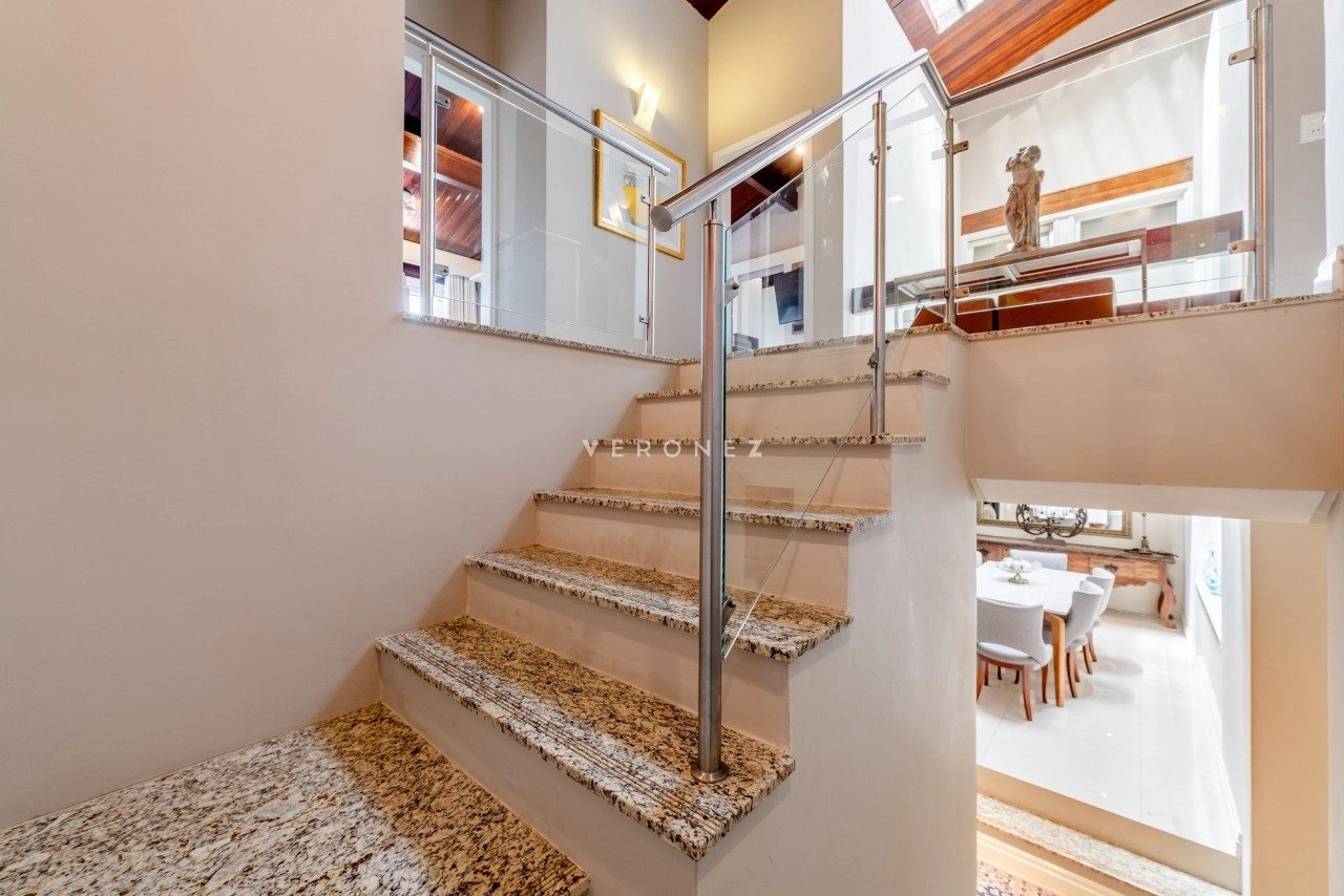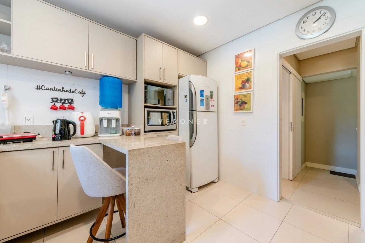 No pavimento inferior, o imóvel oferece um living amplo e acolhedor, com lareira, integrado à sala de jantar, criando um ambiente ideal para receber. A cozinha planejada possui acesso direto à área de serviço independente, trazendo praticidade ao dia a dia. O espaço gourmet com churrasqueira complementa a área social, além de contar com depósito e garagem para até 4 veículos, sendo 2 vagas cobertas.