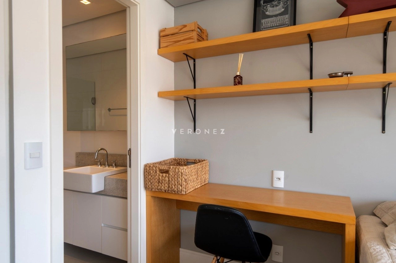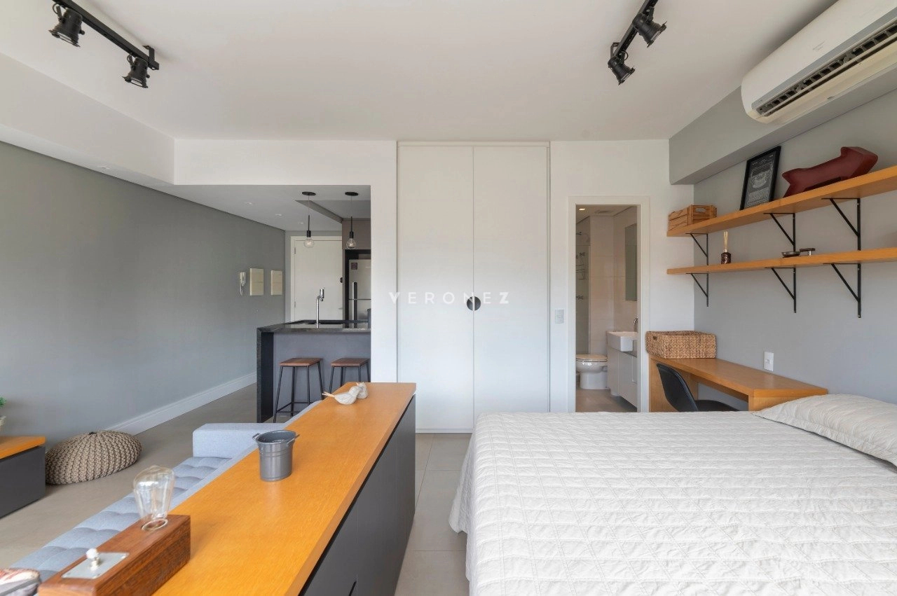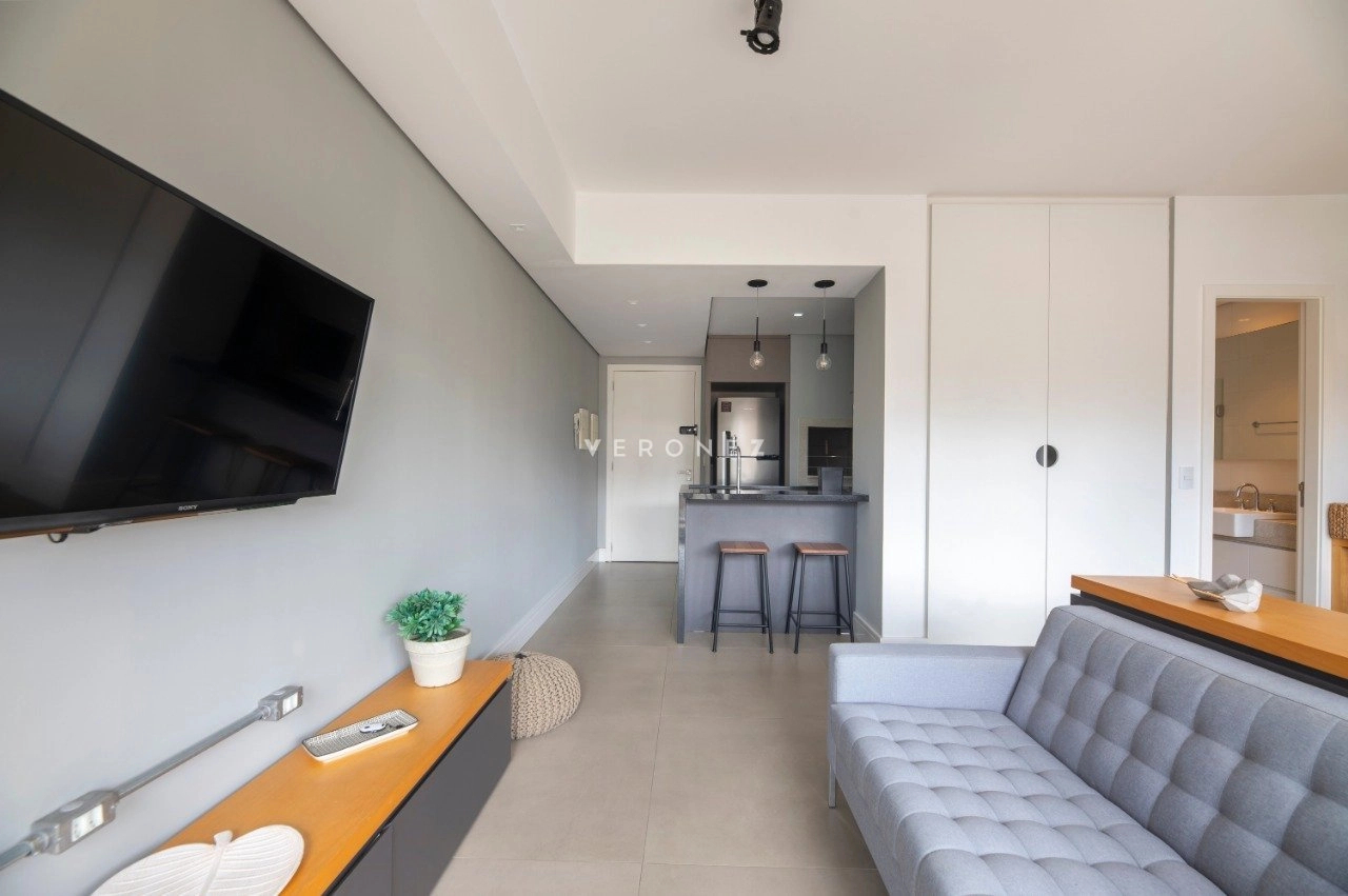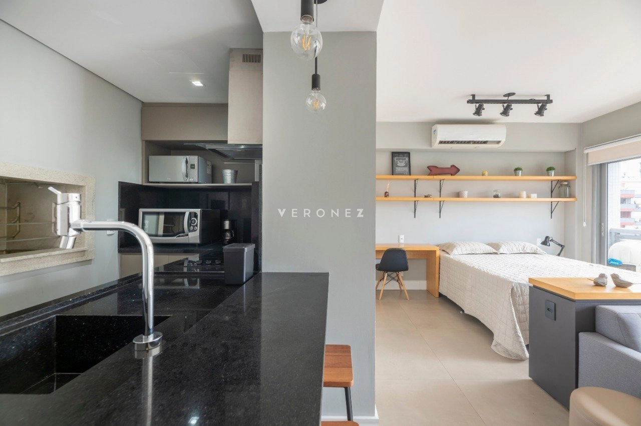 Studio mobiliado de 39 m², com projeto moderno e funcional. O imóvel recebe sol da manhã e conta com sacada com vista privilegiada.