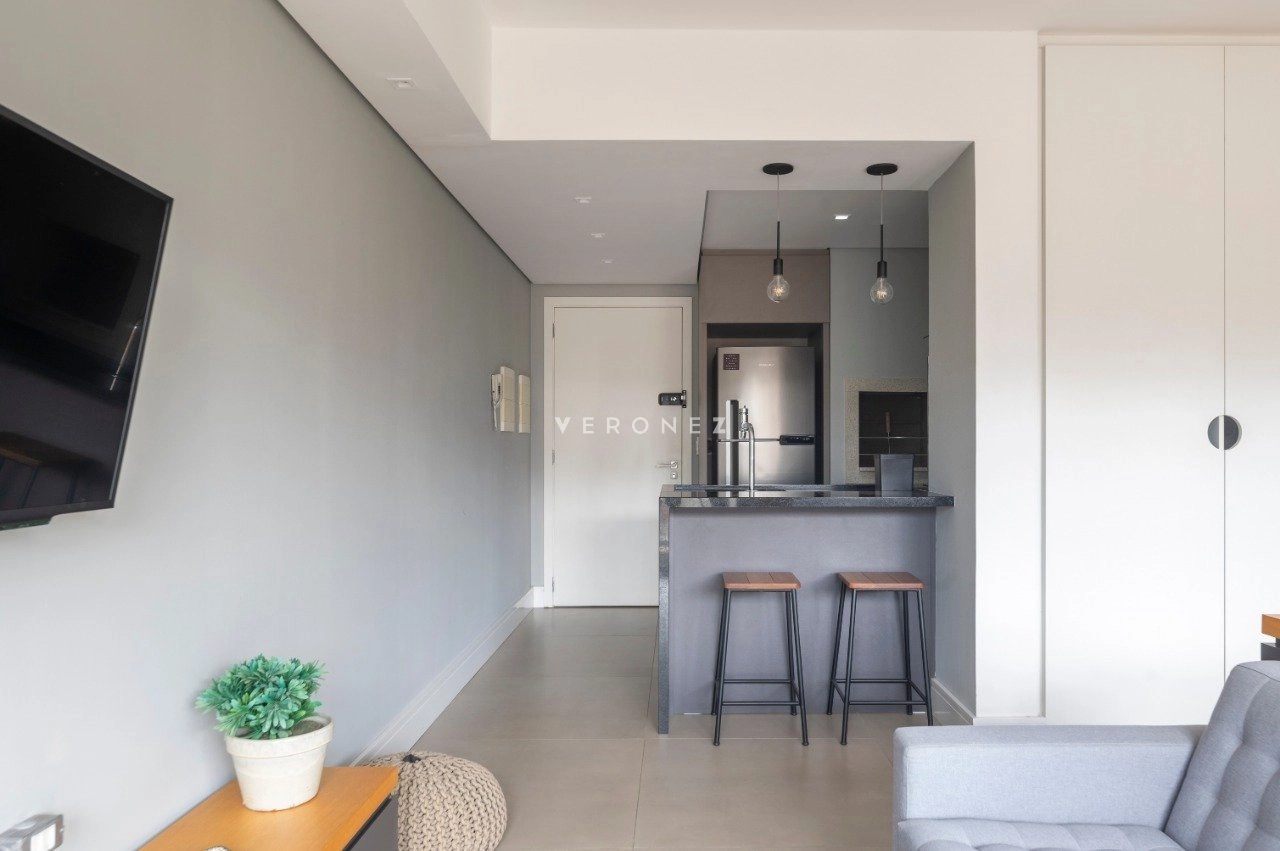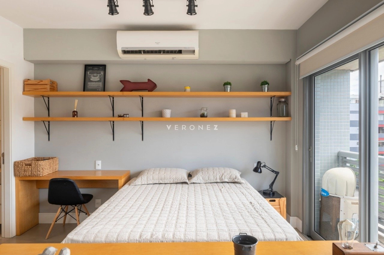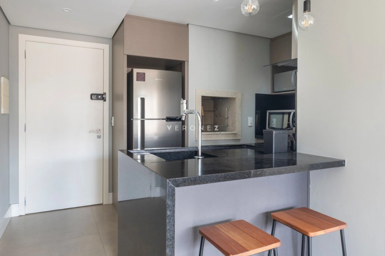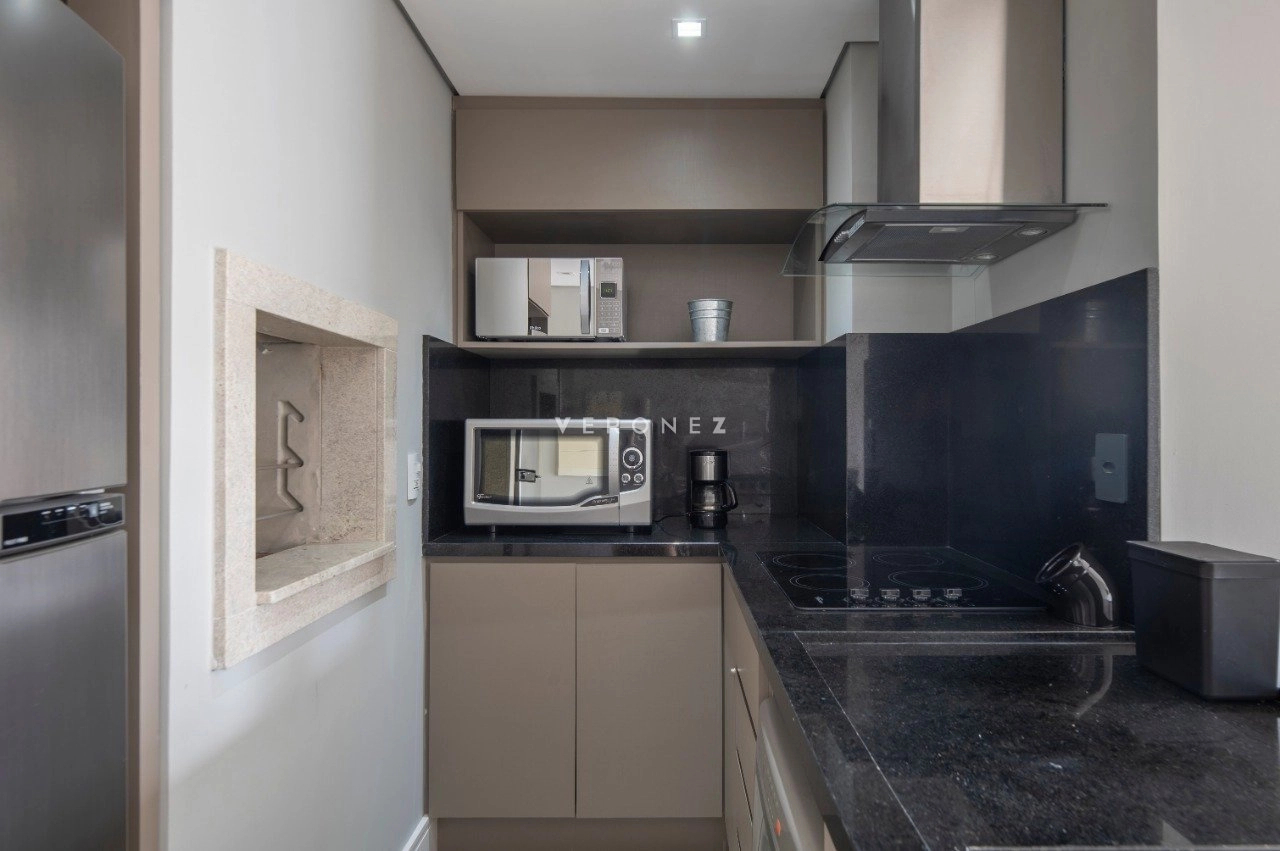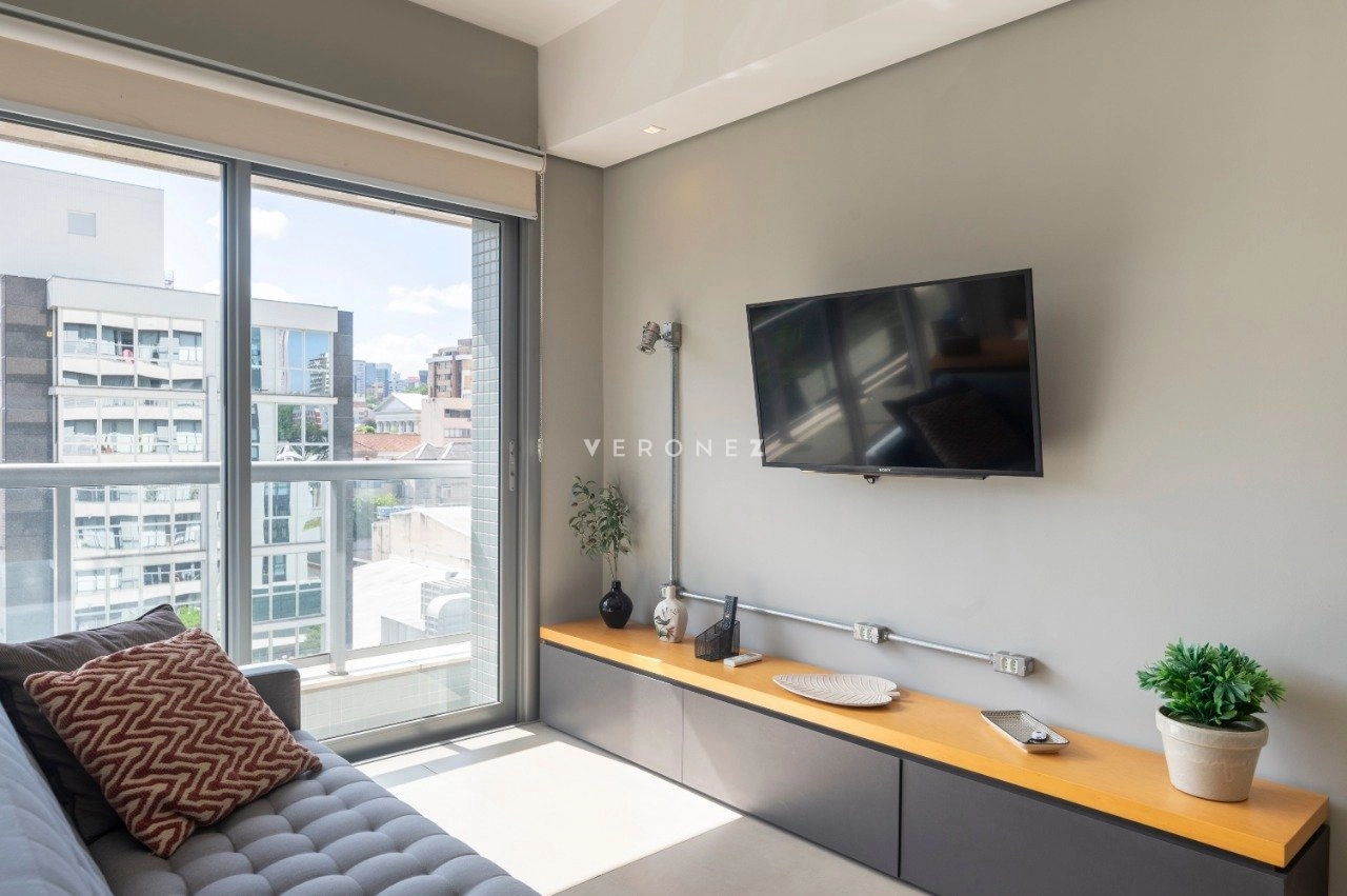 Studio mobiliado de 39 m², com projeto moderno e funcional. O imóvel recebe sol da manhã e conta com sacada com vista privilegiada.