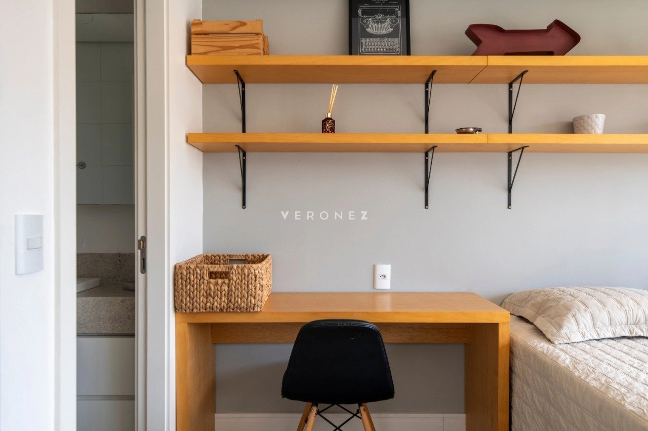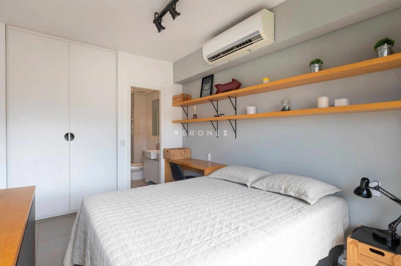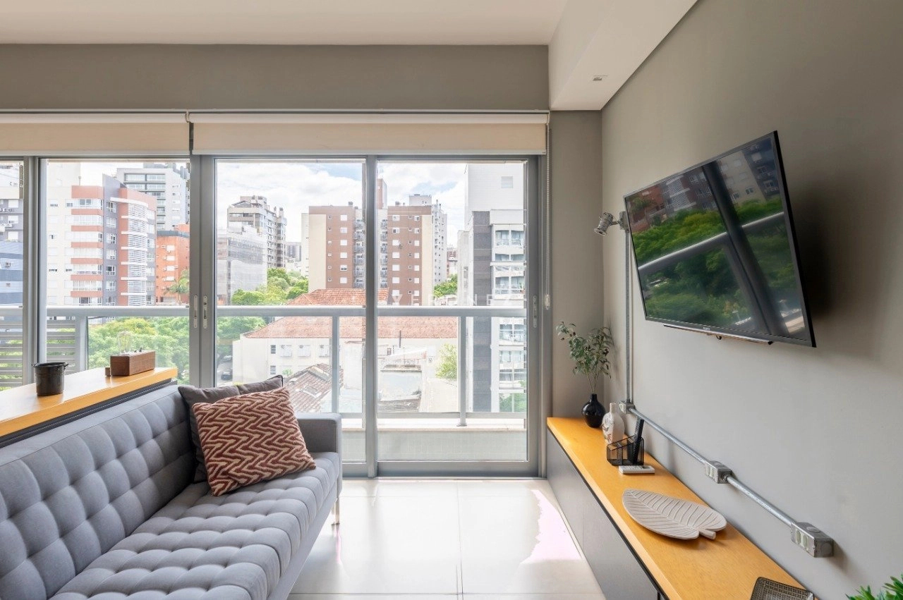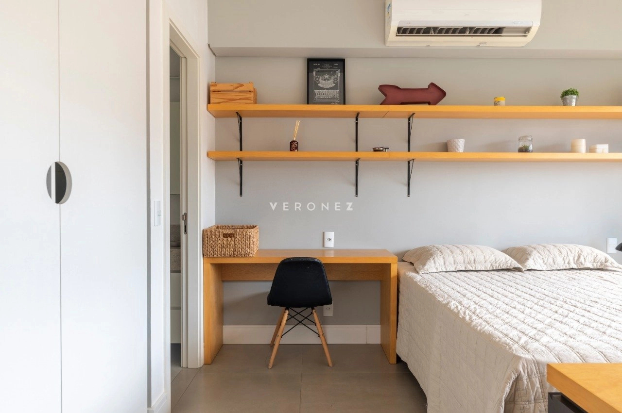 Studio mobiliado de 39 m², com projeto moderno e funcional. O imóvel recebe sol da manhã e conta com sacada com vista privilegiada.