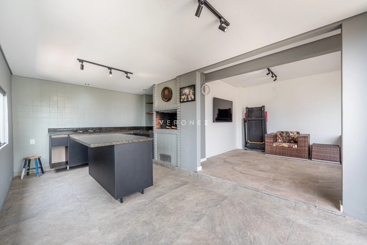 Na parte superior ficam a piscina, espaço gourmet com churrasqueira, sala-de-estar além de um banheiro auxiliar e depósito. Conta ainda com 2 vagas de garagem cobertas.