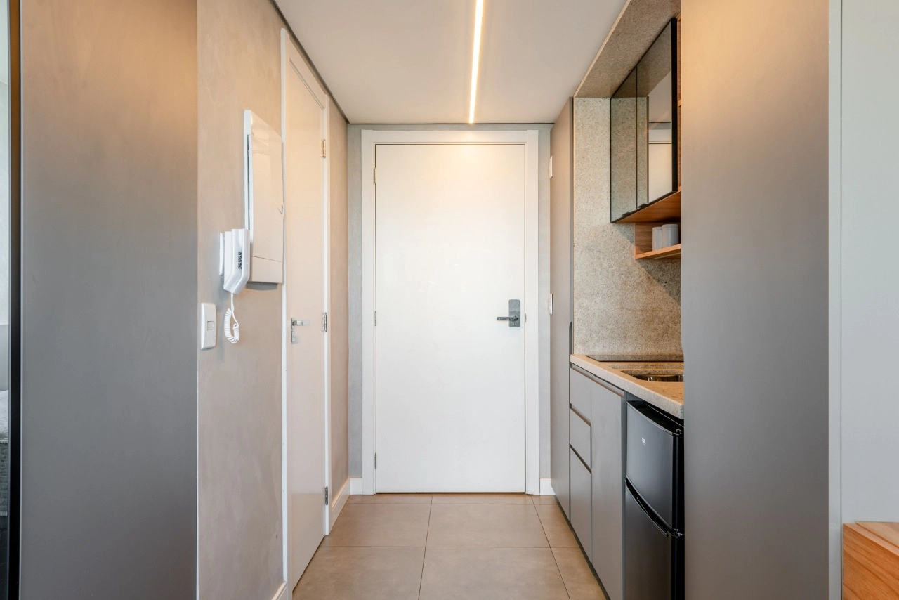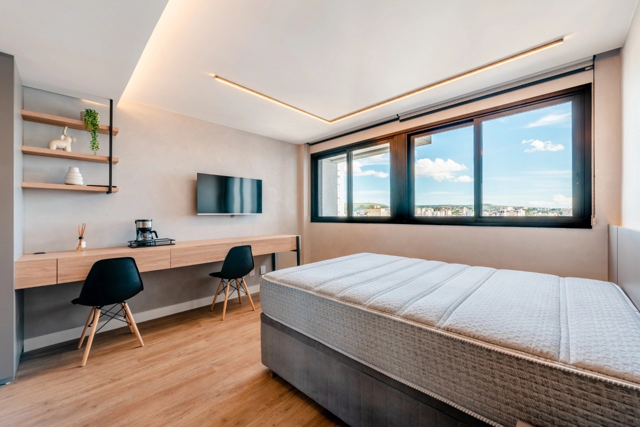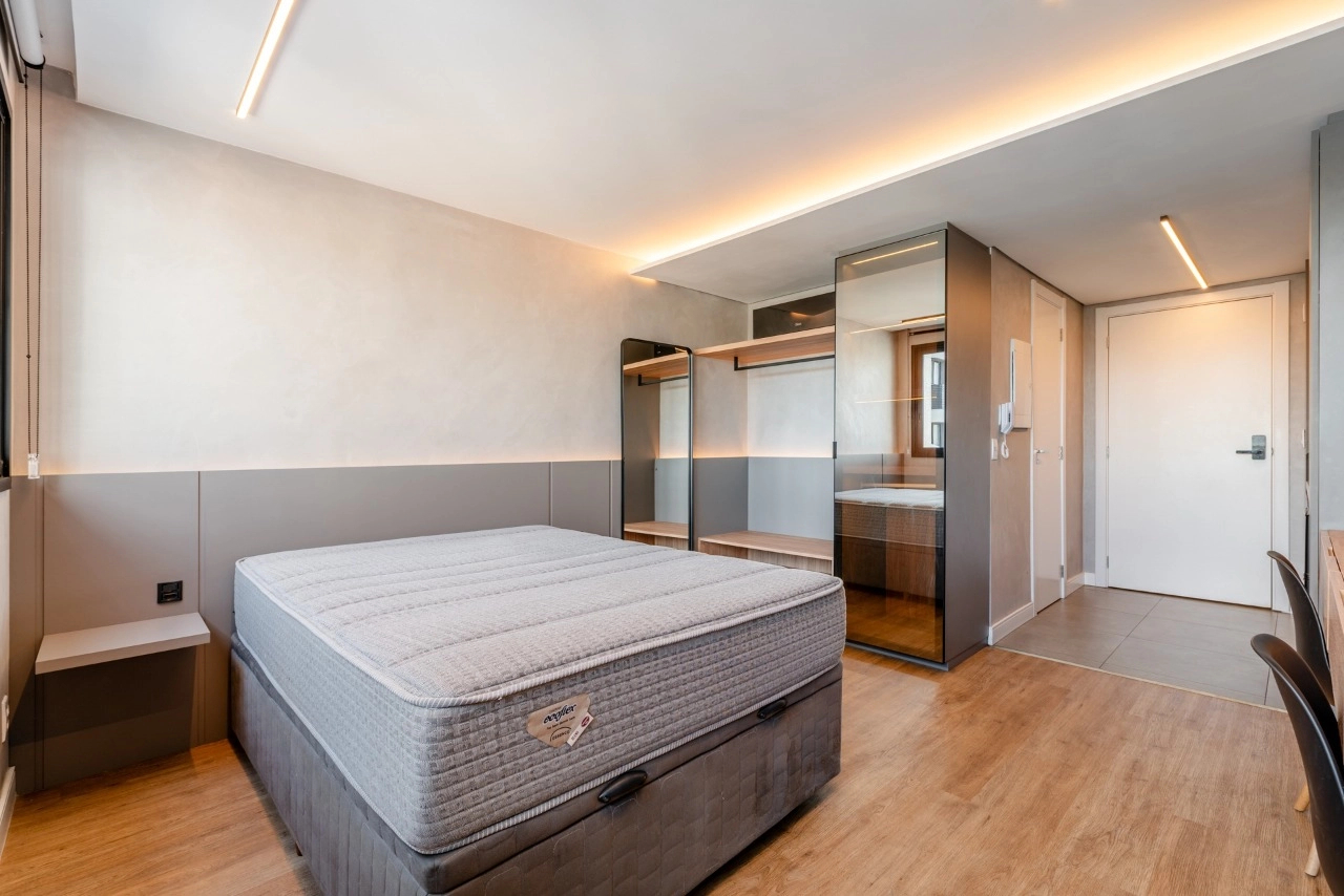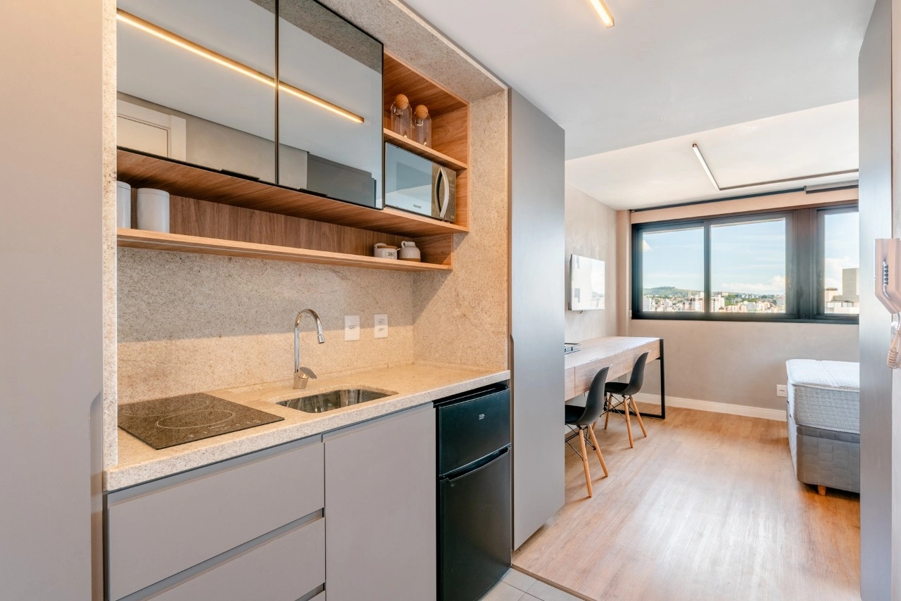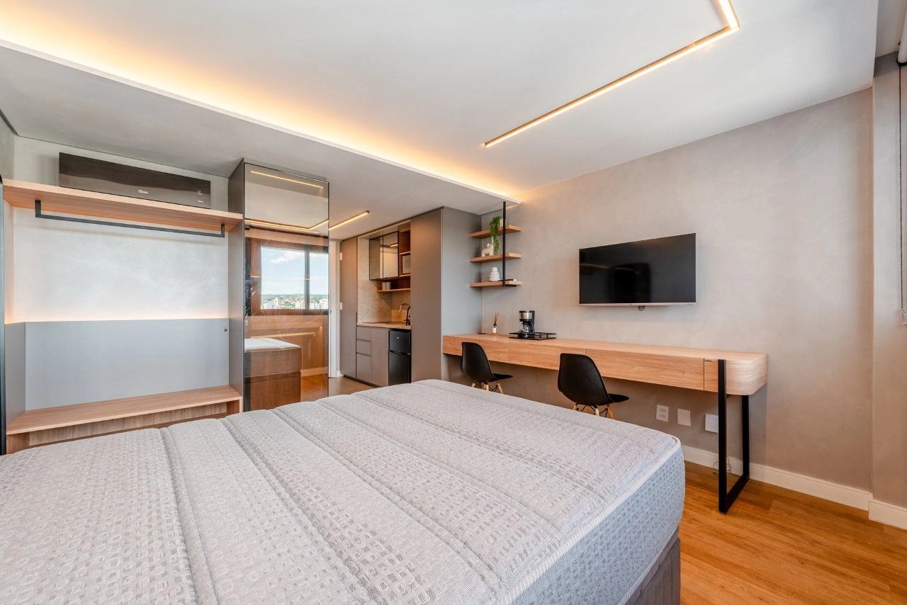 Studio impecável no empreendimento Go Rio Branco. A unidade está totalmente mobiliada e equipada, pronta para morar ou gerar renda imediata com locação tradicional ou short stay.
