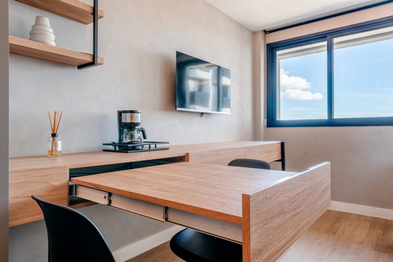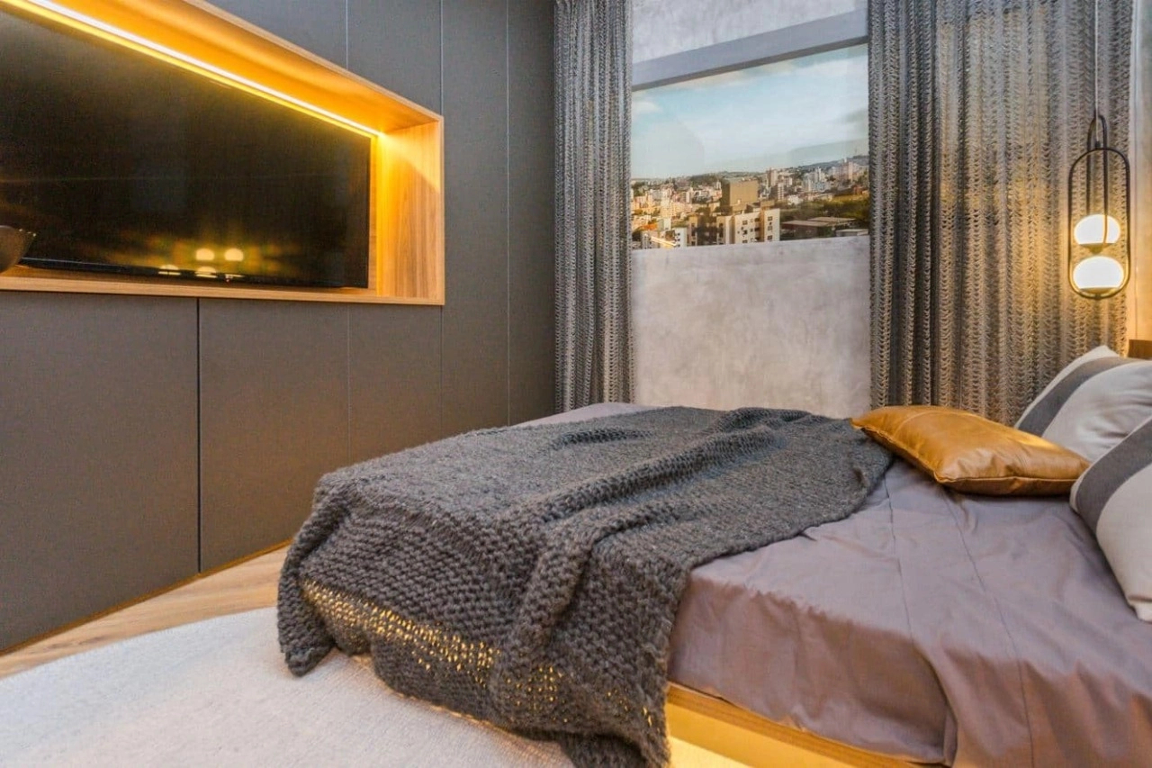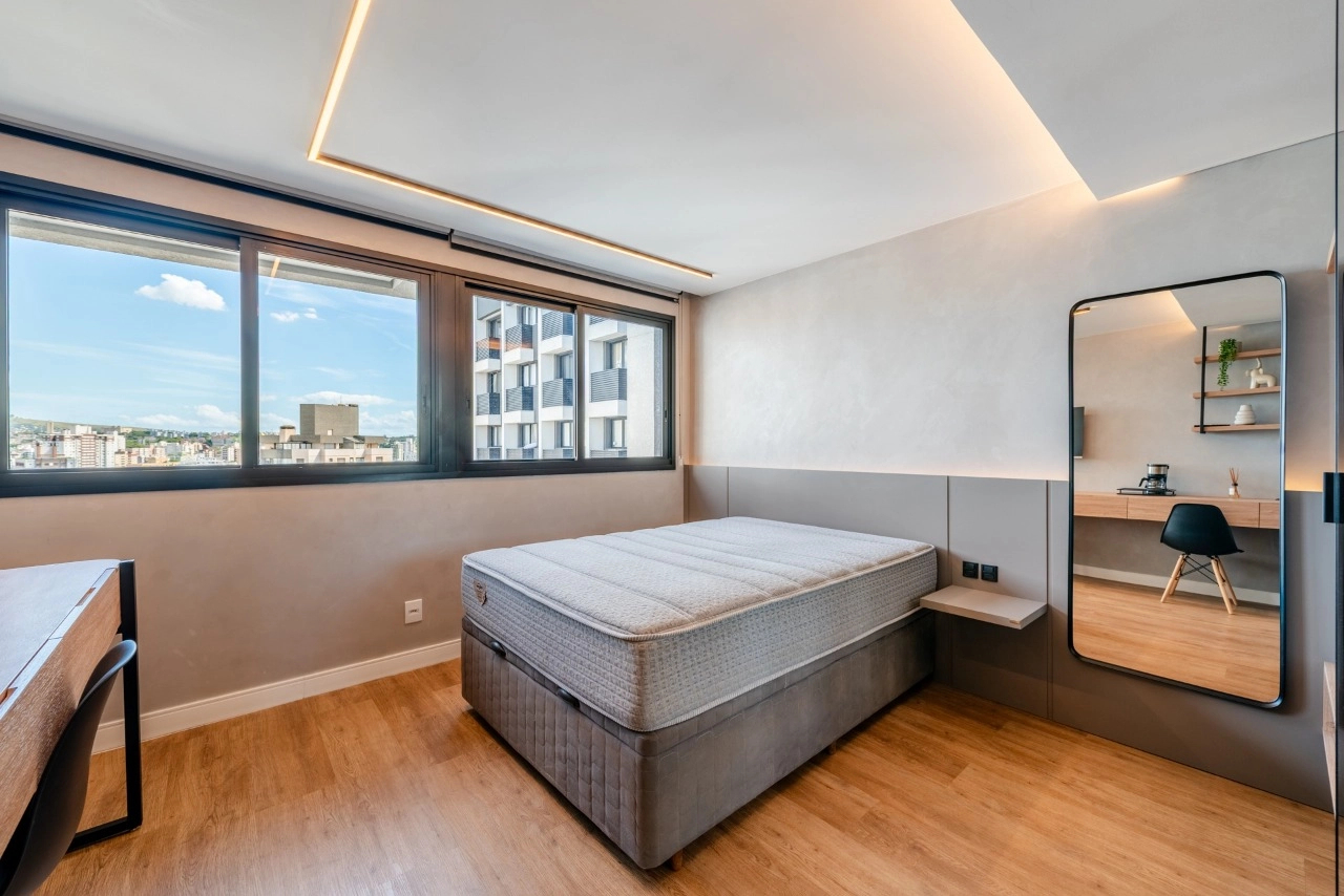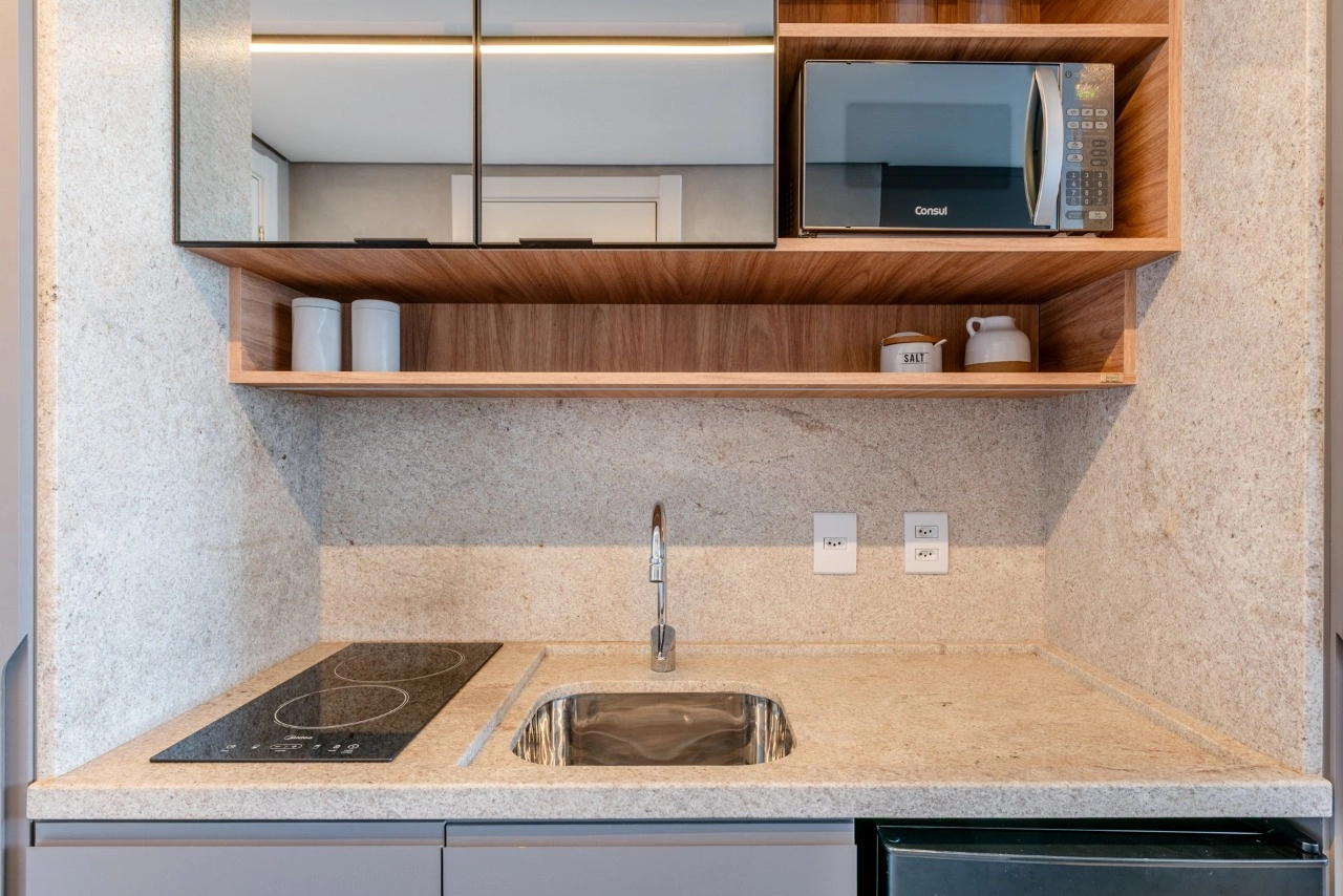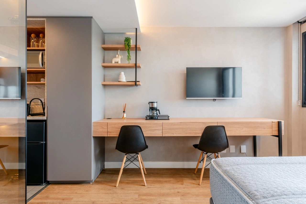 Studio impecável no empreendimento Go Rio Branco. A unidade está totalmente mobiliada e equipada, pronta para morar ou gerar renda imediata com locação tradicional ou short stay.