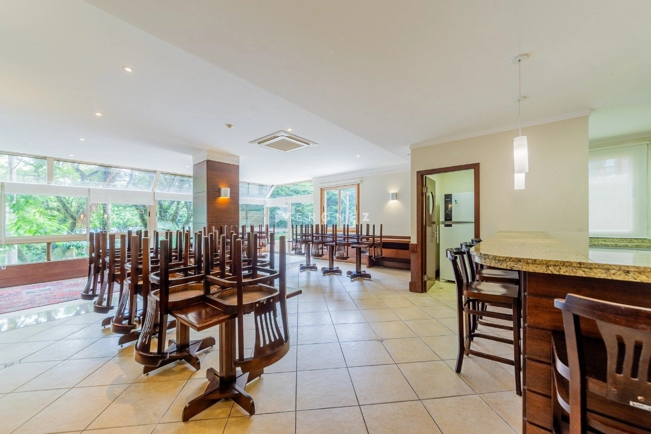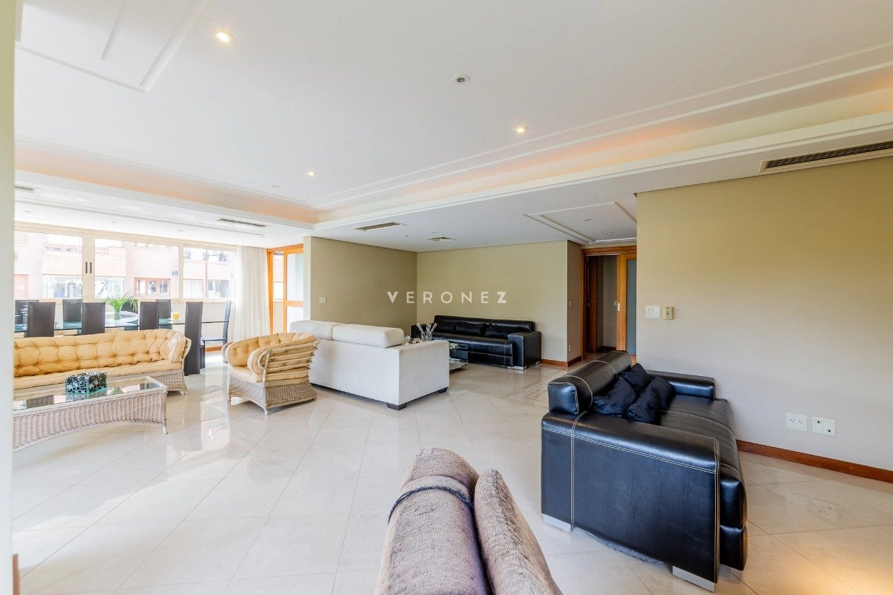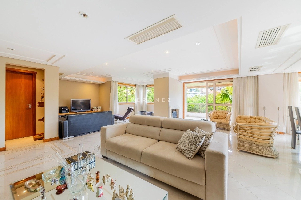 Apartamento semi mobiliado de 220 m², 3 suítes, sendo 1 master com hidromassagem, living para 4 ambientes, lareira, lavabo, área gourmet com churrasqueira, copa-cozinha, área de serviço separada, dependência de empregada, despensa e 4 vagas de garagem. O apartamento conta ainda com ar central e a posição solar privilegiada.