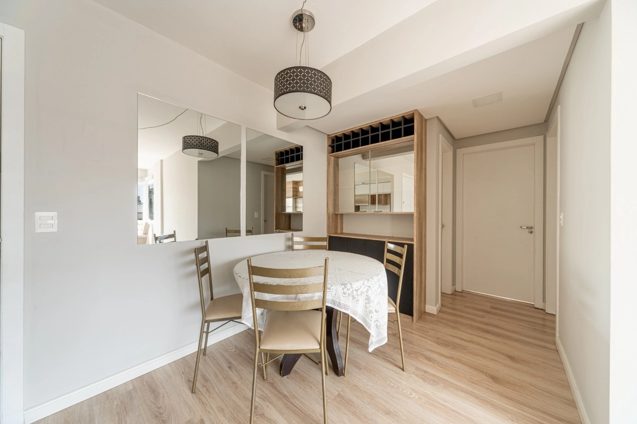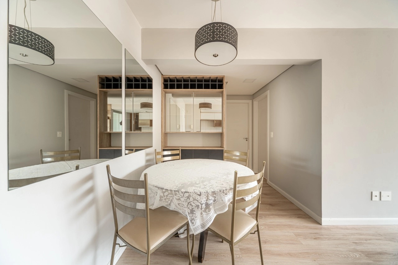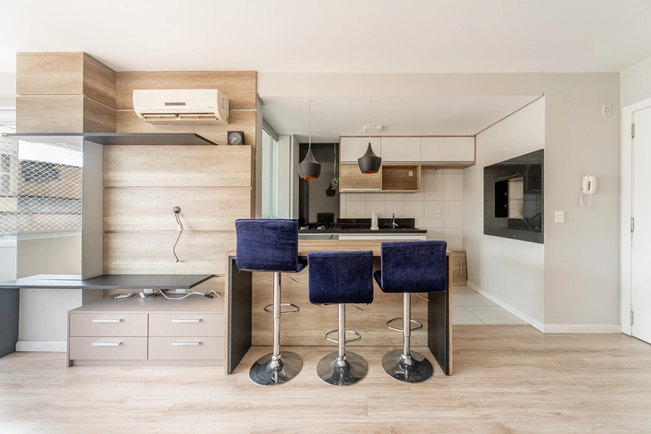 Ficam todos os móveis planejados e alguns móveis avulsos como a mesa de jantar, e os splits.