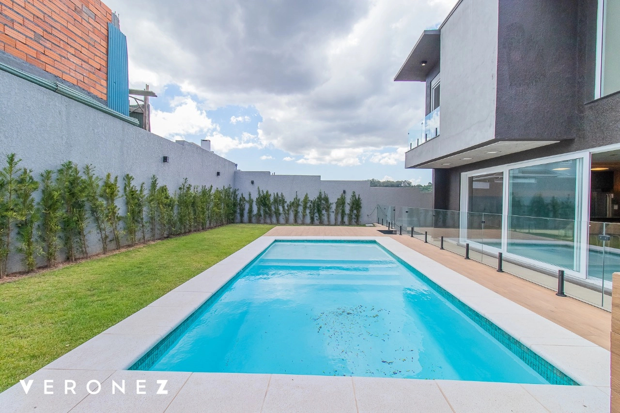 Amplas aberturas que integram ao exterior, com o pátio, ao deck e à piscina de concreto com 8m de comprimento. Uma suíte localizada no primeiro andar com opção para escritório.