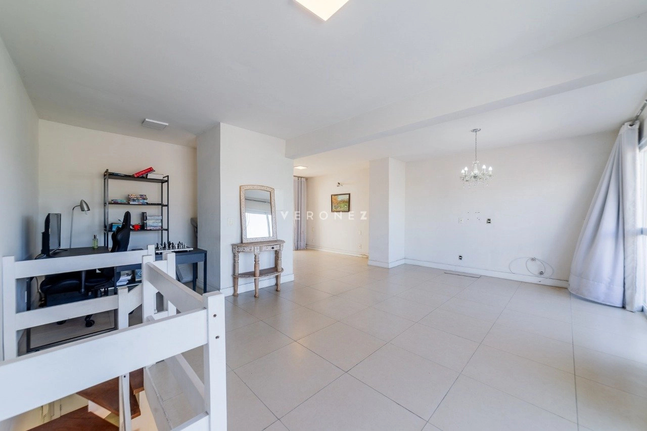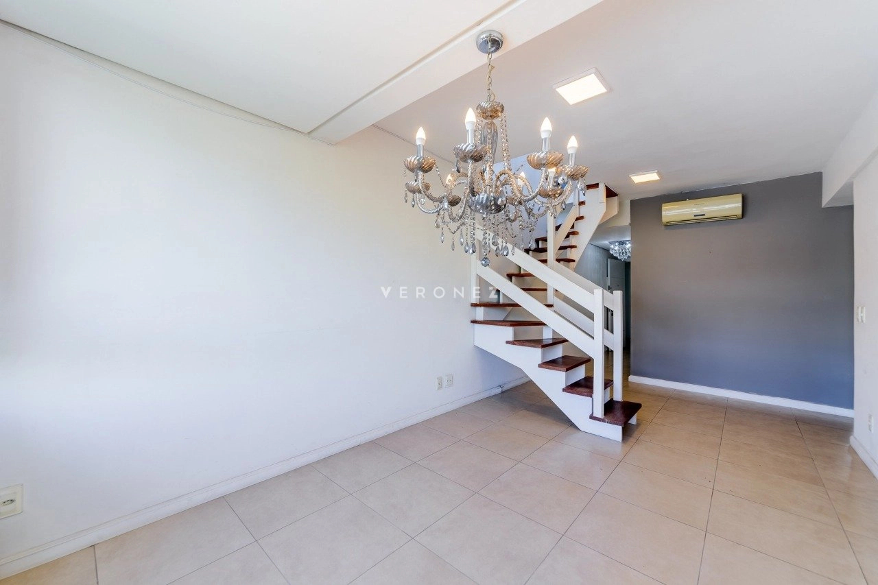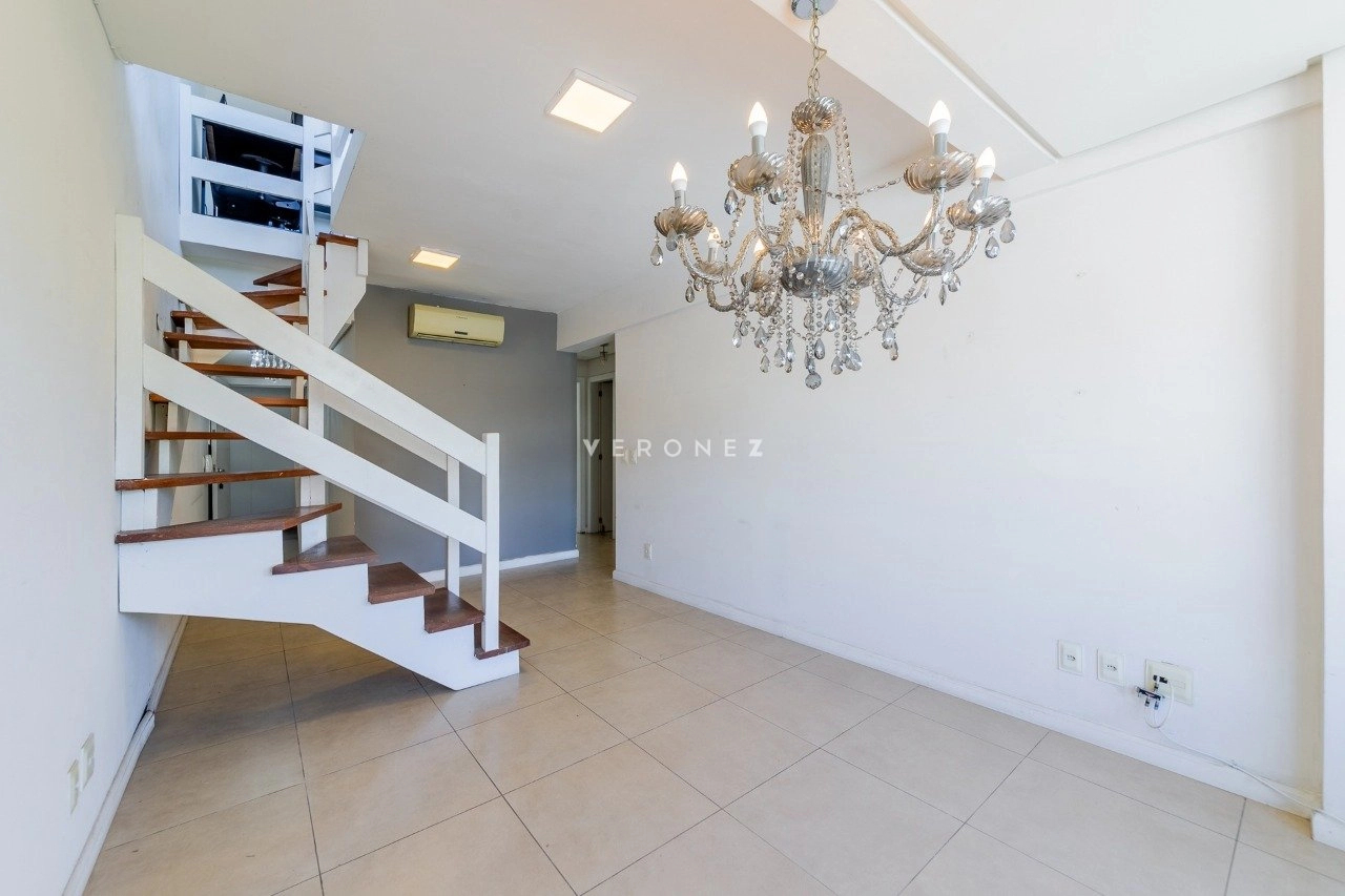 O imóvel está desocupado e distribuído em dois pavimentos. No primeiro andar, conta com living para dois ambientes, cozinha separada e dois dormitórios, sendo uma suíte. No segundo pavimento, o espaço social ganha destaque com living amplo e integrado, possibilidade de home office, banheiro social e área de serviço, além do acesso ao terraço.