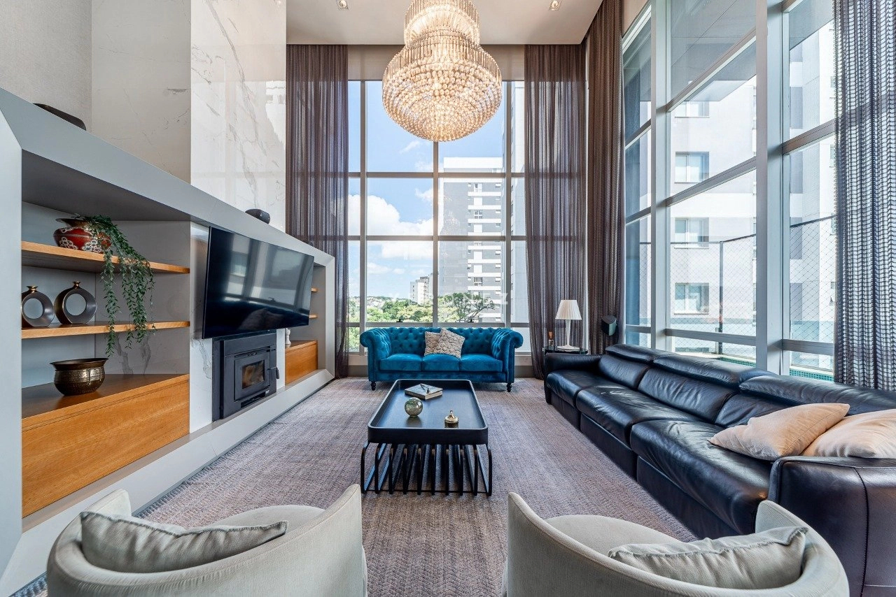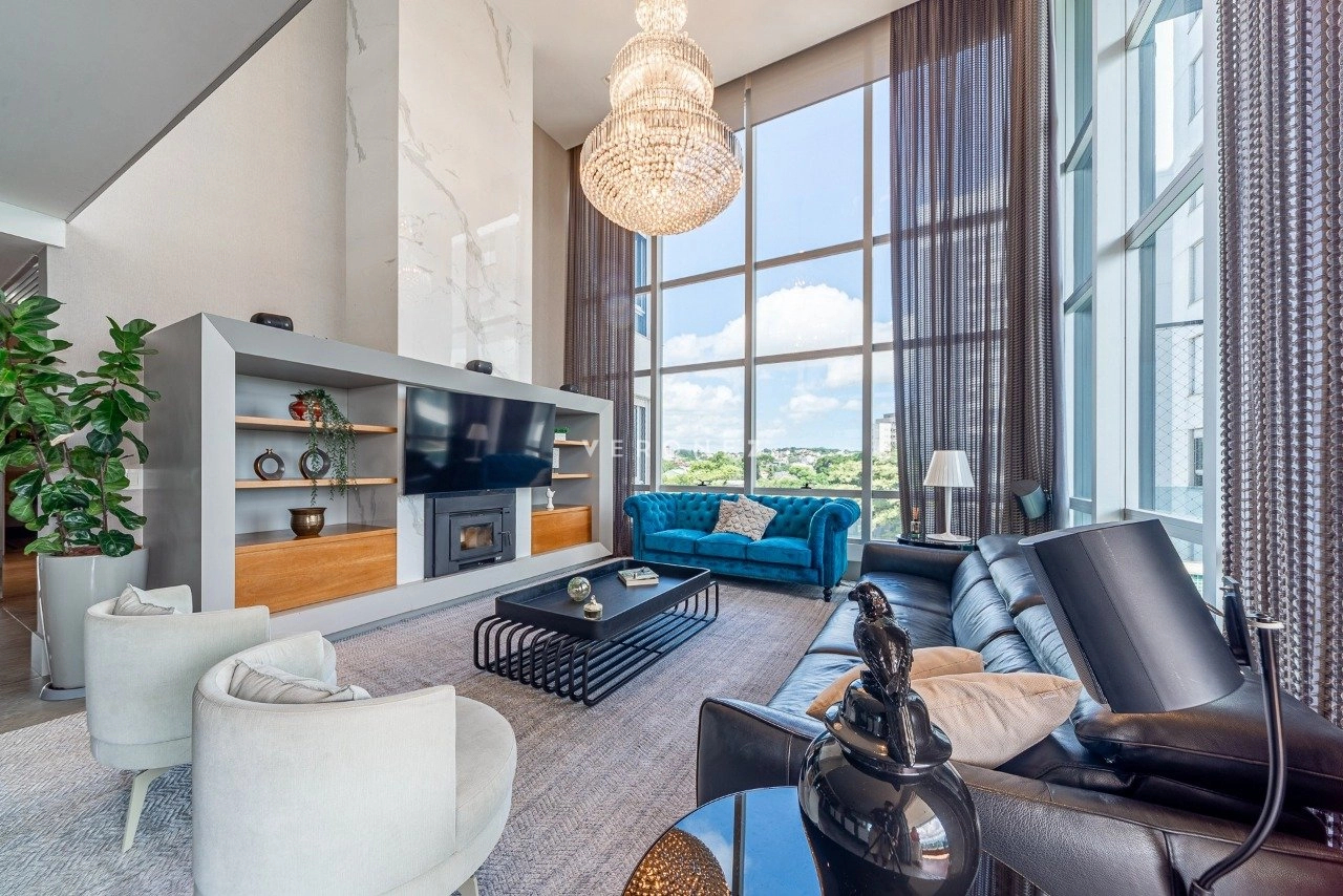 Amplo living com dois ambientes mais espaço gourmet com churrasqueira e parrilla, lareira e adega La Cava. Lavabo e uma bela sacada com piscina aquecida e vista panorâmica para o Parque Germânia.