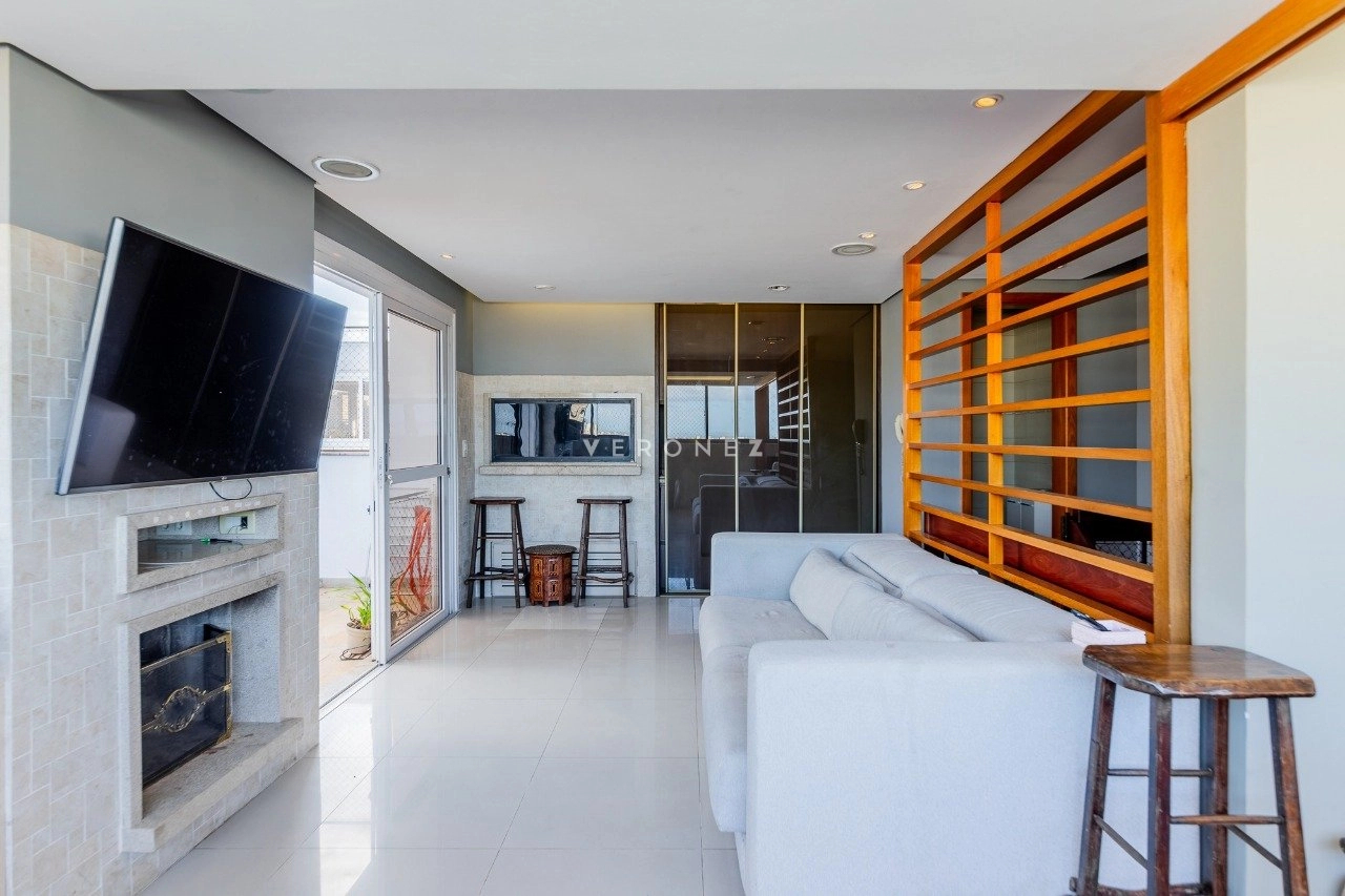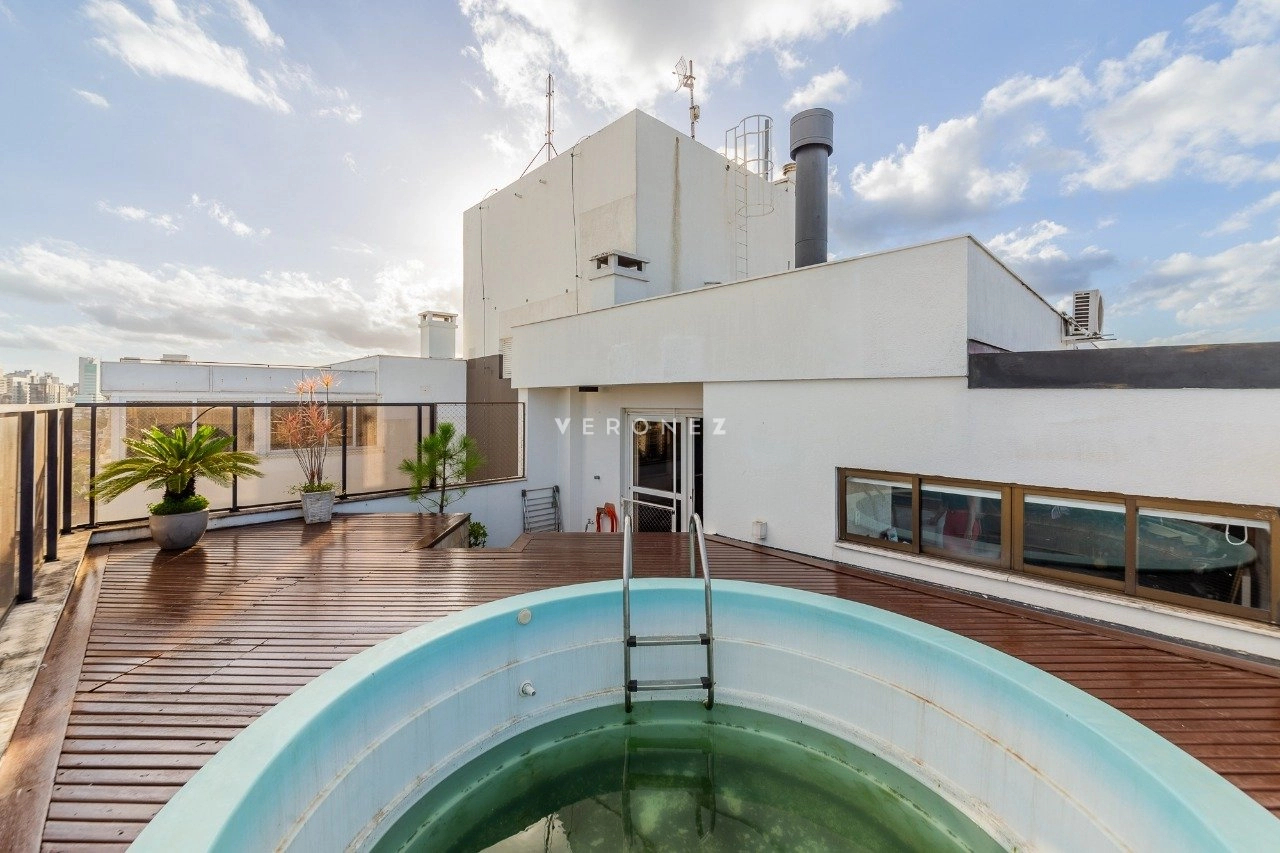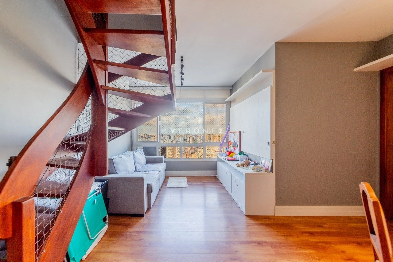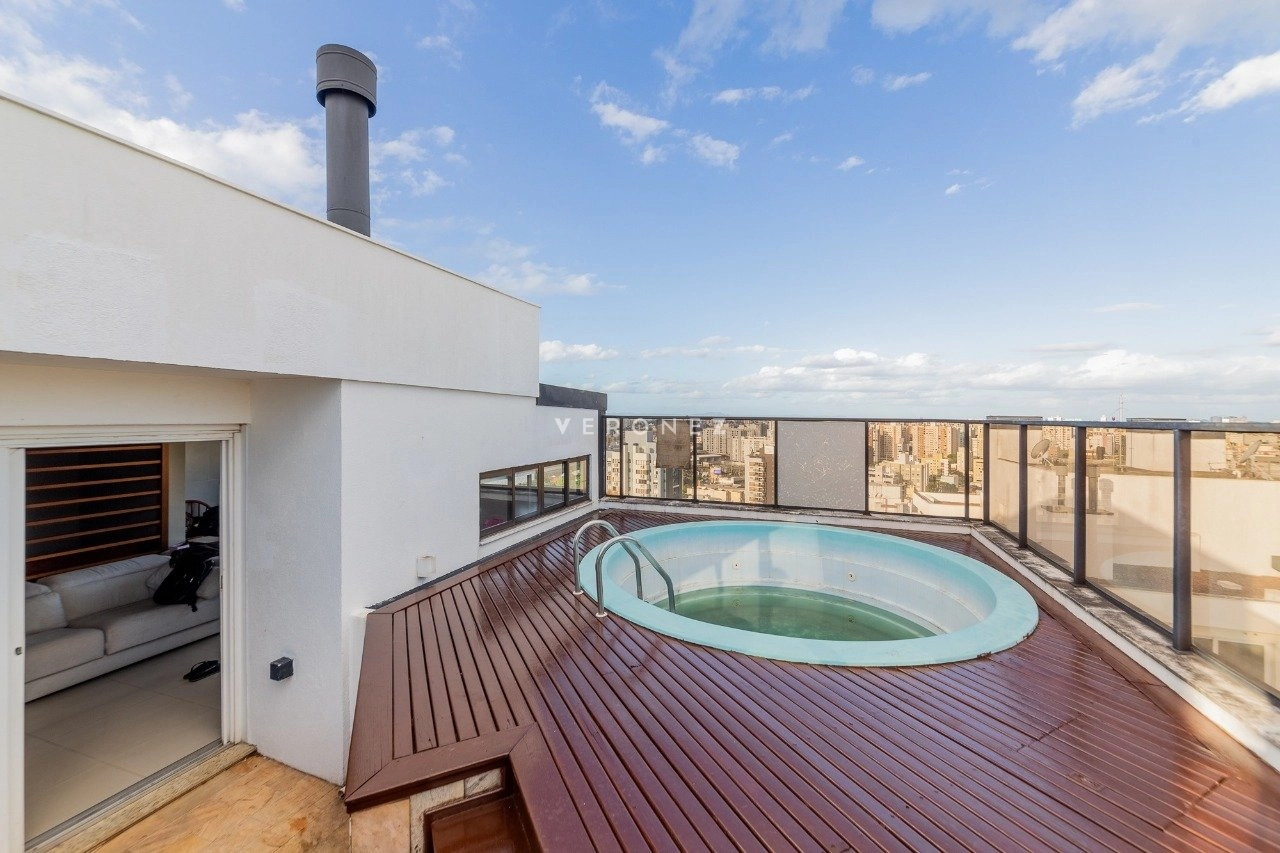 Cobertura com 150 m² de área privativa, semi mobilada. No andar superior, living amplo, churrasqueira, lareira, lavabo e piscina. No andar inferior, sala com cozinha americana, área de serviço separada, 2 dormitórios, sendo 1 suíte e banheiro social. 1 vaga de garagem coberta.