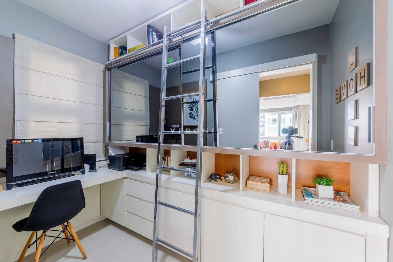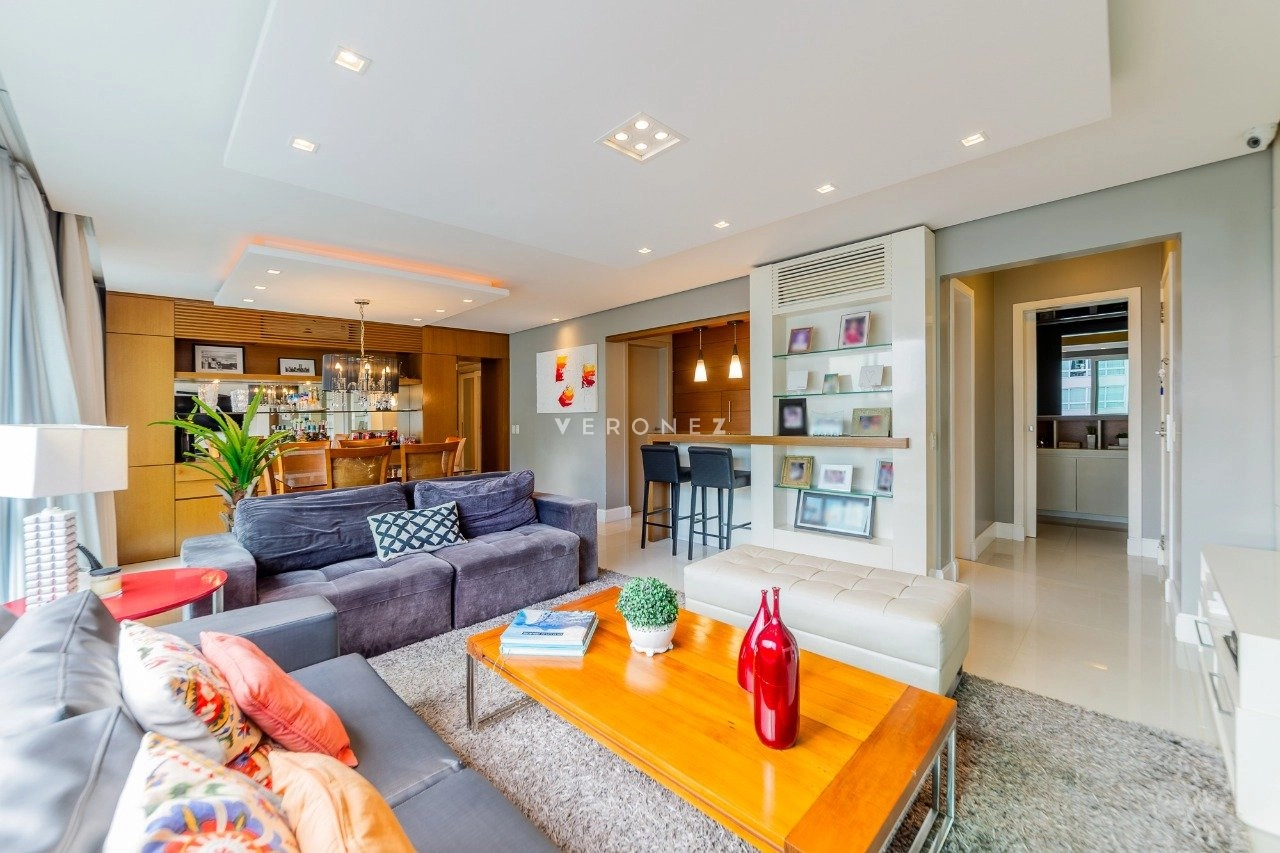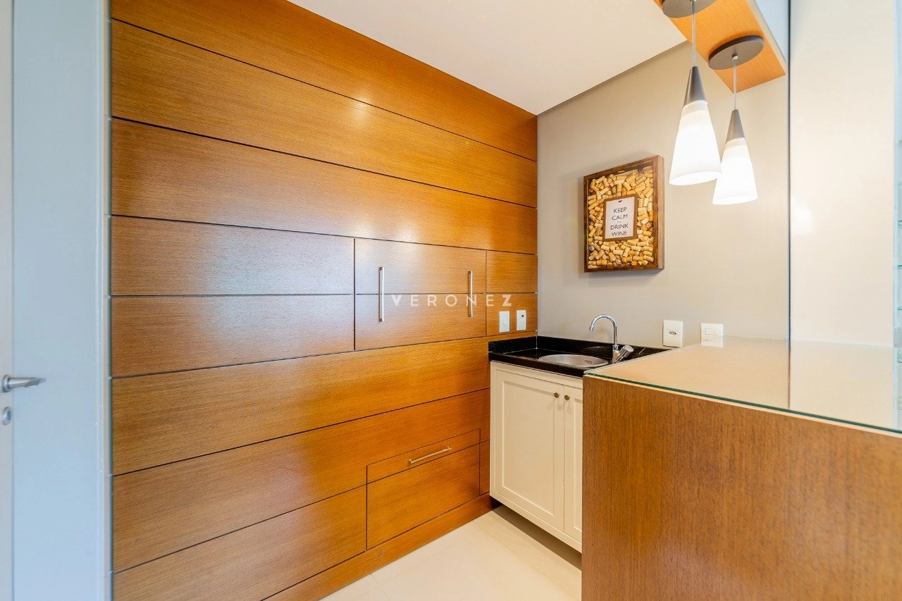 Será vendido mobiliado. O imóvel fica em andar alto, e é composto por uma sala de jantar e estar integradas, escritório, churrasqueira, lareira, lavabo, cozinha e área de serviço separada. Além das 3 suítes, é claro.