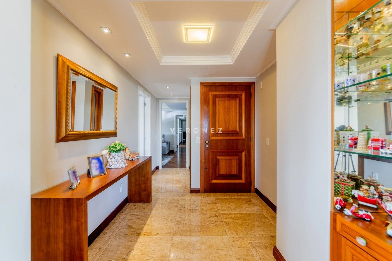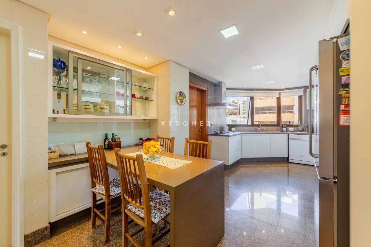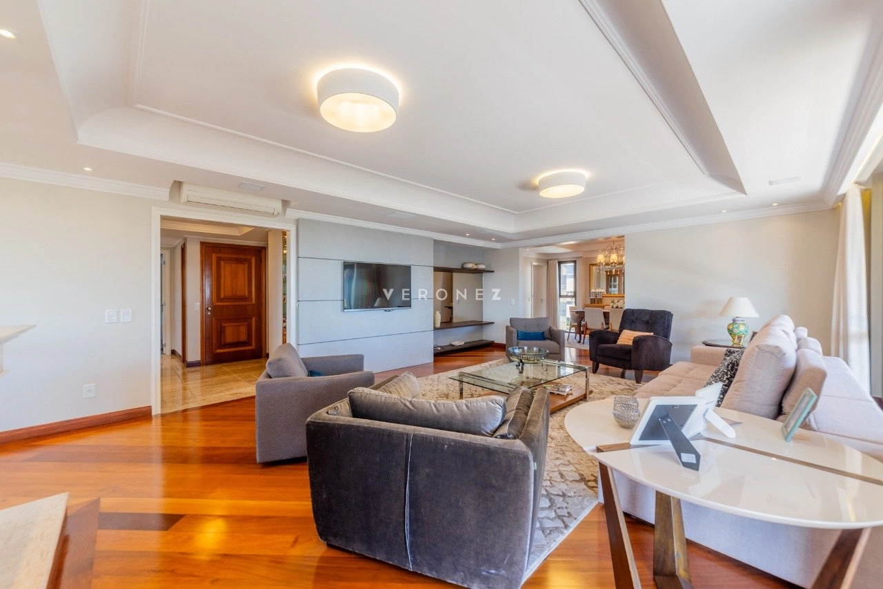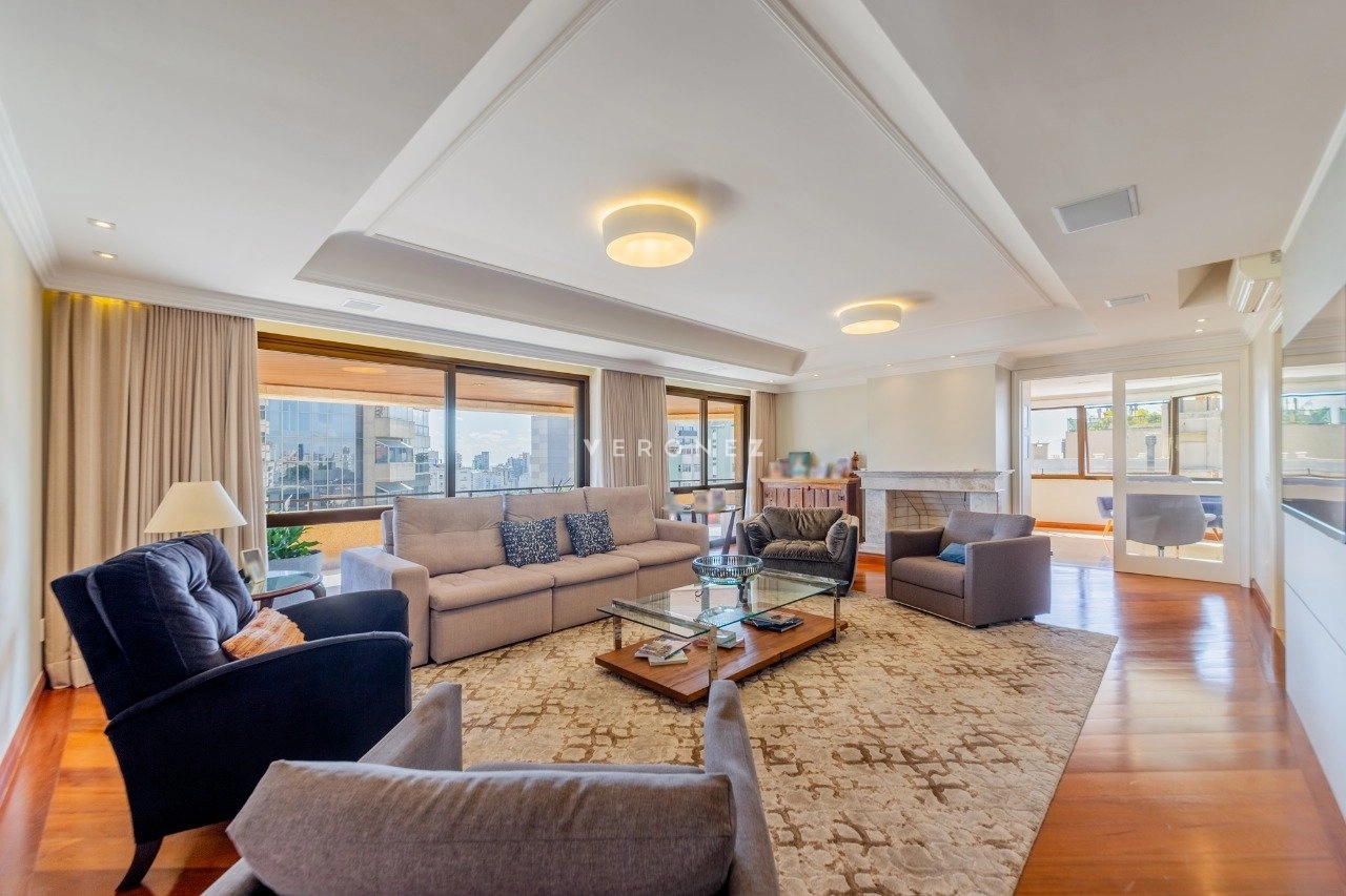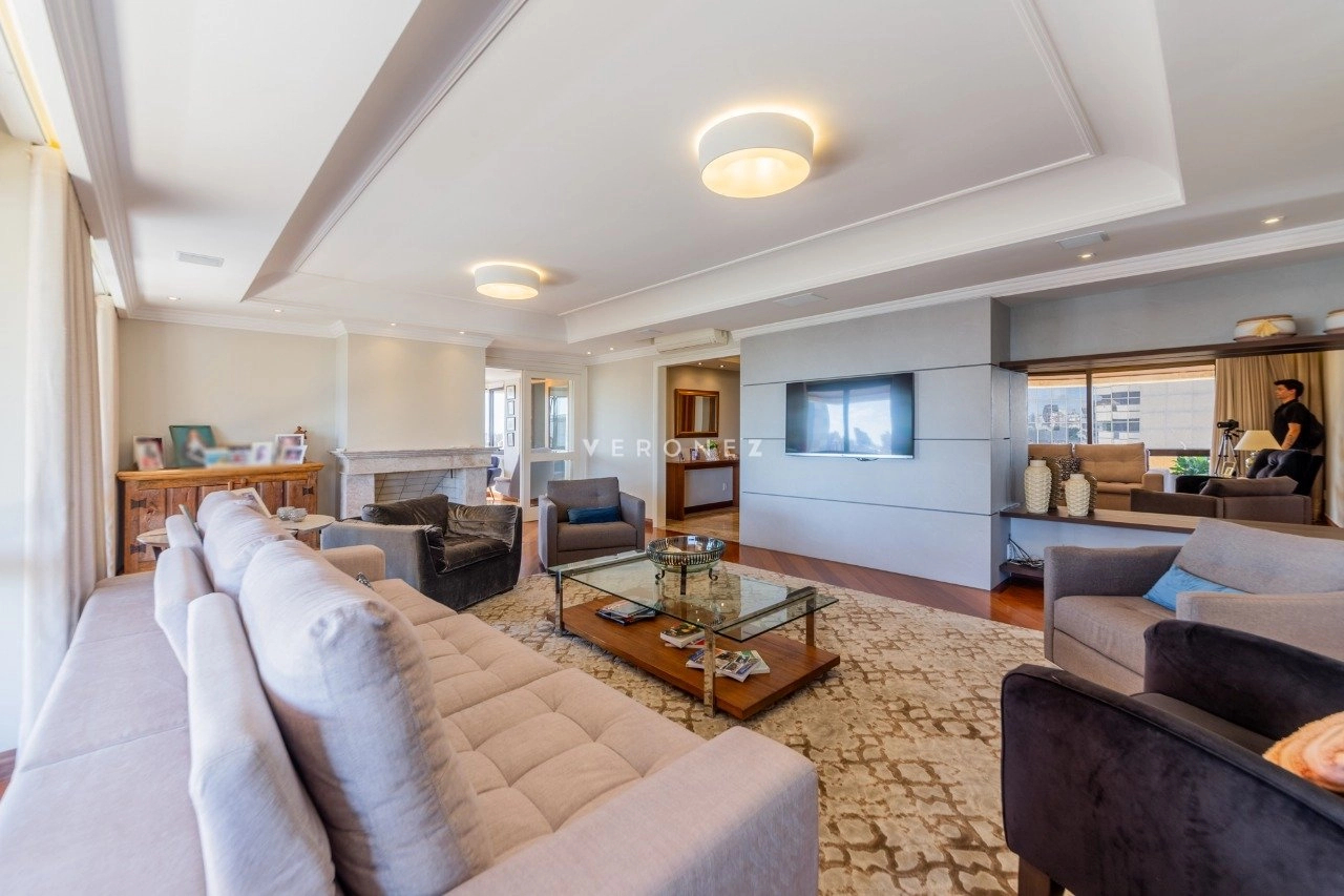 Apartamento com 374 m² privativos, mobiliado, 1 por andar, hall privativo, sala de estar e de jantar independentes, com lareira, lavabo, ampla varanda, espaço gourmet com churrasqueira, com acesso direito à varanda. Copa cozinha com um enorme espaço para panelas, lavanderia separada e dependência completa.