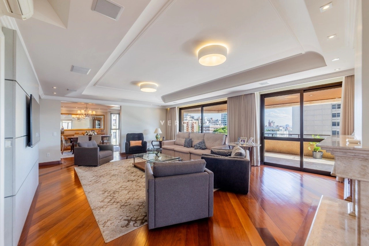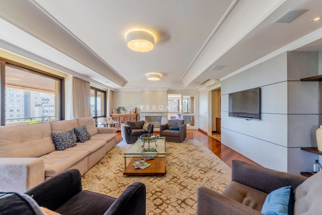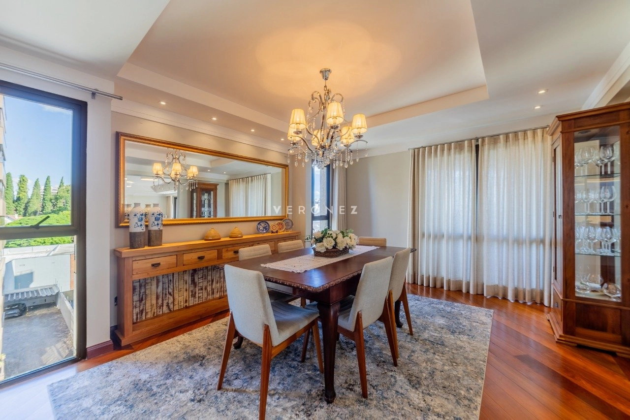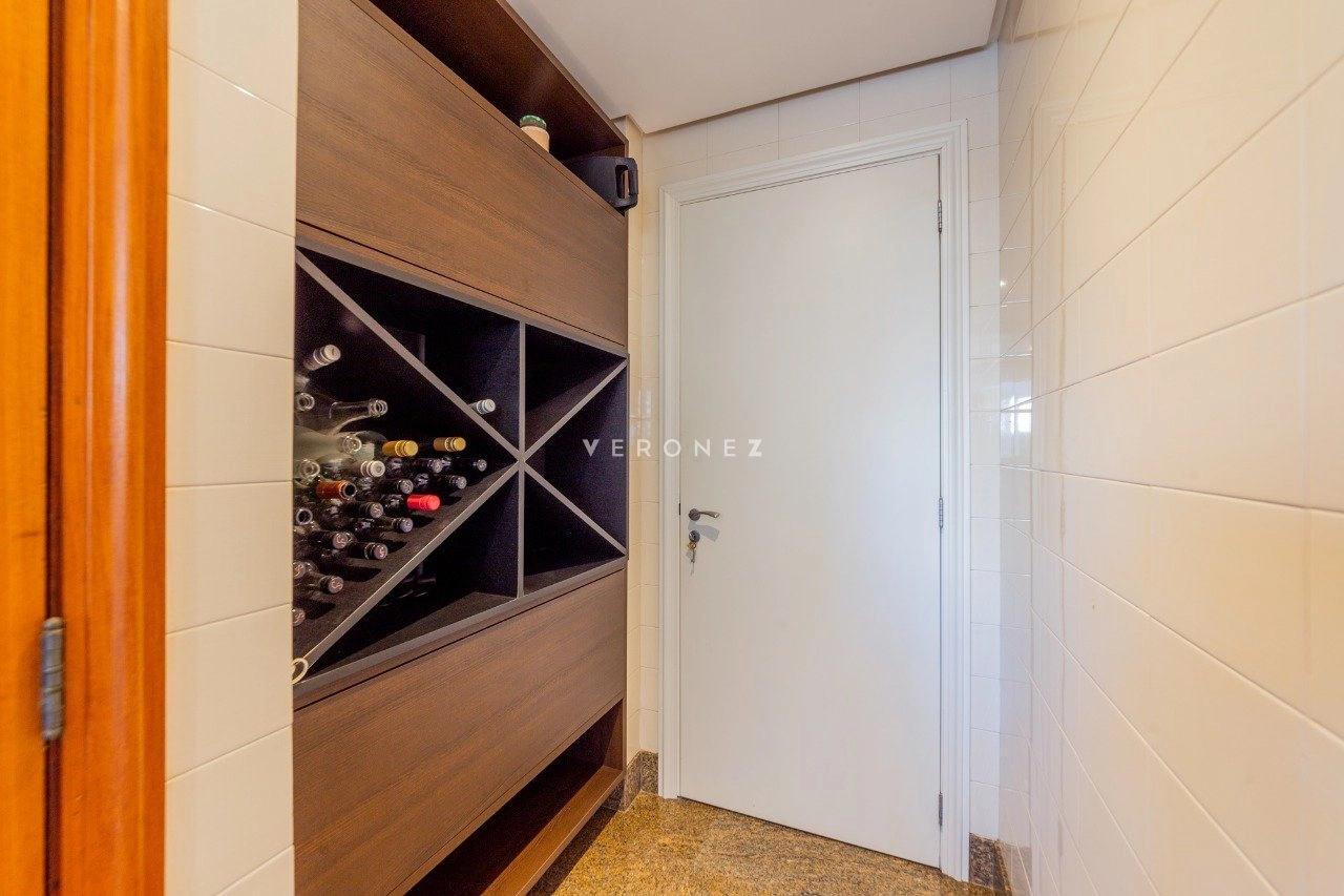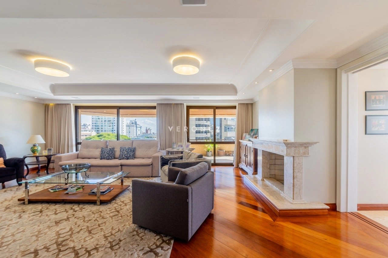 Apartamento com 374 m² privativos, mobiliado, 1 por andar, hall privativo, sala de estar e de jantar independentes, com lareira, lavabo, ampla varanda, espaço gourmet com churrasqueira, com acesso direito à varanda. Copa cozinha com um enorme espaço para panelas, lavanderia separada e dependência completa.