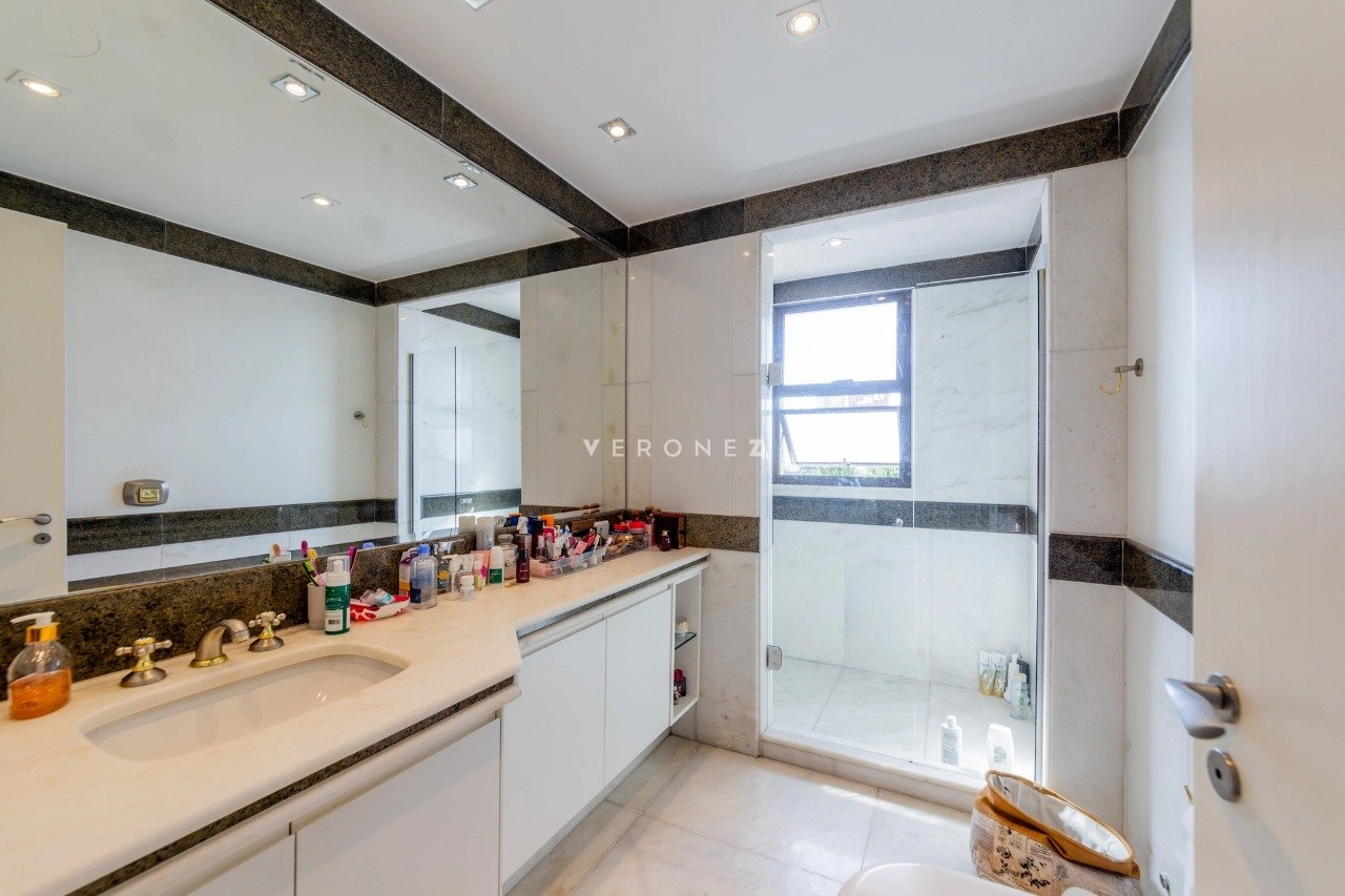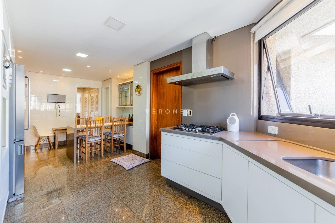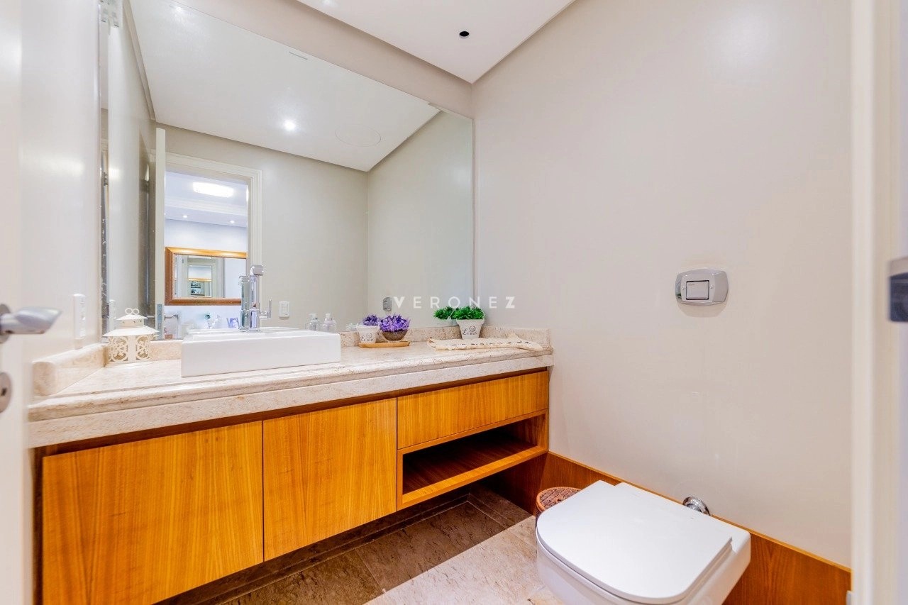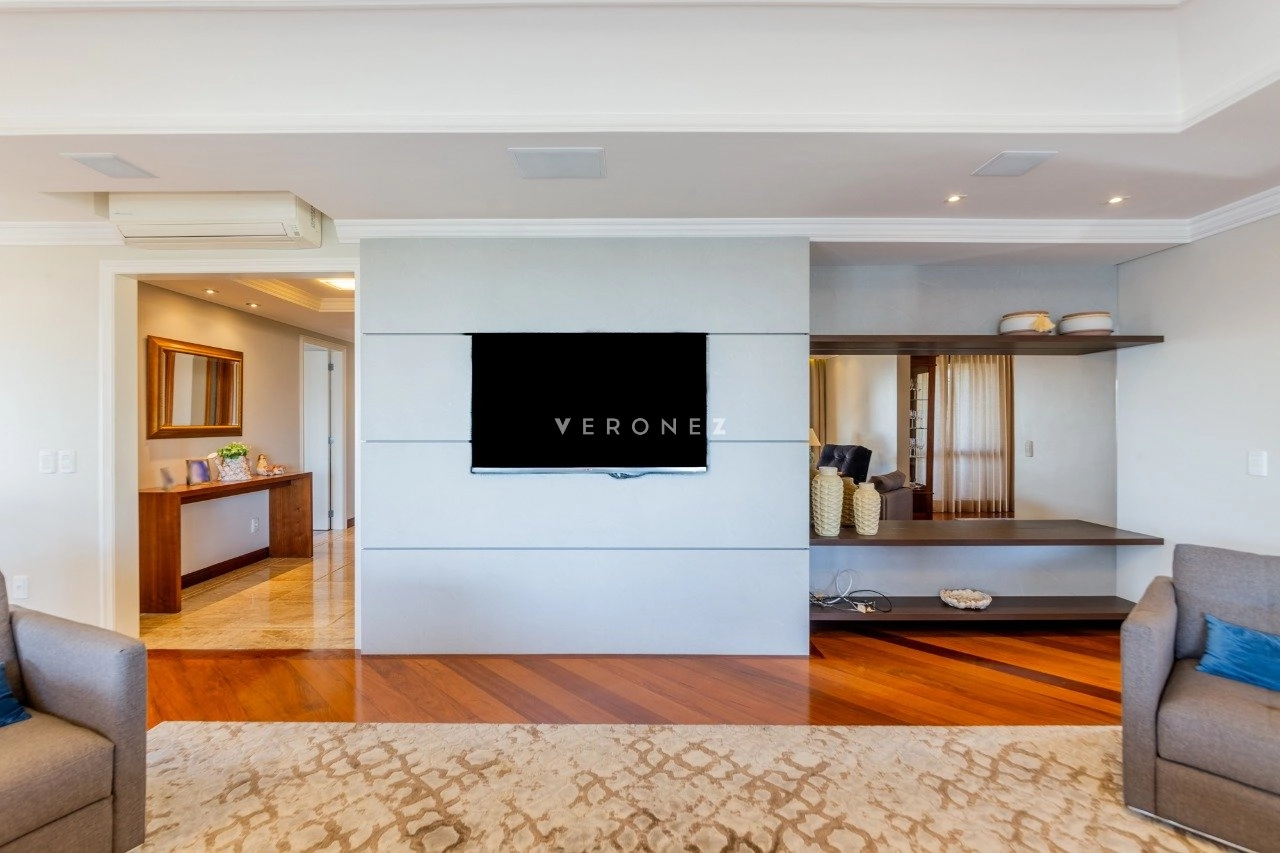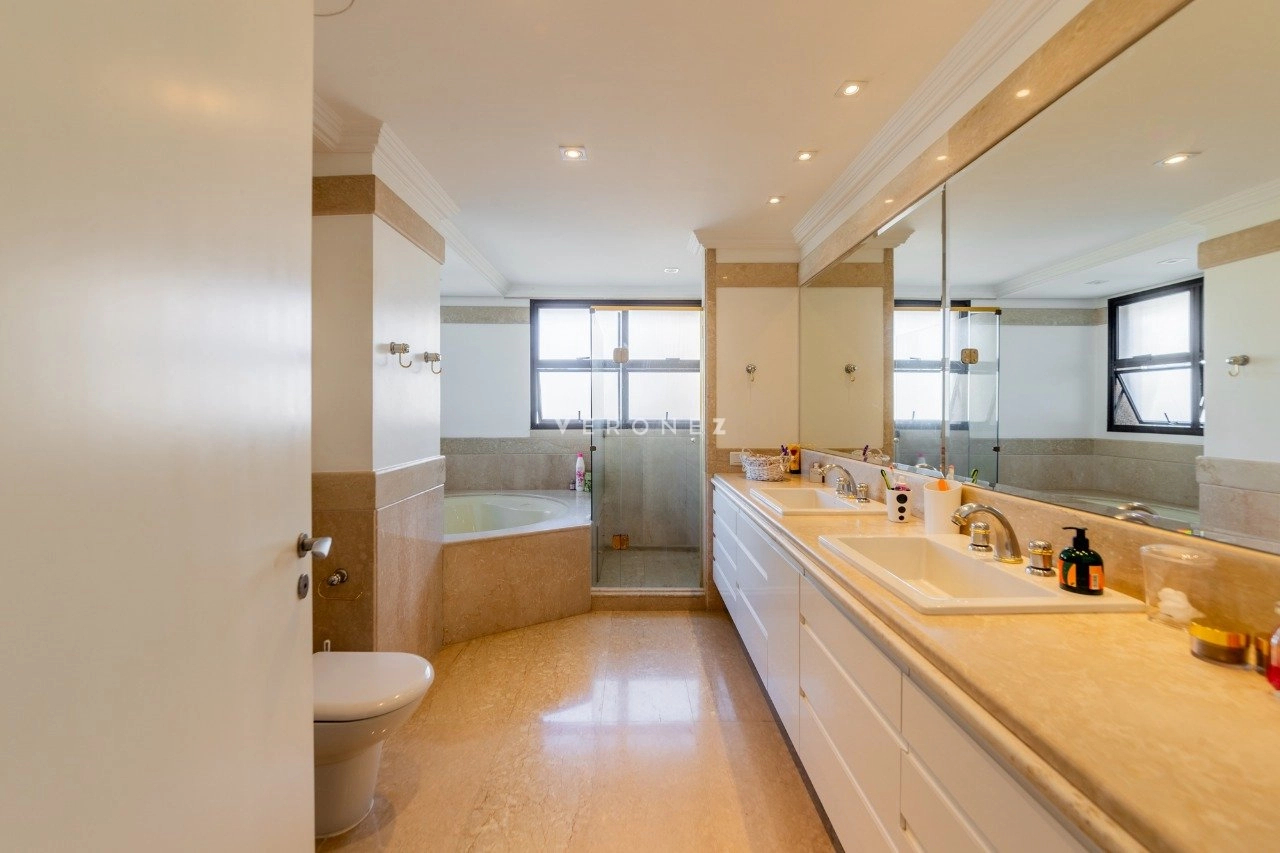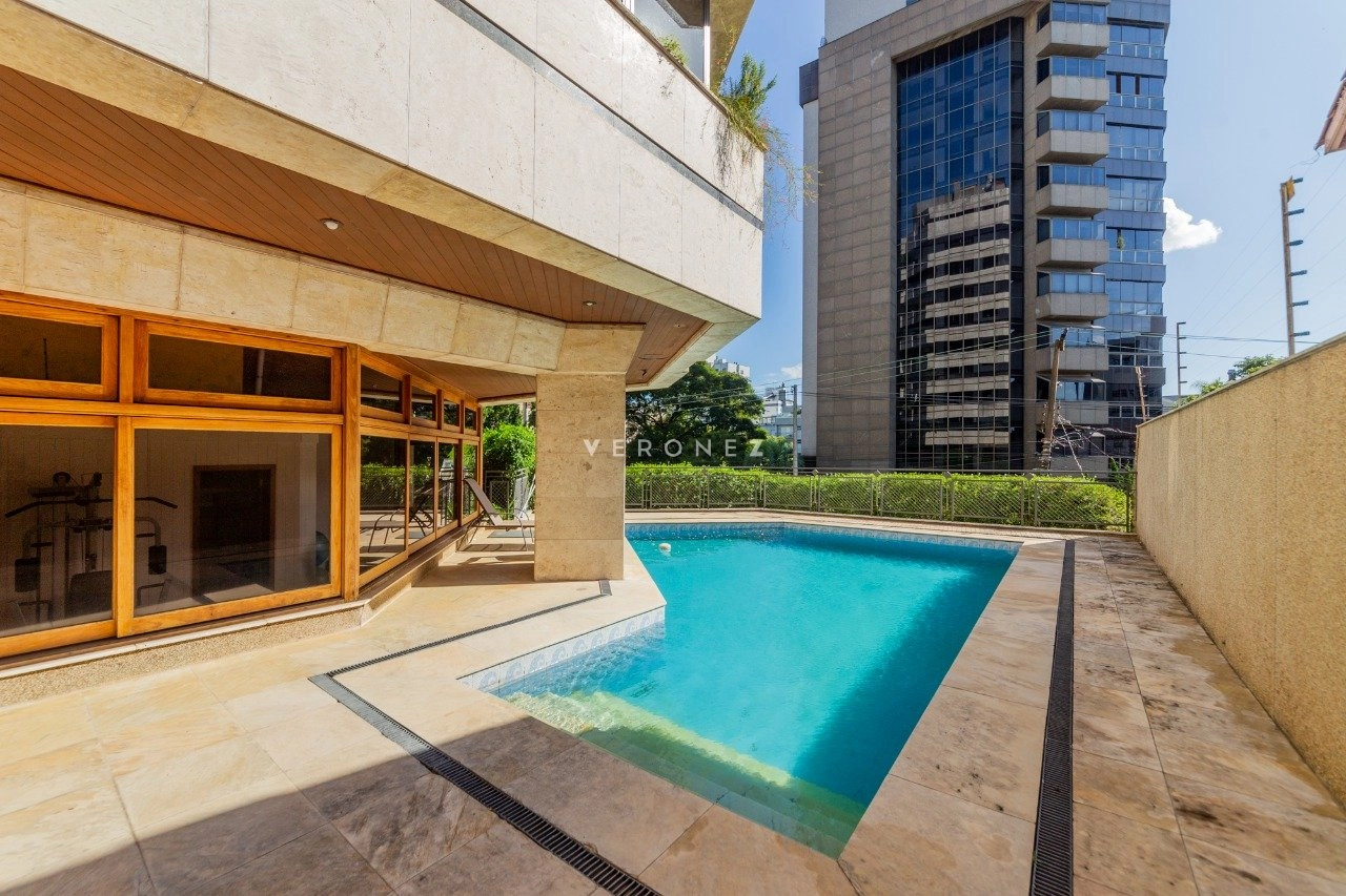 Apartamento com 374 m² privativos, mobiliado, 1 por andar, hall privativo, sala de estar e de jantar independentes, com lareira, lavabo, ampla varanda, espaço gourmet com churrasqueira, com acesso direito à varanda. Copa cozinha com um enorme espaço para panelas, lavanderia separada e dependência completa.