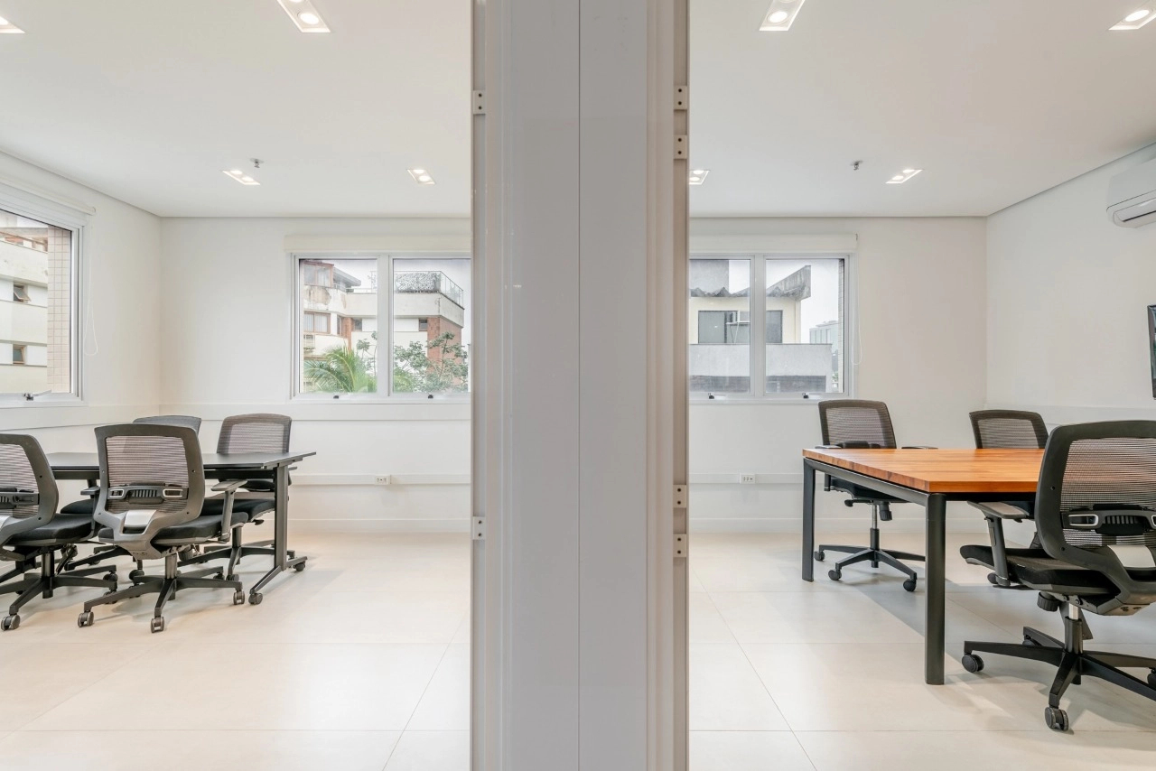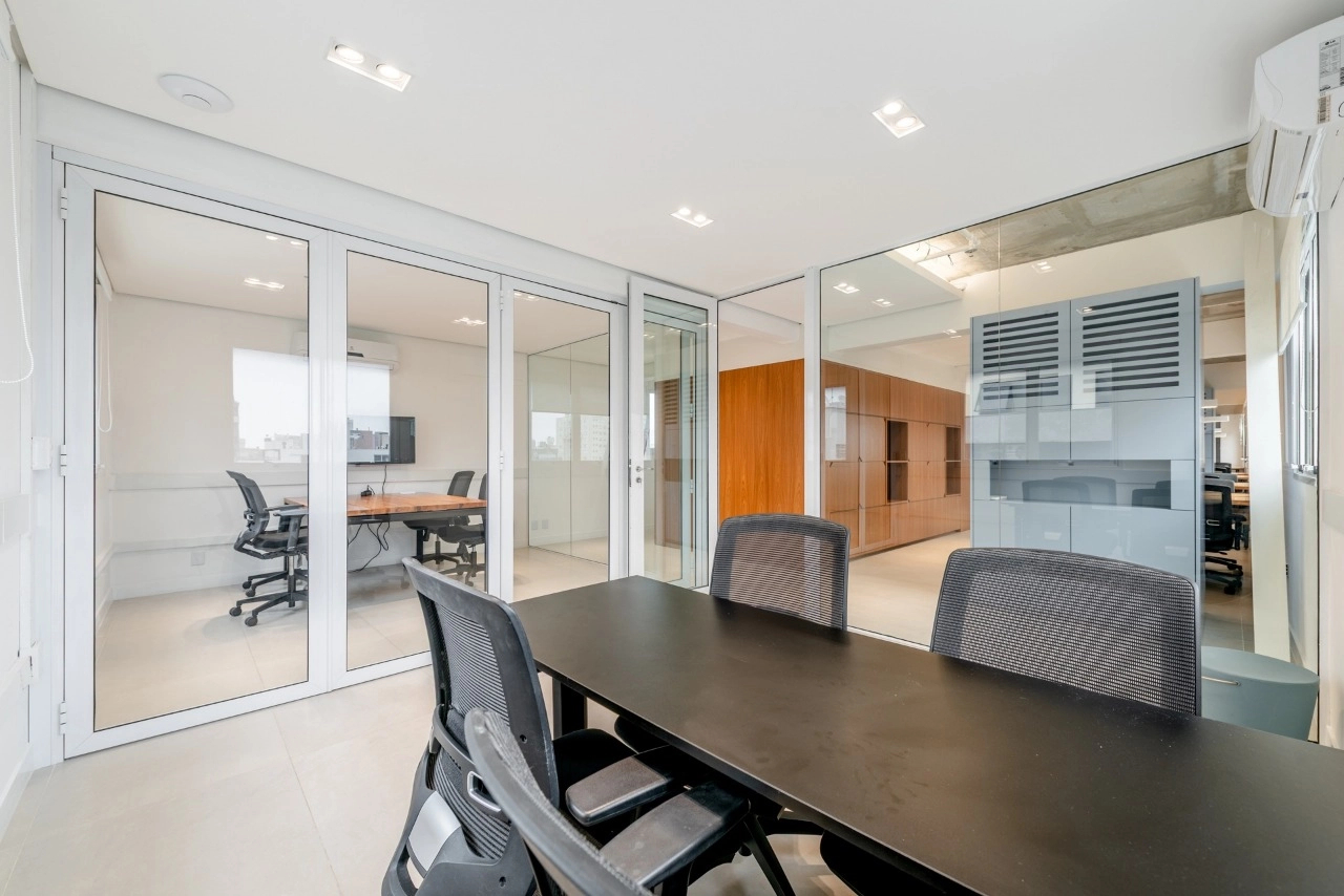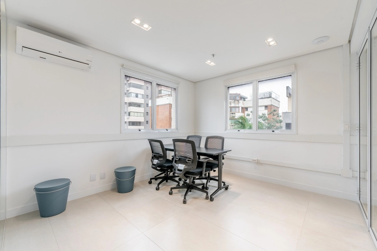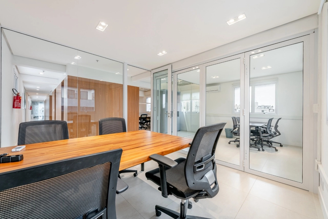 A sala dispõe de excelente iluminação natural e conta com 6 conjuntos de mesas e cadeiras de trabalho. Além disso, possui 2 salas fechadas ao fundo, ideais para reuniões, garantindo total privacidade.