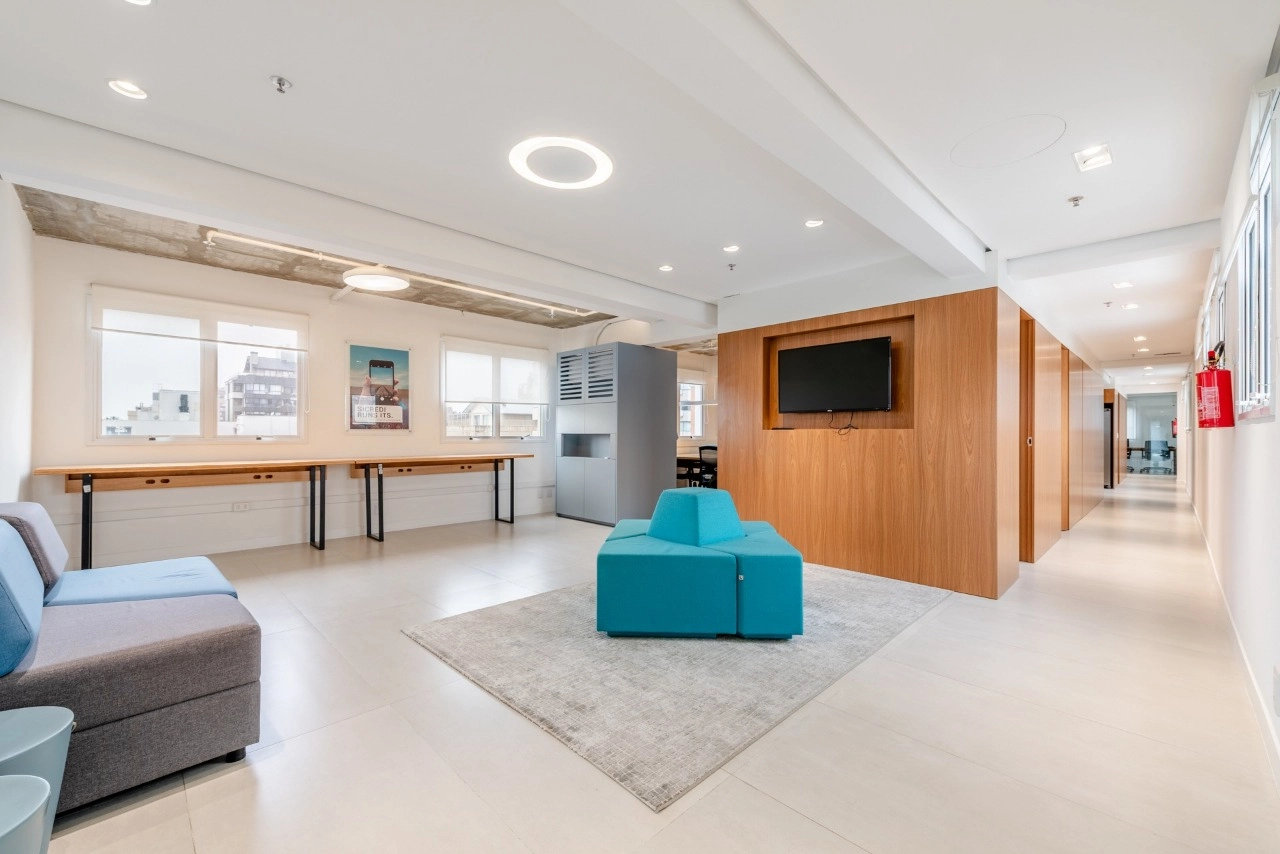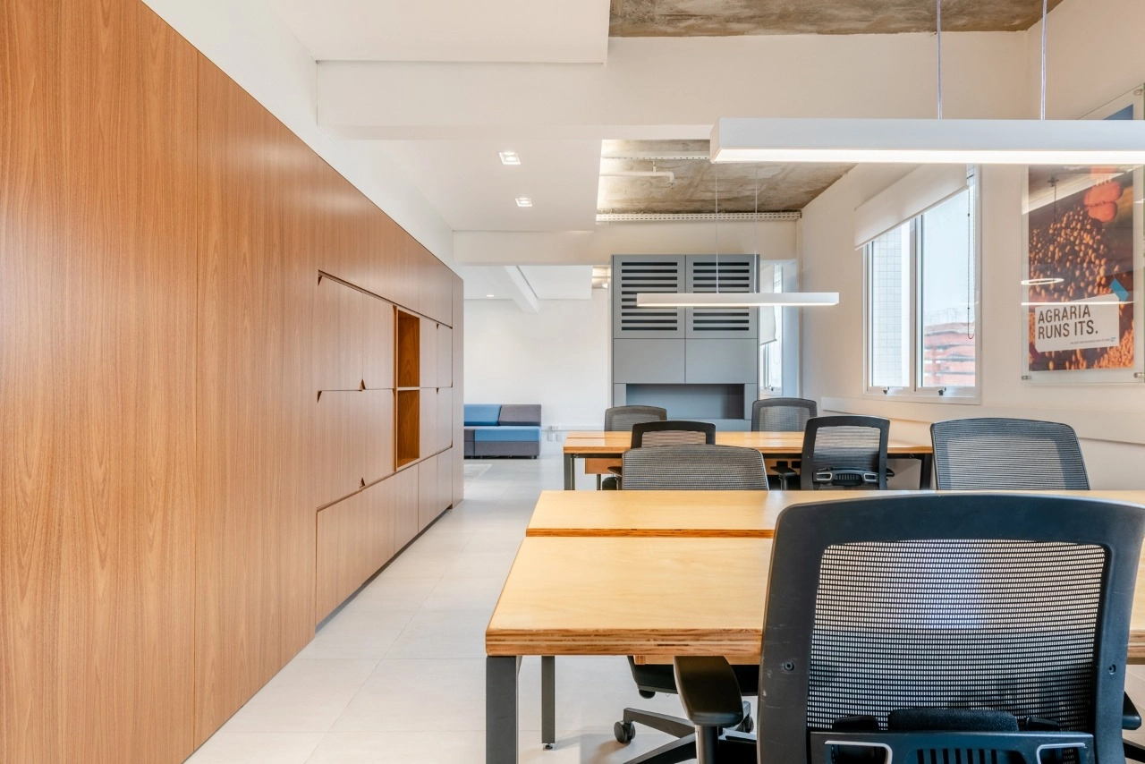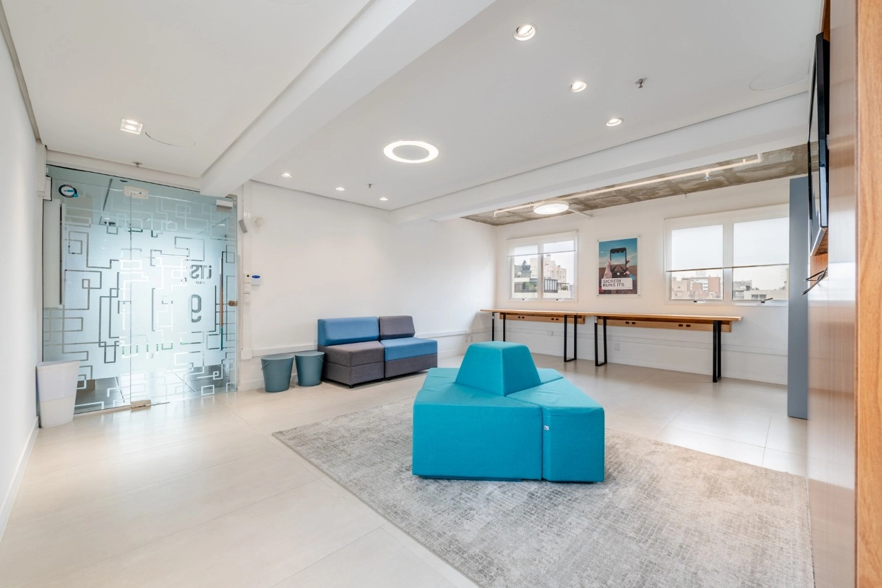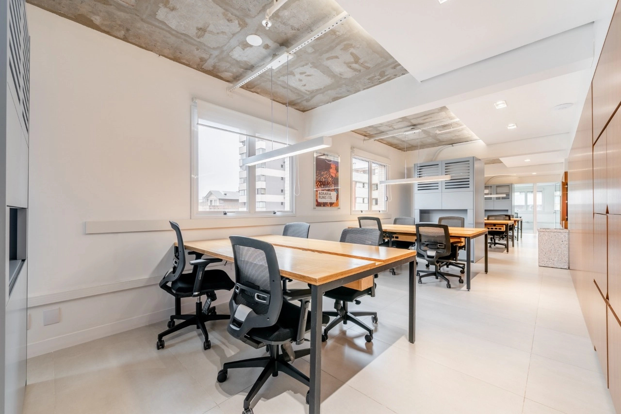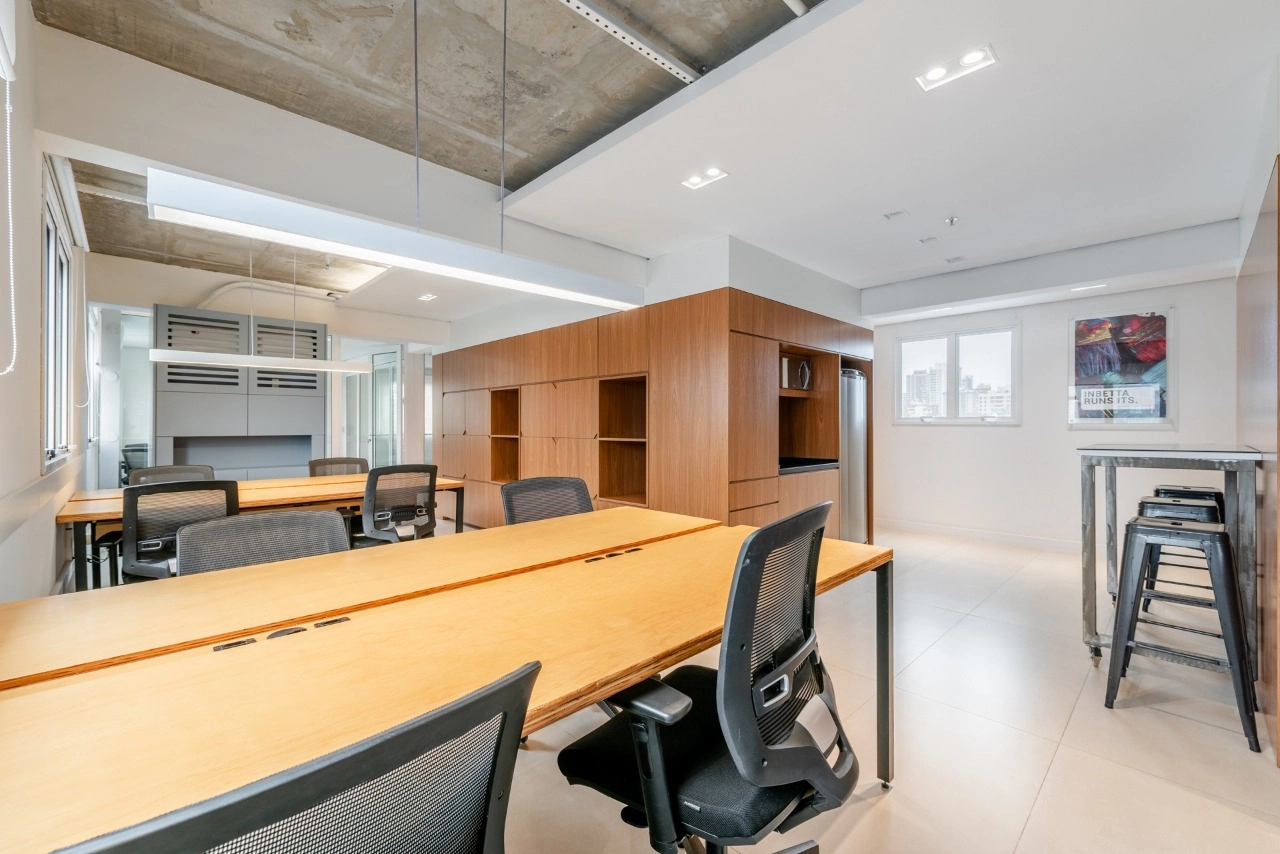 A sala dispõe de excelente iluminação natural e conta com 6 conjuntos de mesas e cadeiras de trabalho. Além disso, possui 2 salas fechadas ao fundo, ideais para reuniões, garantindo total privacidade.