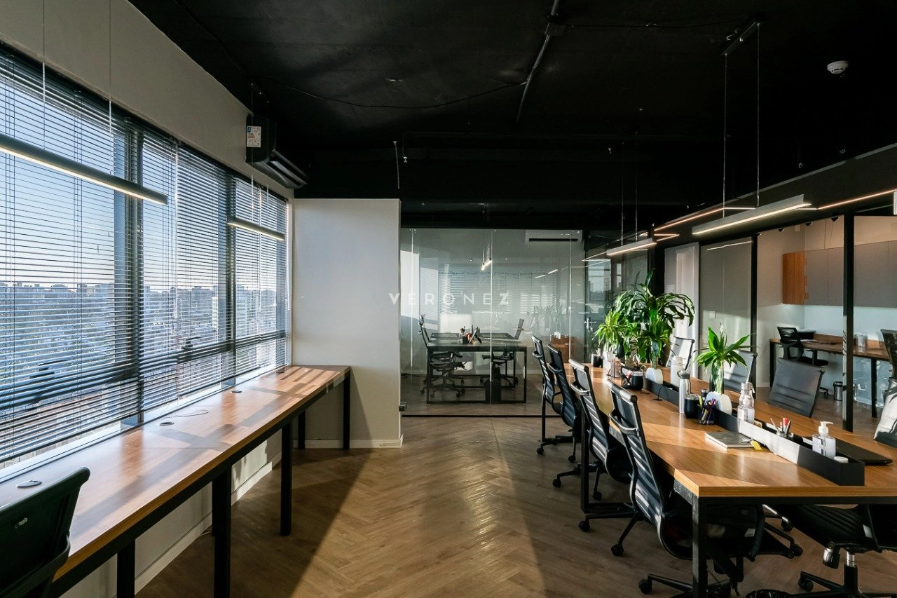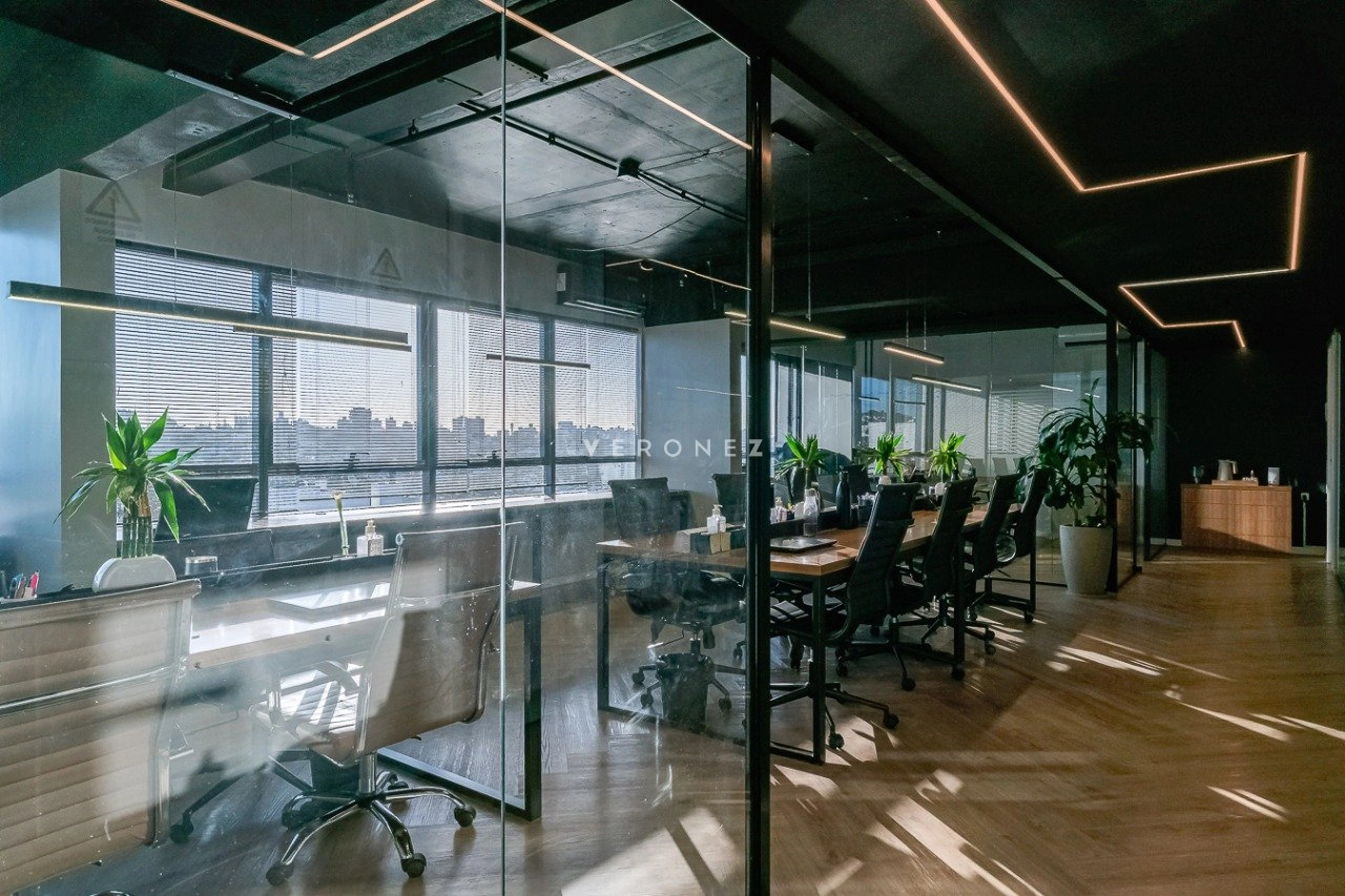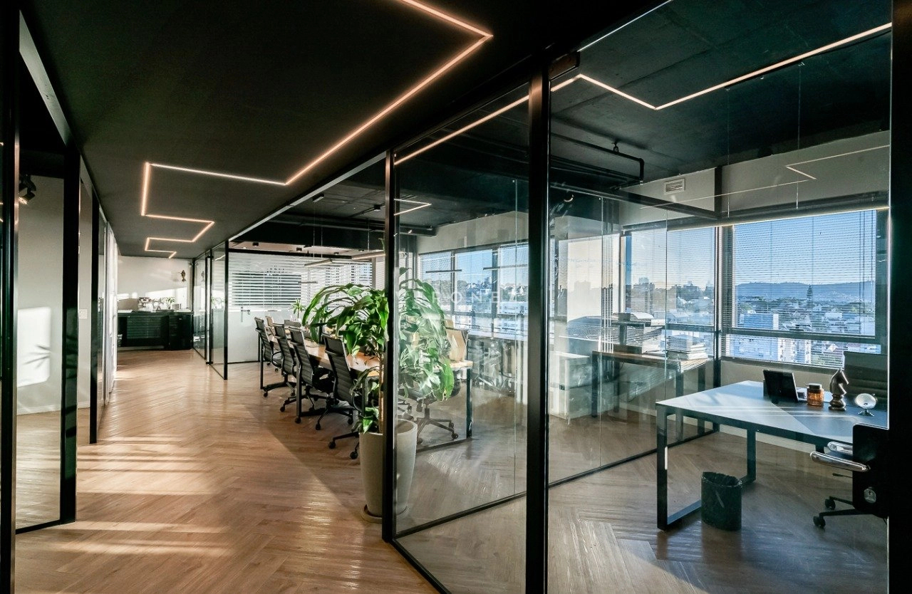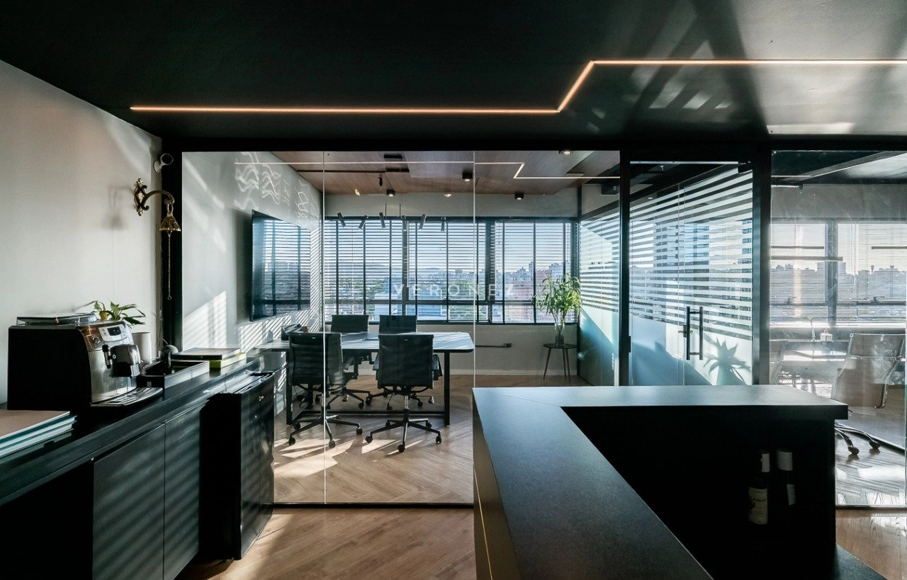 O espaço foi inteligentemente configurado com divisórias de vidro, garantindo ambientes integrados sem abrir mão da privacidade. Conta com 3 banheiros ? um deles convertido em copa/cozinha funcional ? e vem totalmente mobiliado, pronto para uso imediato.