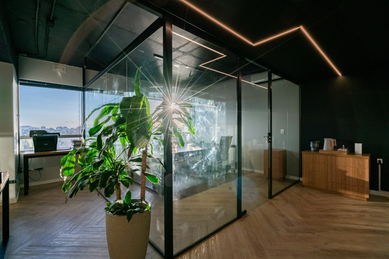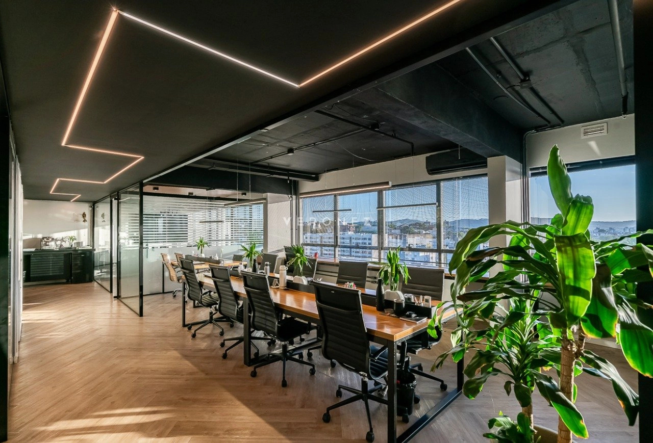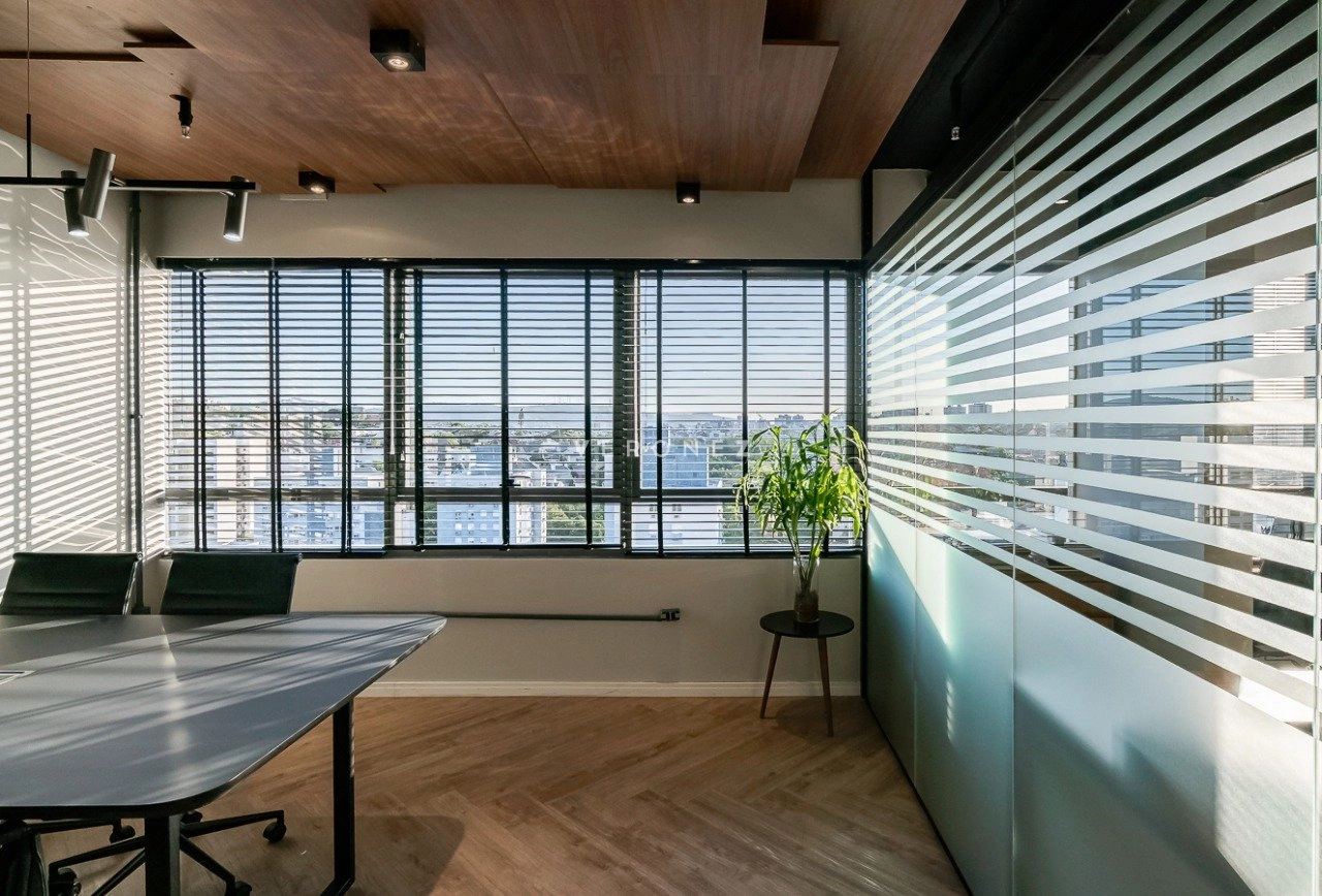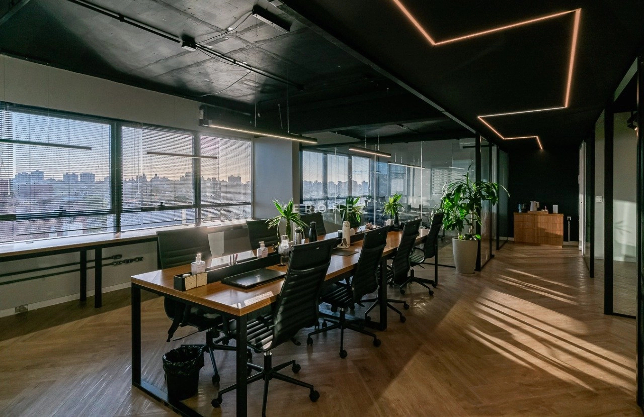 O espaço foi inteligentemente configurado com divisórias de vidro, garantindo ambientes integrados sem abrir mão da privacidade. Conta com 3 banheiros ? um deles convertido em copa/cozinha funcional ? e vem totalmente mobiliado, pronto para uso imediato.