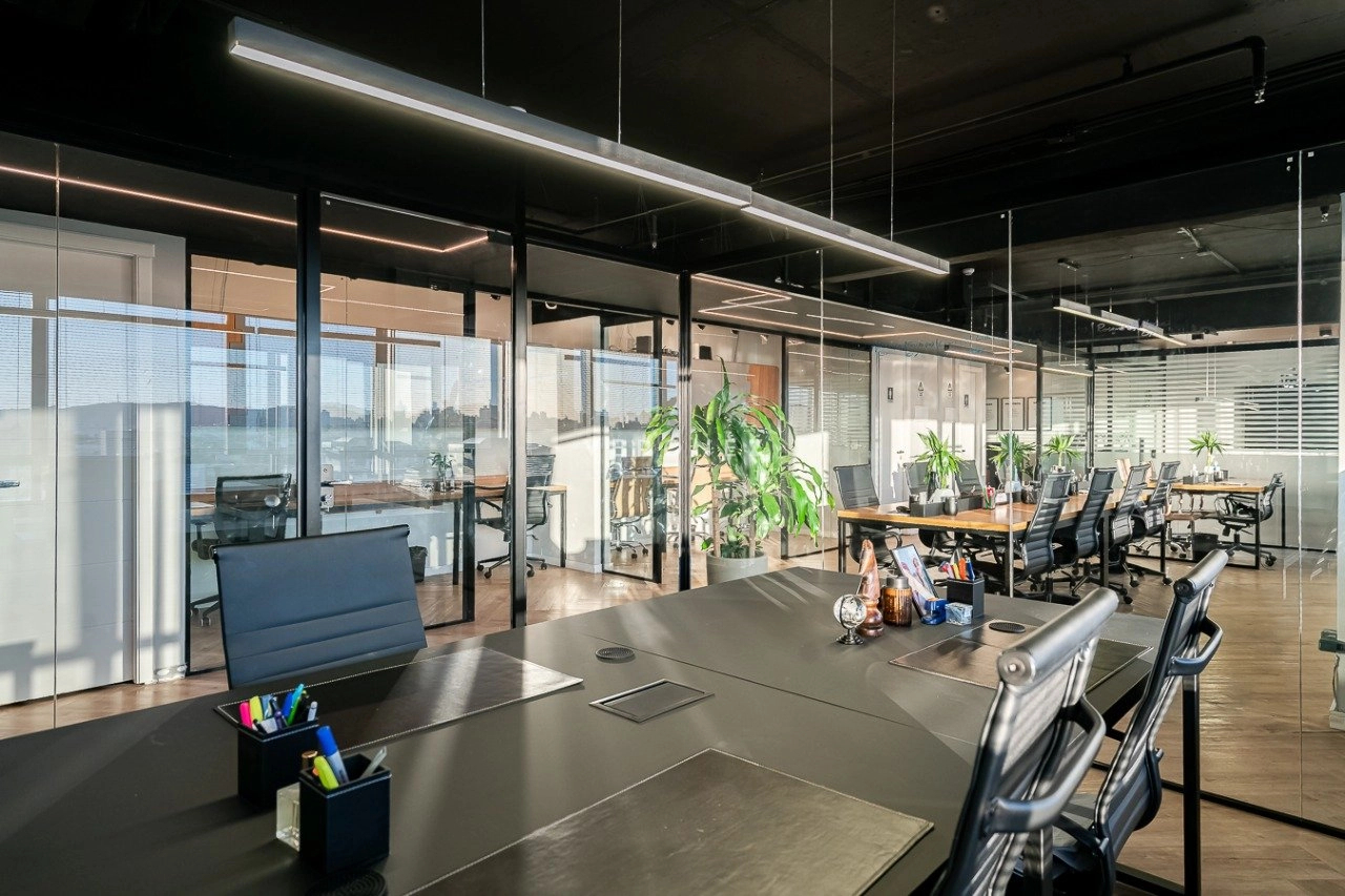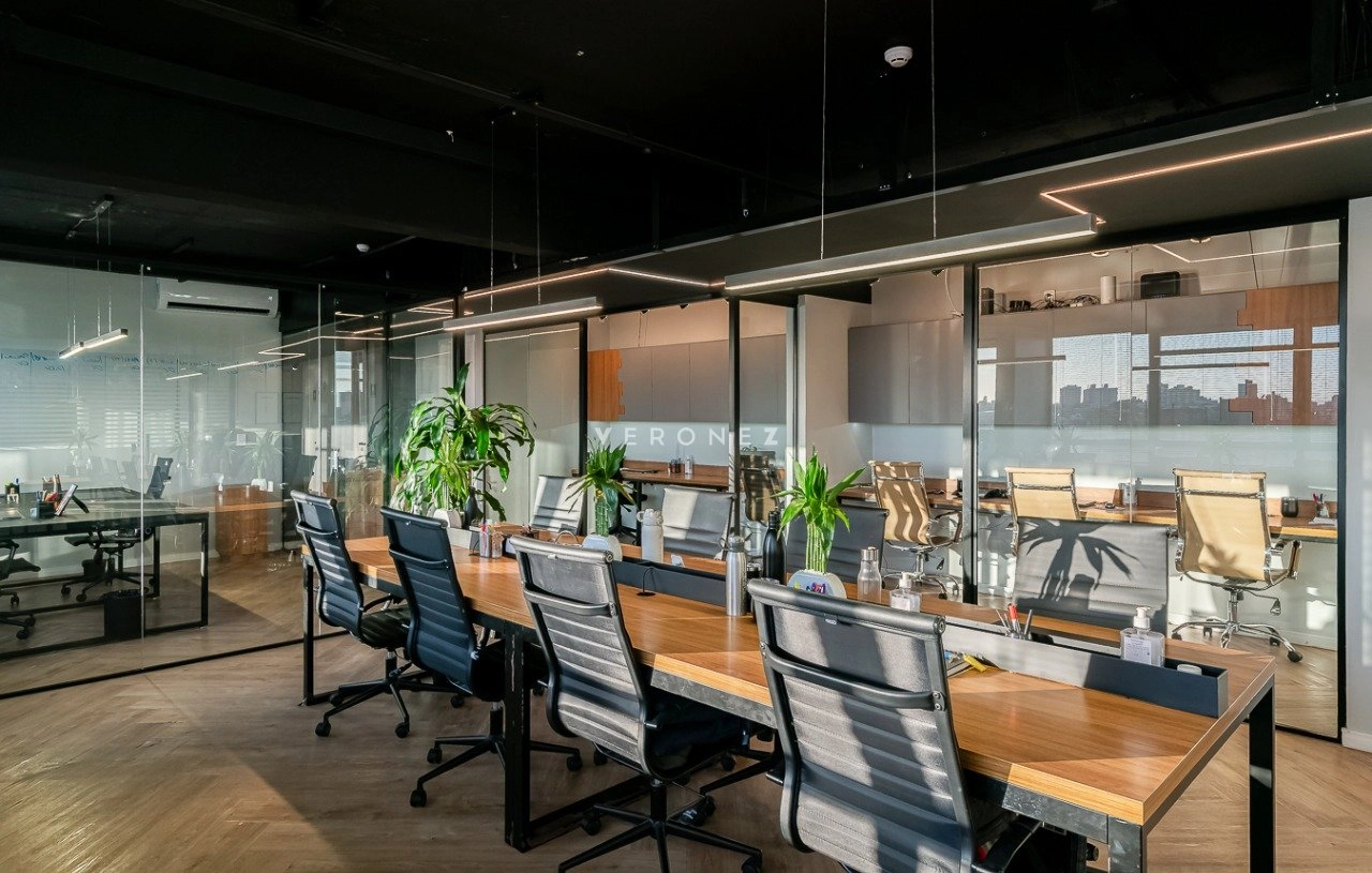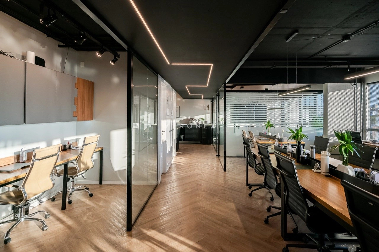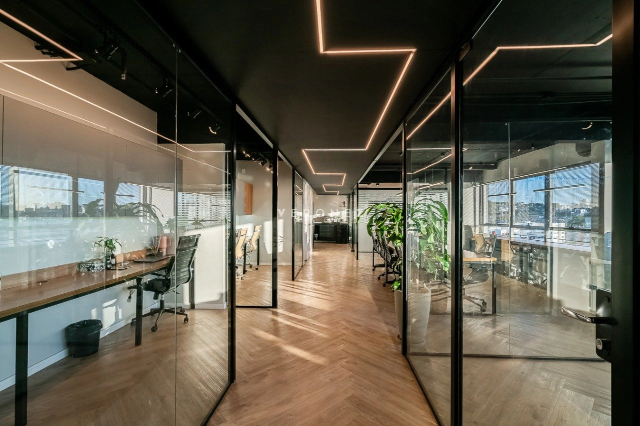 O espaço foi inteligentemente configurado com divisórias de vidro, garantindo ambientes integrados sem abrir mão da privacidade. Conta com 3 banheiros ? um deles convertido em copa/cozinha funcional ? e vem totalmente mobiliado, pronto para uso imediato.