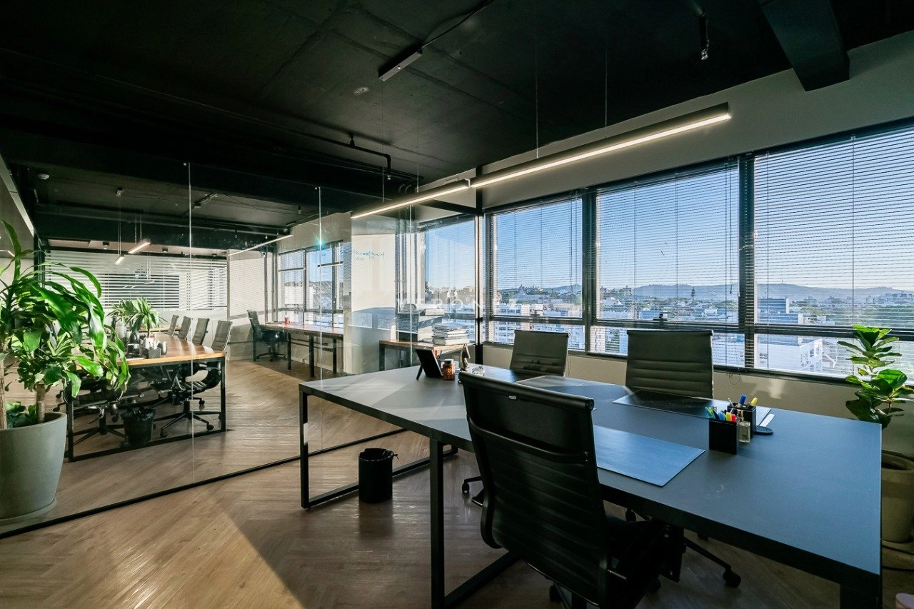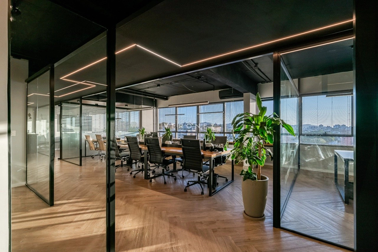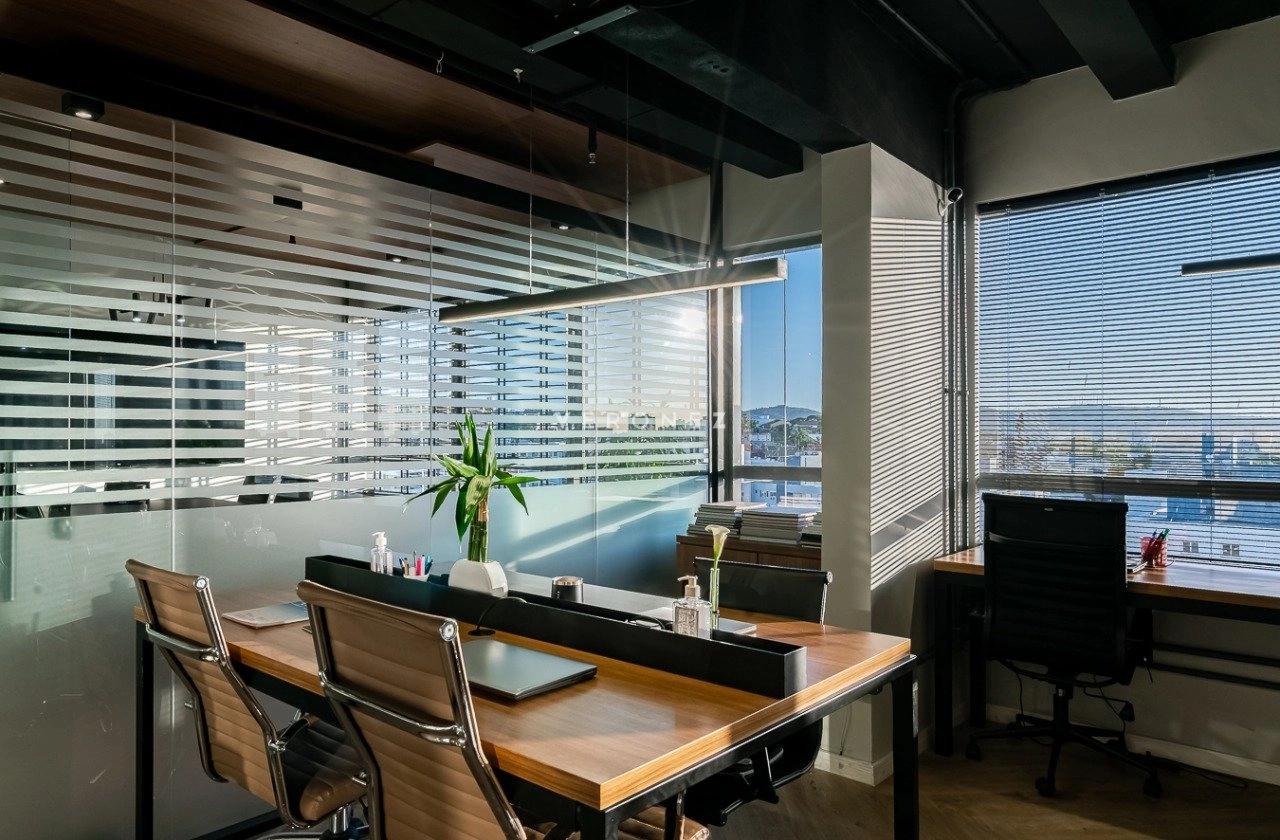 O espaço foi inteligentemente configurado com divisórias de vidro, garantindo ambientes integrados sem abrir mão da privacidade. Conta com 3 banheiros ? um deles convertido em copa/cozinha funcional ? e vem totalmente mobiliado, pronto para uso imediato.