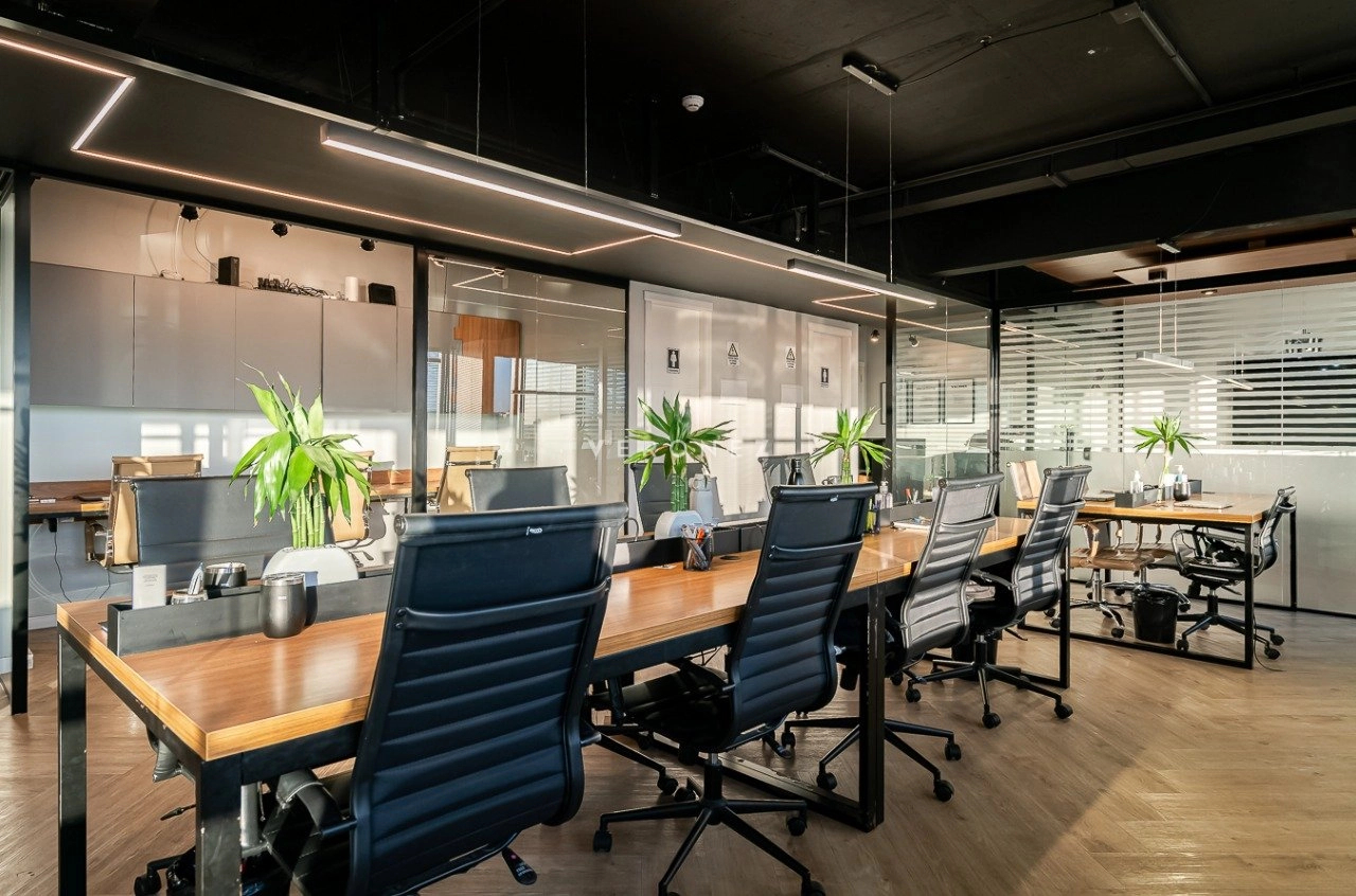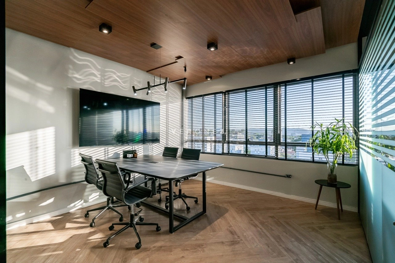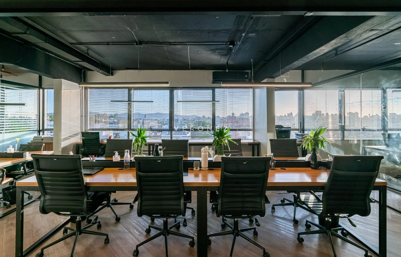 O espaço foi inteligentemente configurado com divisórias de vidro, garantindo ambientes integrados sem abrir mão da privacidade. Conta com 3 banheiros ? um deles convertido em copa/cozinha funcional ? e vem totalmente mobiliado, pronto para uso imediato.