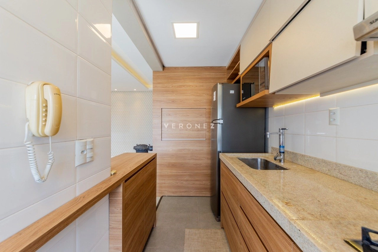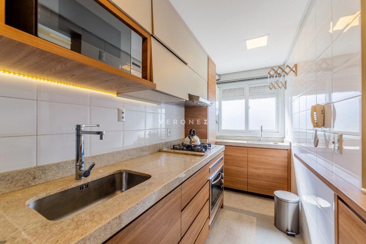 Apartamento semi mobiliado de 59 m² privativos, andar alto, 2 dormitórios, sendo 1 suíte, living para 2 ambientes, cozinha americana, área de serviço e 2 vagas individuais de garagem. Ótima posição solar (norte e leste).
