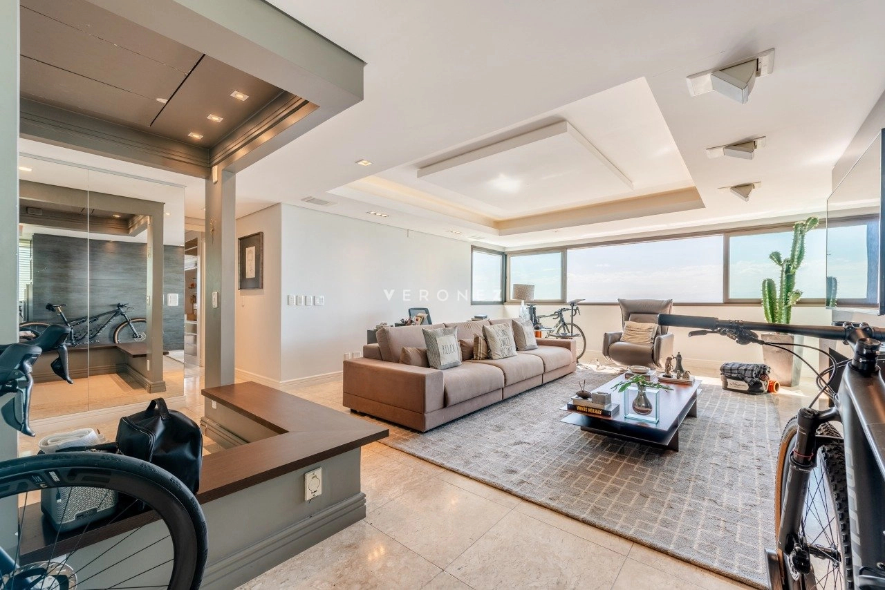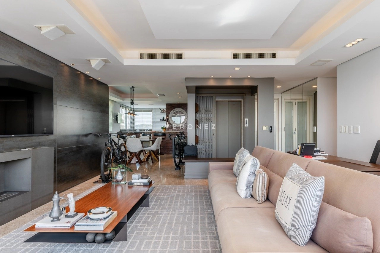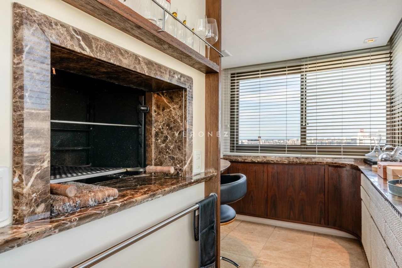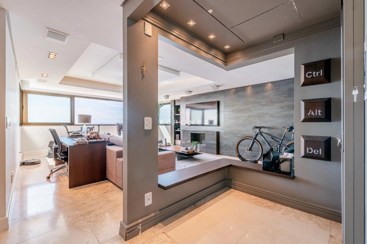 Conta ainda com gabinete, lavabo, living com três ambientes distintos, estar social com lareira, estar jantar com churrasqueira, cozinha com móveis planejados, área de serviço e três vagas de garagem lado a lado.