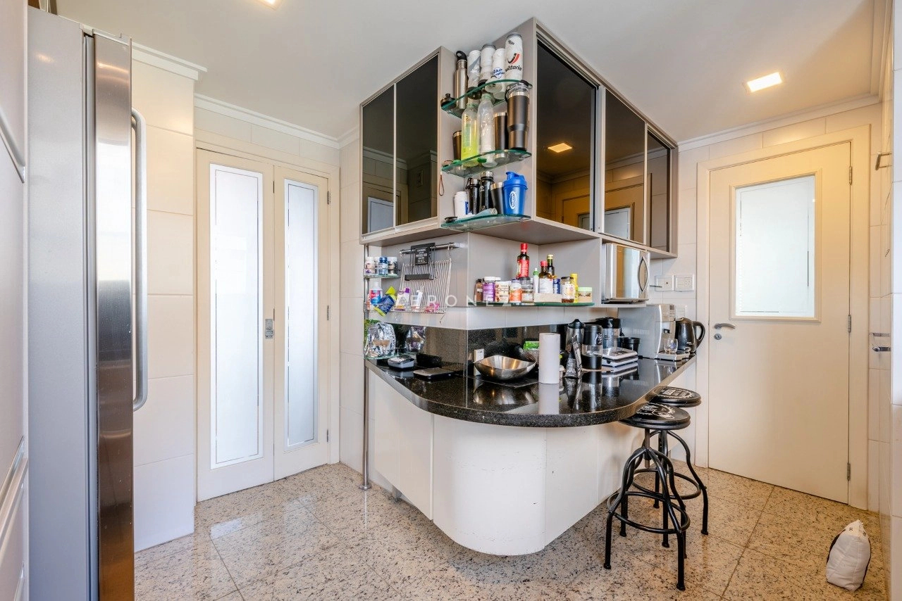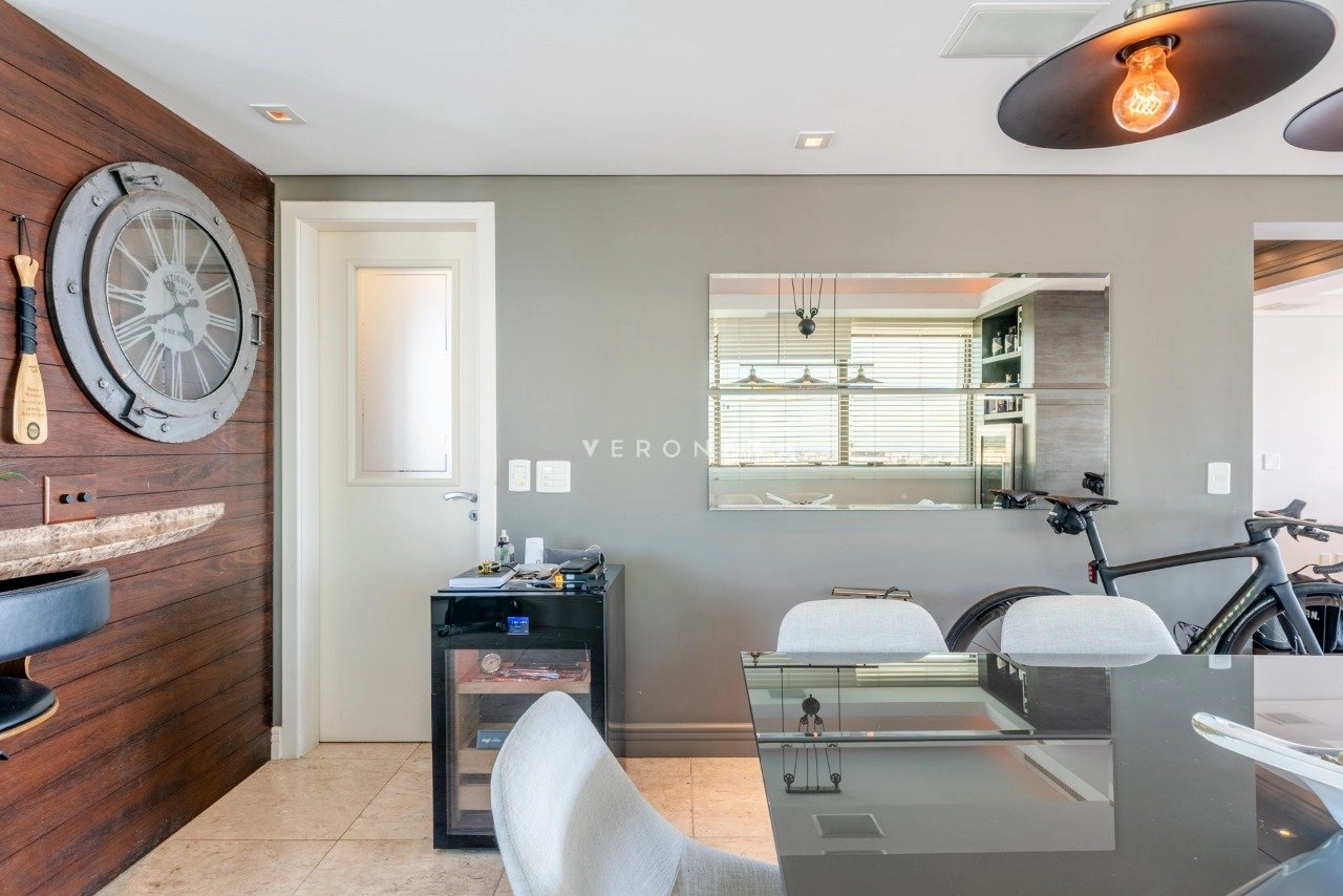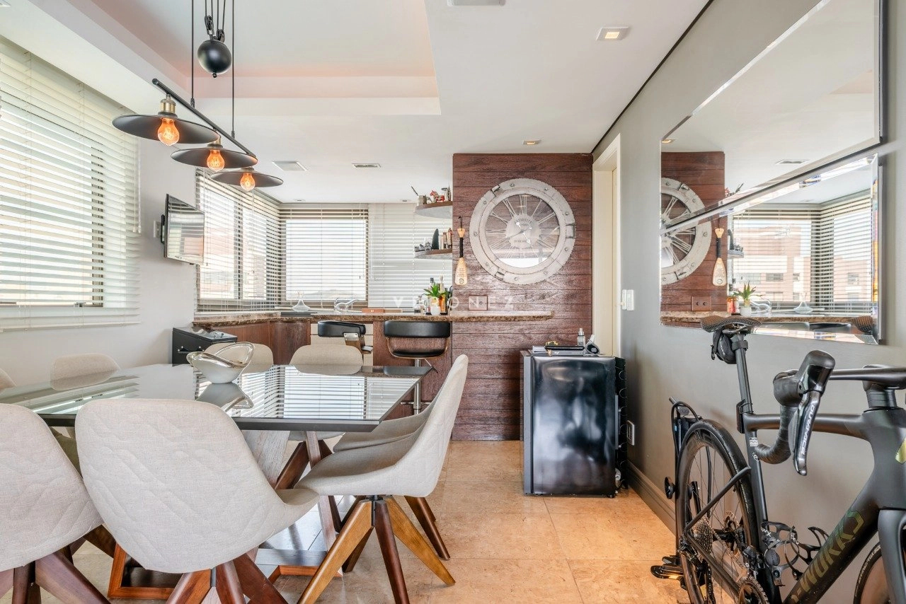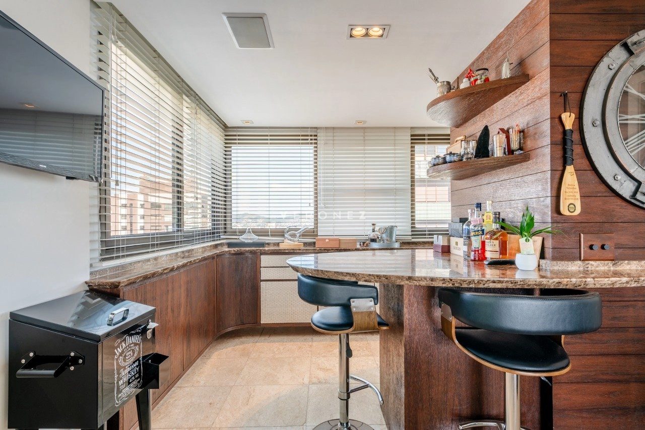 Conta ainda com gabinete, lavabo, living com três ambientes distintos, estar social com lareira, estar jantar com churrasqueira, cozinha com móveis planejados, área de serviço e três vagas de garagem lado a lado.