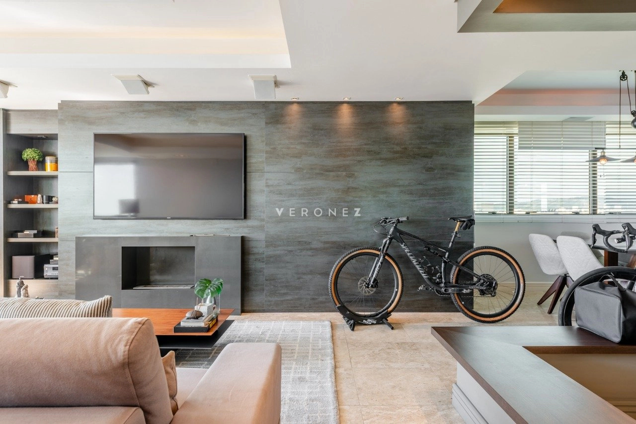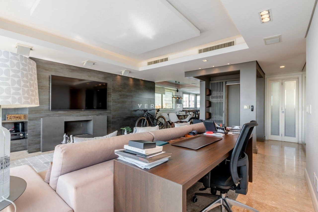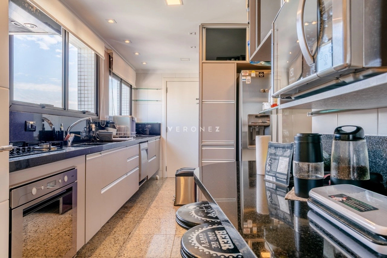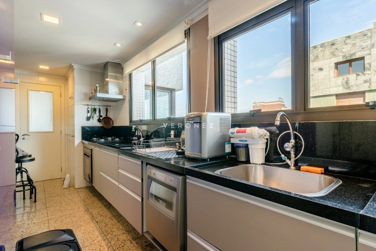 Conta ainda com gabinete, lavabo, living com três ambientes distintos, estar social com lareira, estar jantar com churrasqueira, cozinha com móveis planejados, área de serviço e três vagas de garagem lado a lado.