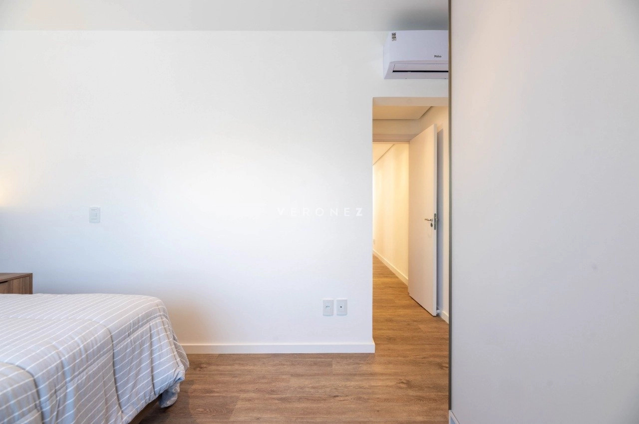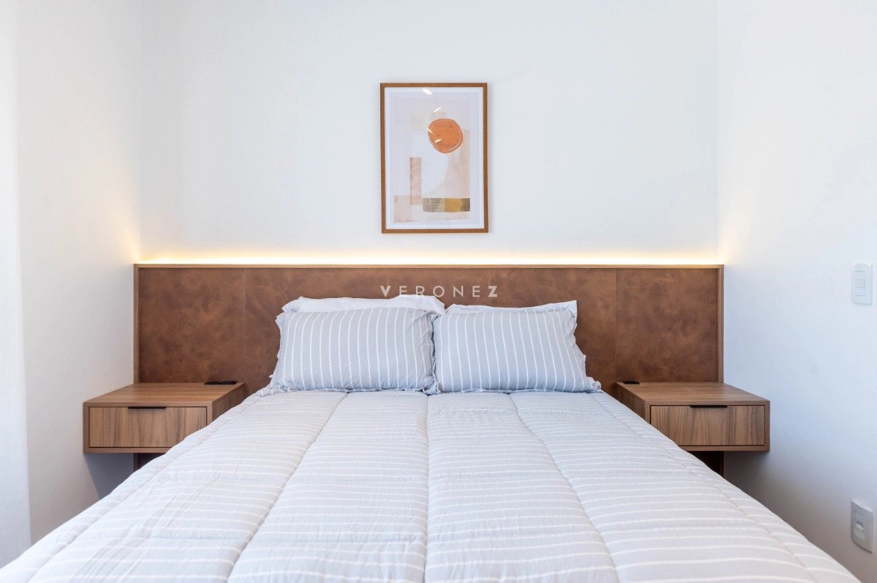 Segundo dormitório (principal) com cama de casal, cabeceira com iluminação embutida, armário e ar-condicionado. O ambiente possui vista com orientação solar oeste, aproveitando a luz suave do final da tarde.