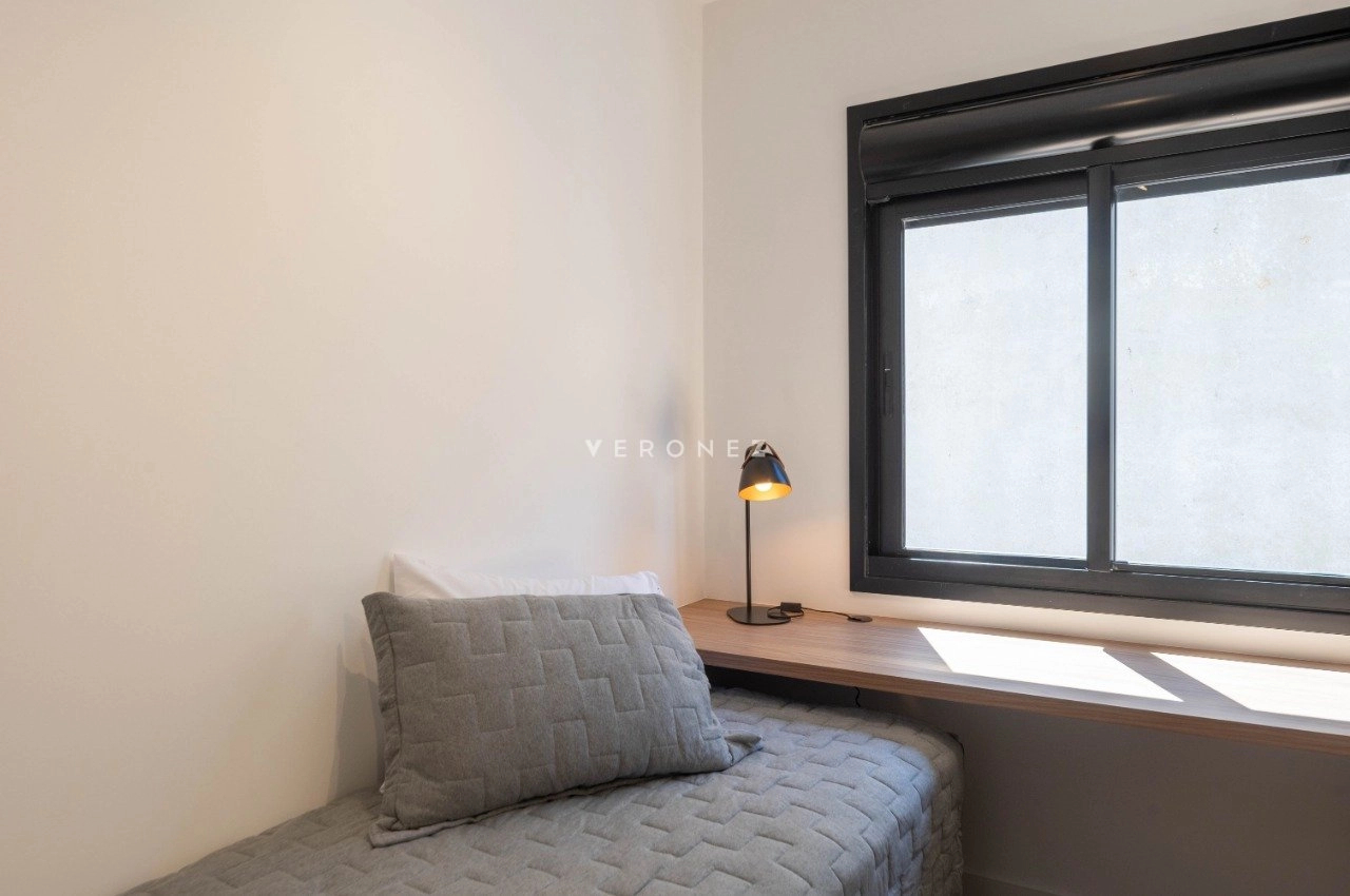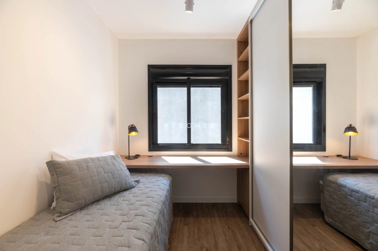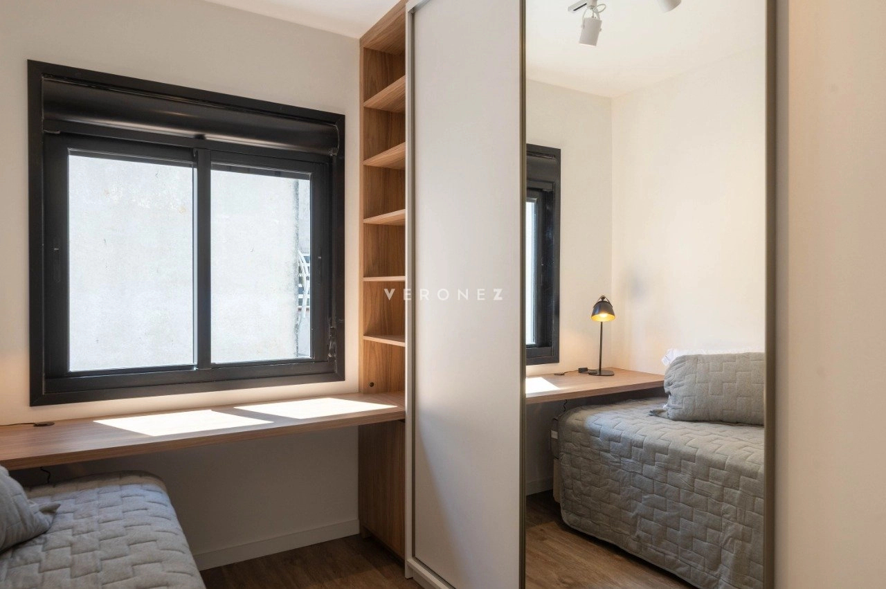 Primeiro dormitório com armário, espelho, cama de solteiro, ideal para hóspedes ou escritório. Possui bancada e nichos instalados próximo da janela.
