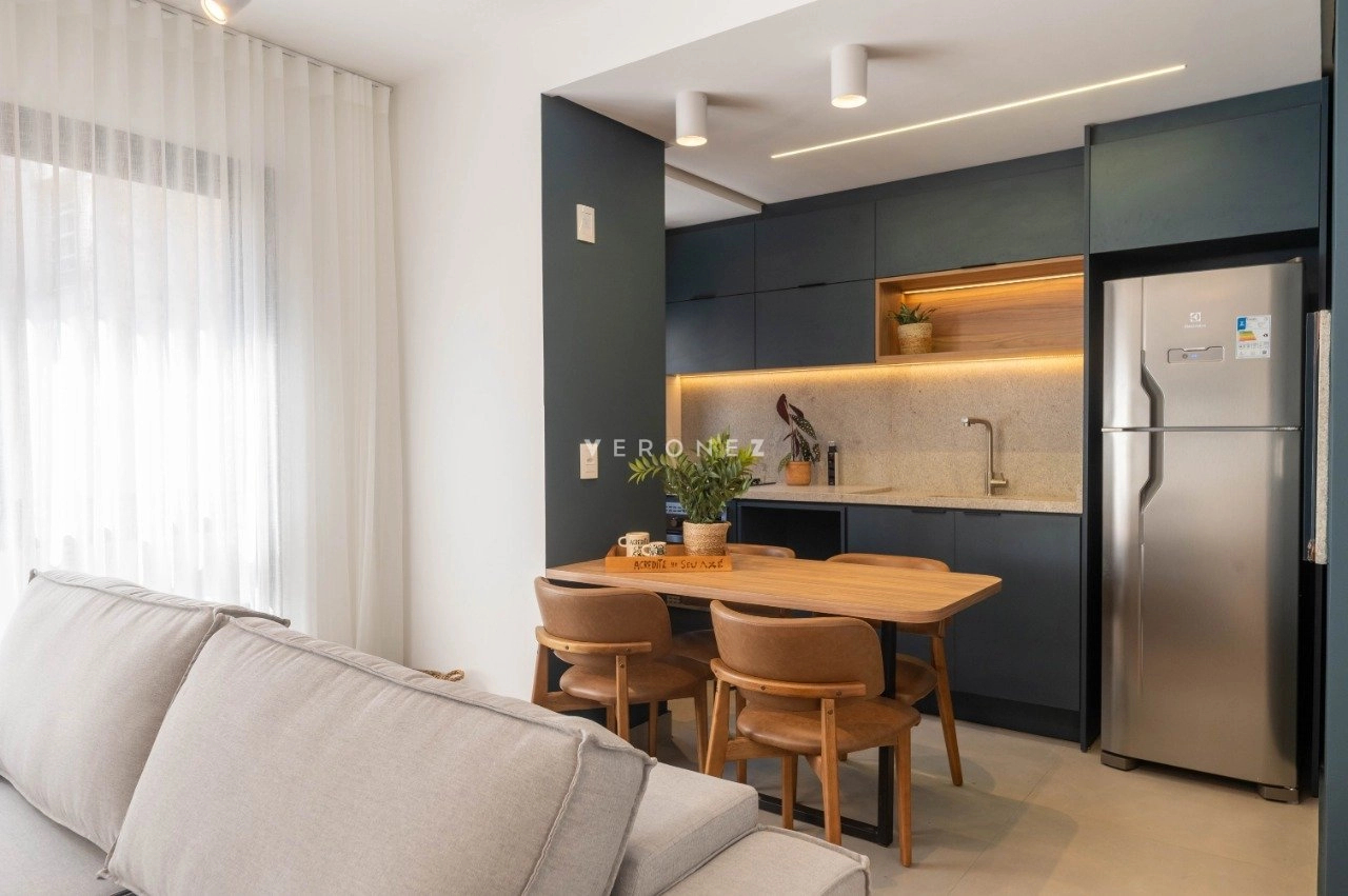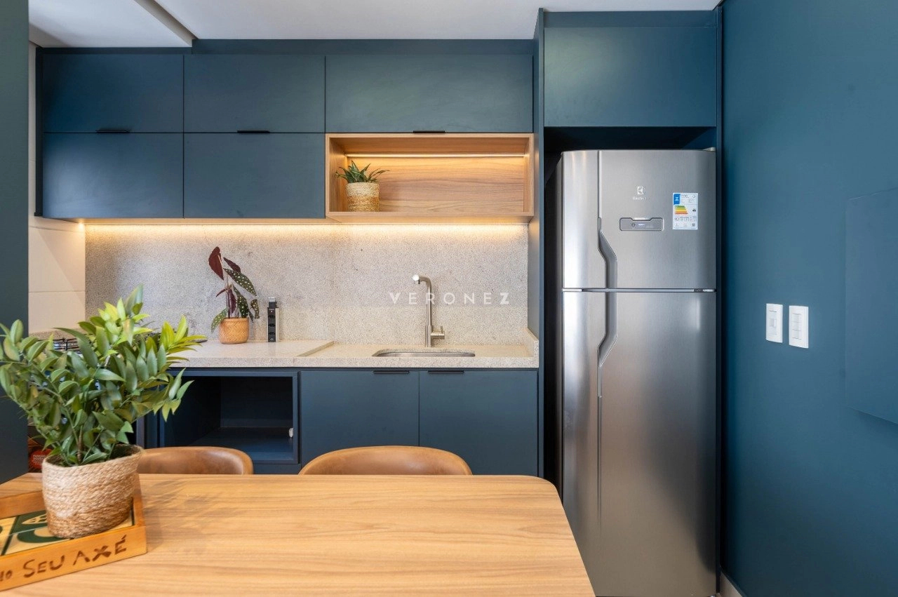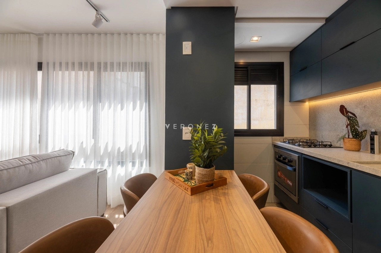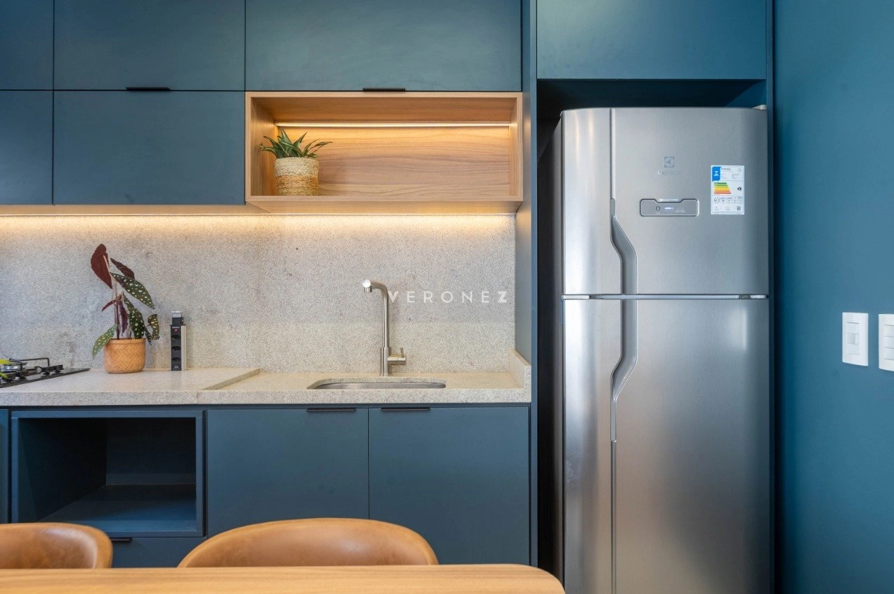 Cozinha planejada com armários, equipada com geladeira, coifa, fogão cooktop e forno. A cozinha é integrada à área de serviço, que conta com espaço para instalação de máquina de lavar roupas. A mesa de jantar é acoplada à cozinha, dividindo o ambiente com a sala de estar. O apartamento também possui churrasqueira, ideal para momentos de lazer e confraternização.
