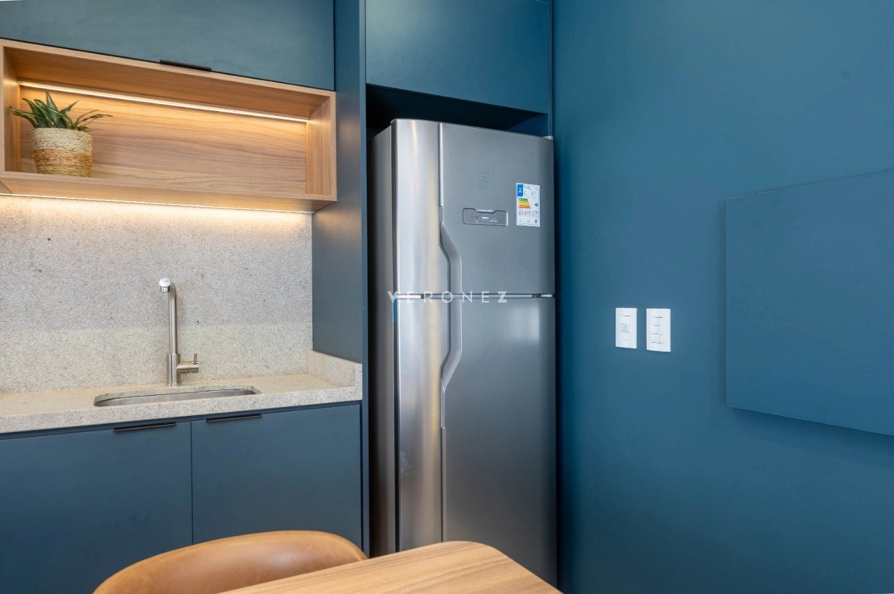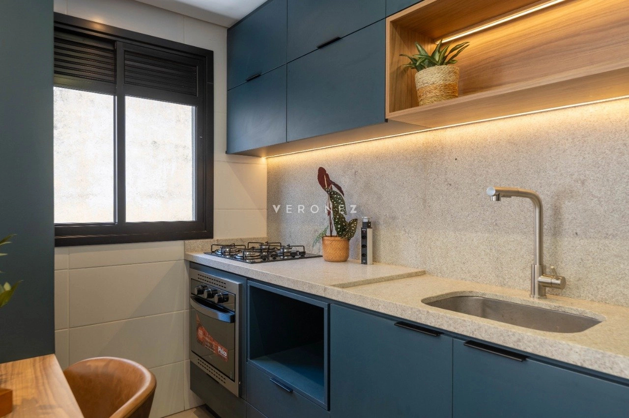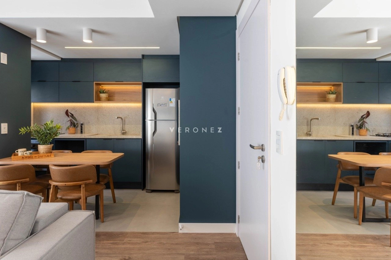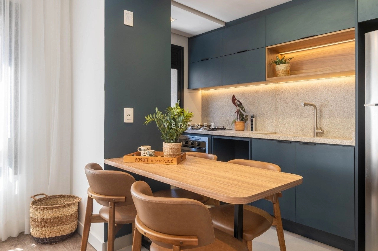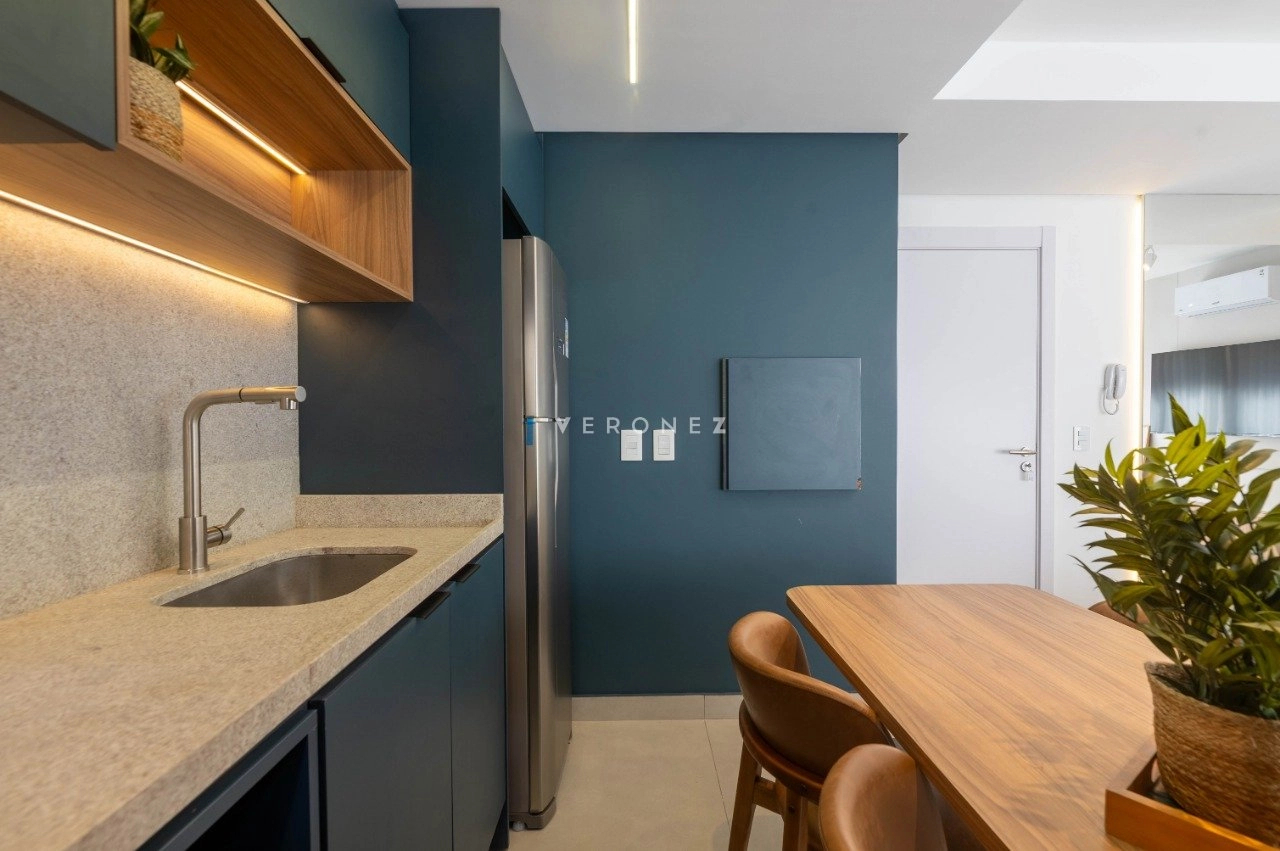Cozinha planejada com armários, equipada com geladeira, coifa, fogão cooktop e forno. A cozinha é integrada à área de serviço, que conta com espaço para instalação de máquina de lavar roupas. A mesa de jantar é acoplada à cozinha, dividindo o ambiente com a sala de estar. O apartamento também possui churrasqueira, ideal para momentos de lazer e confraternização.