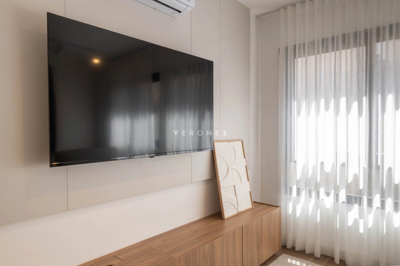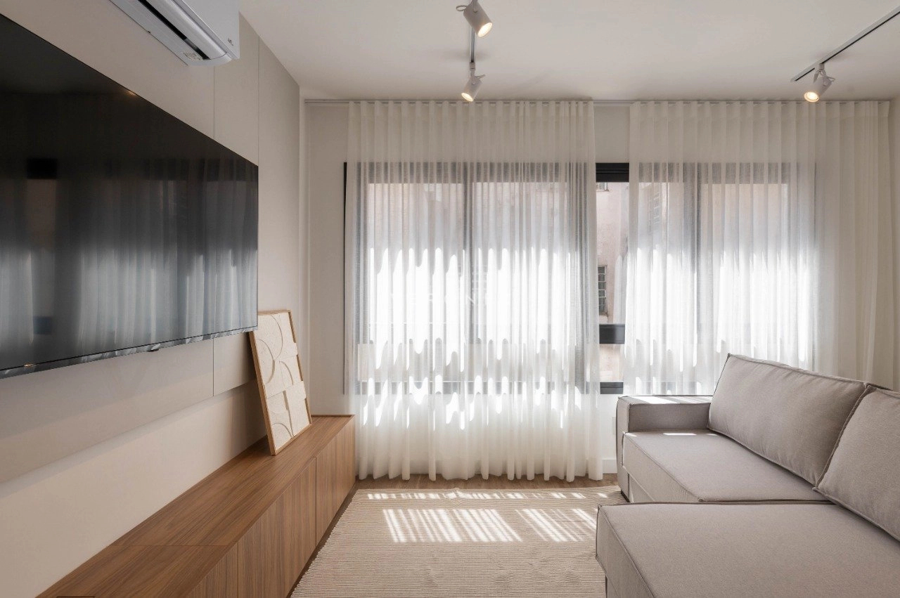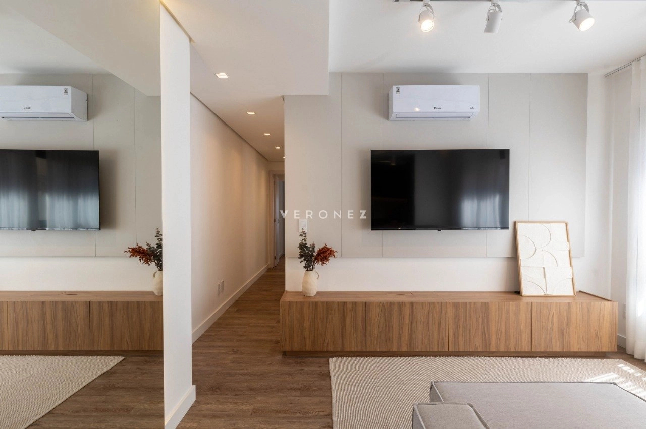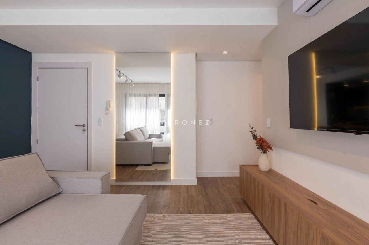 Sala de estar com painel de TV, rack e sofá retrátil. Espaço conta com ar-condicionado e um espelho amplo com iluminação de LED, criando uma atmosfera mais aconchegante à noite. Ambinete com posição solar norte.