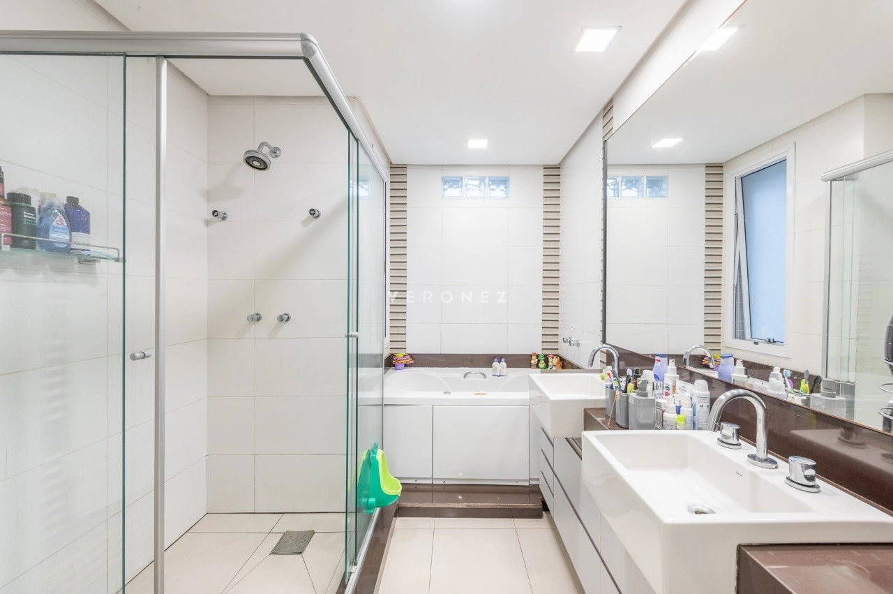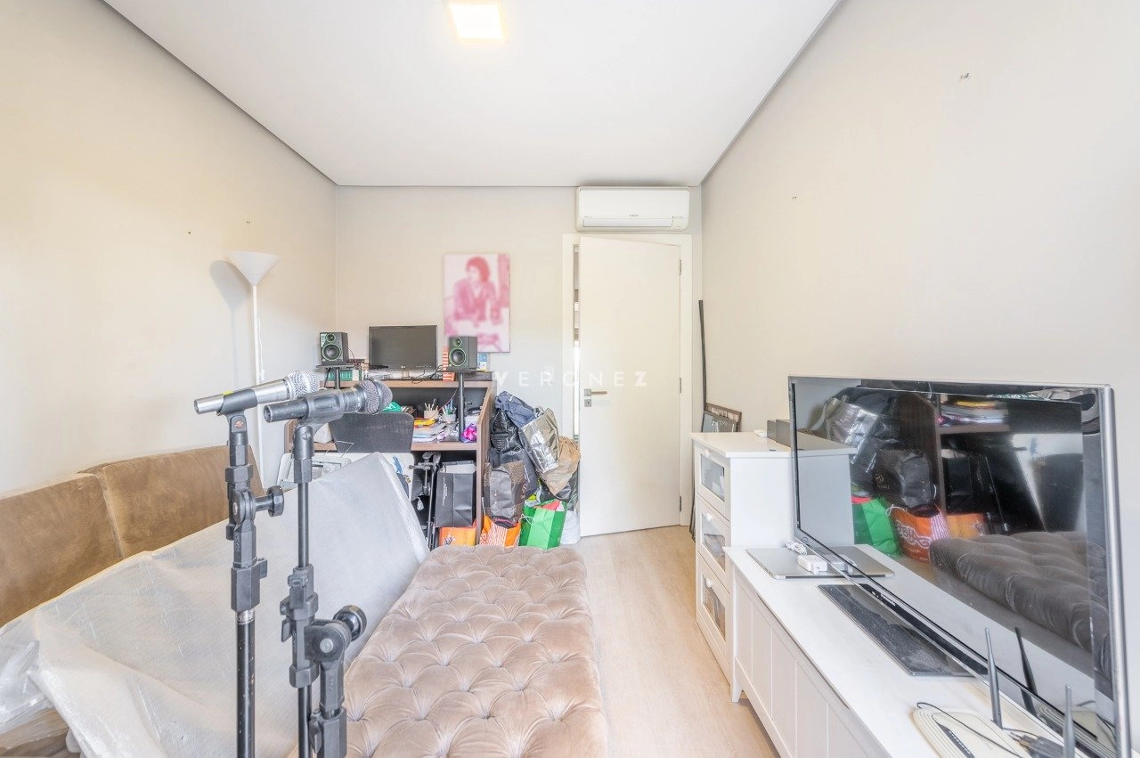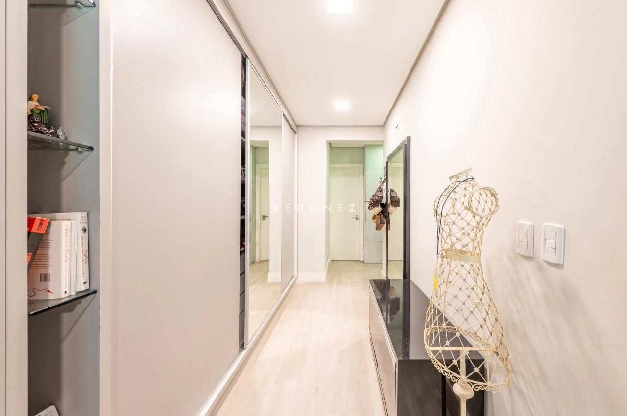 Na área íntima, são 3 dormitórios, sendo 2 suítes. A suíte principal se destaca pelo conforto, com piso laminado, aquecedor, ar-condicionado, closet generoso e banheiro com banheira de hidromassagem e box separados. A circulação ainda conta com um espaço versátil utilizado como home office.