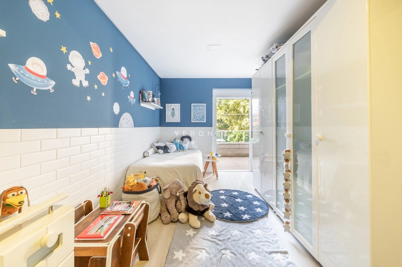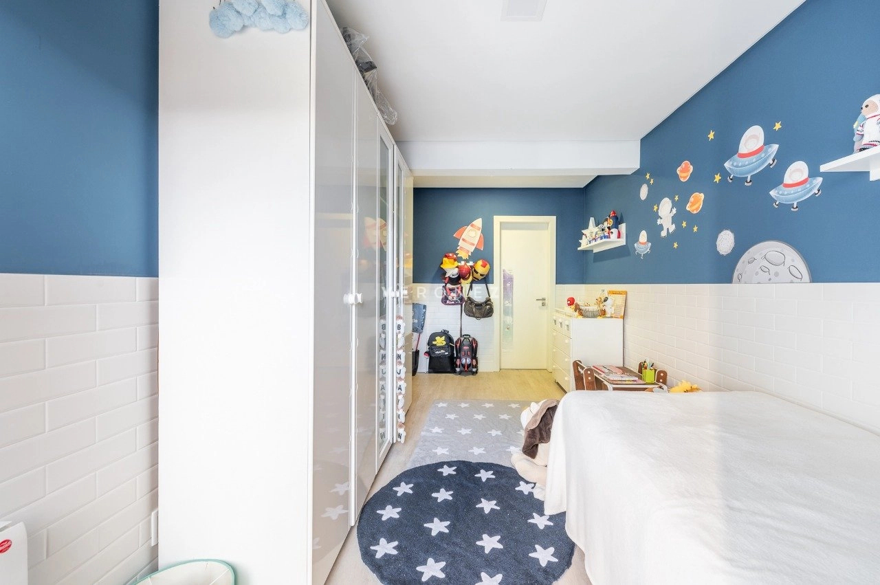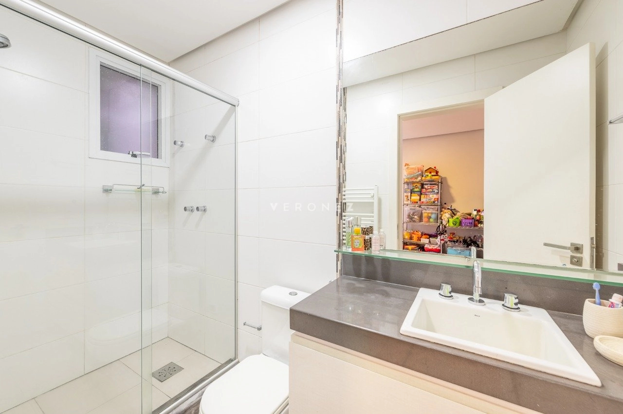 Na área íntima, são 3 dormitórios, sendo 2 suítes. A suíte principal se destaca pelo conforto, com piso laminado, aquecedor, ar-condicionado, closet generoso e banheiro com banheira de hidromassagem e box separados. A circulação ainda conta com um espaço versátil utilizado como home office.