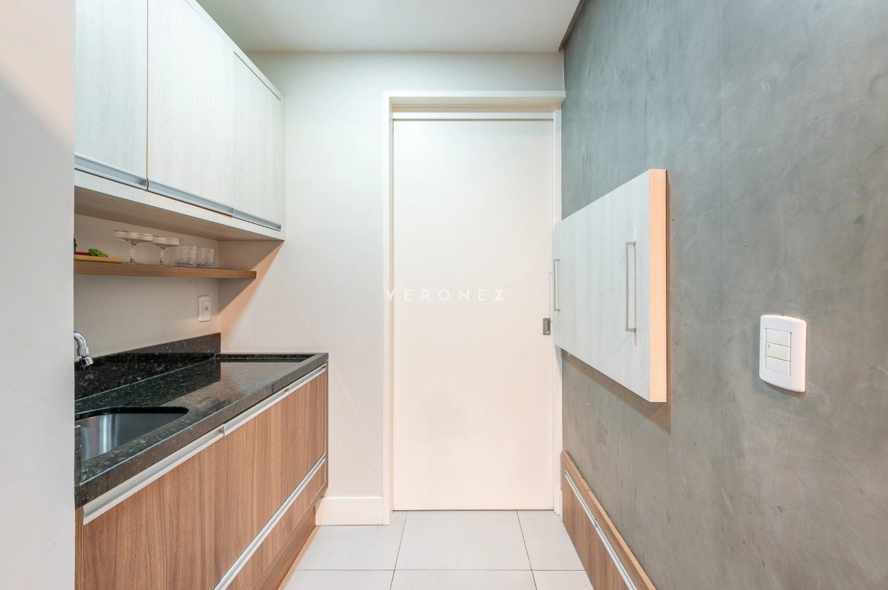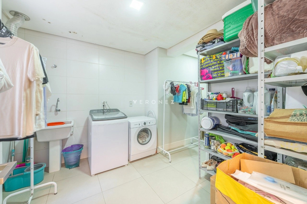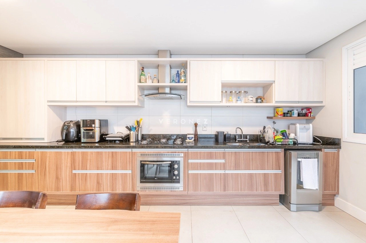 A cozinha é ampla, totalmente montada, equipada com cubas duplas e espaço para refrigerador side by side, além de contar com uma área de serviço separada e muito bem ventilada.
