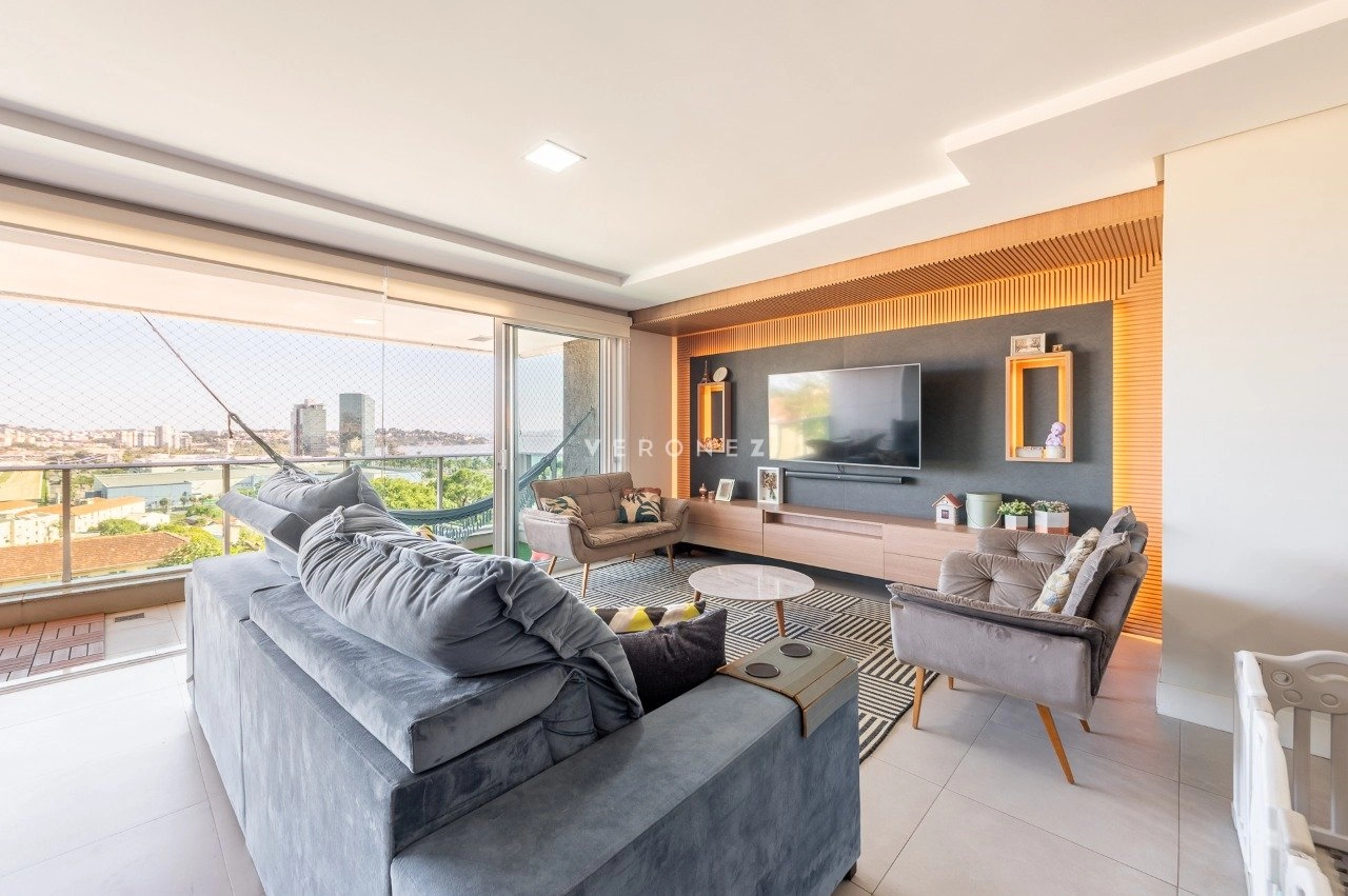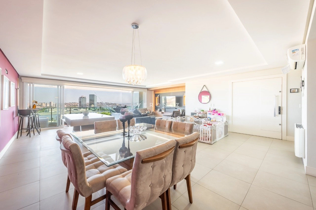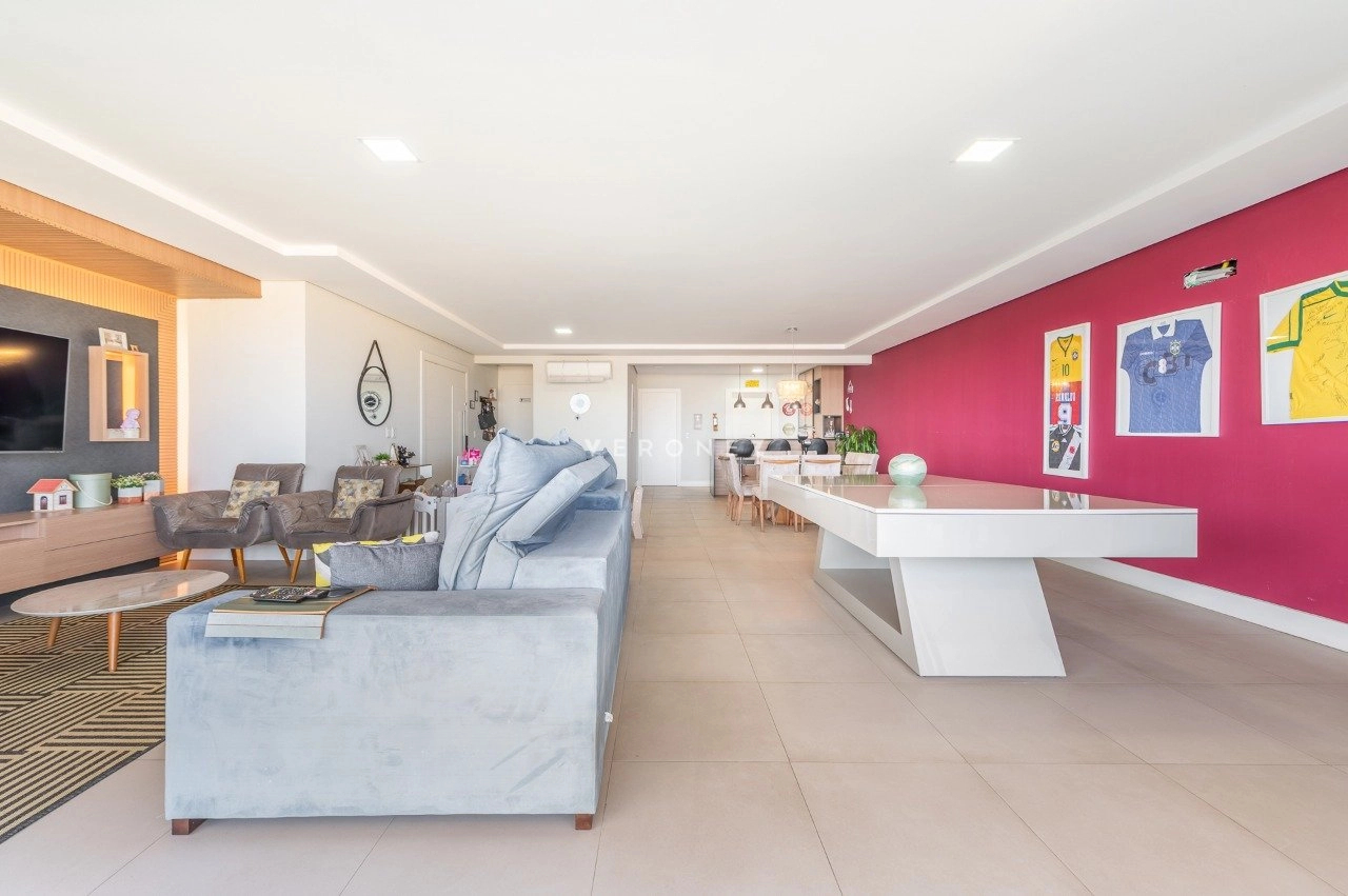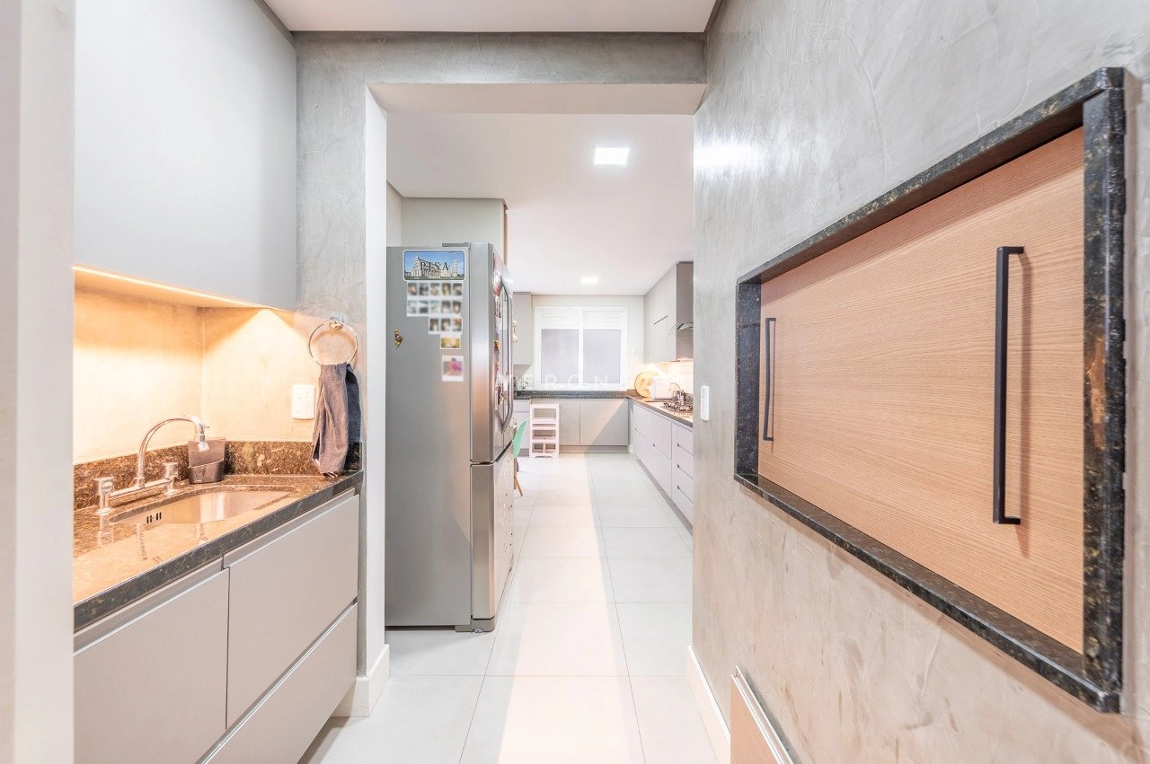 Apartamento com 3 dormitórios, 243 m², living amplo com sacada, lavabo e espaço gourmet e cozinha com churasqueira.