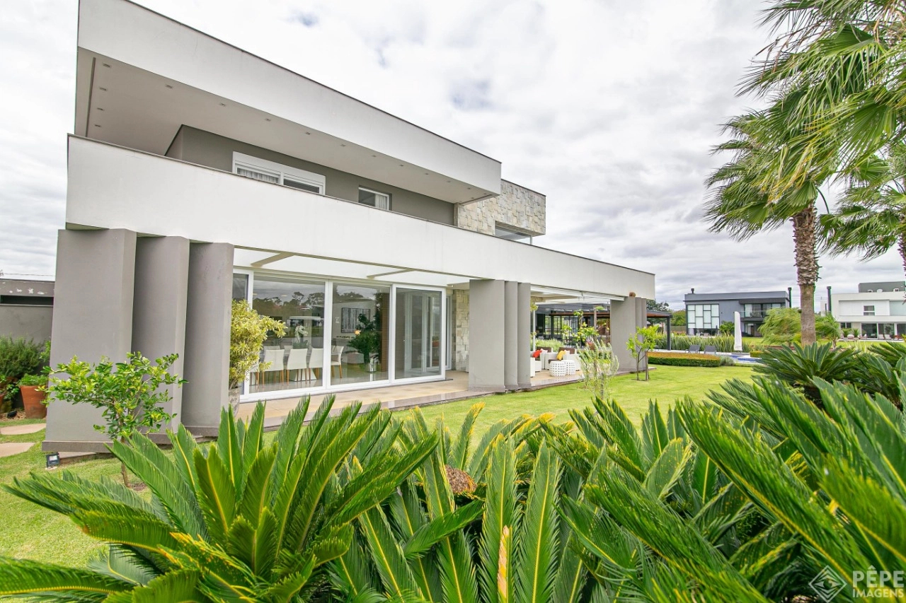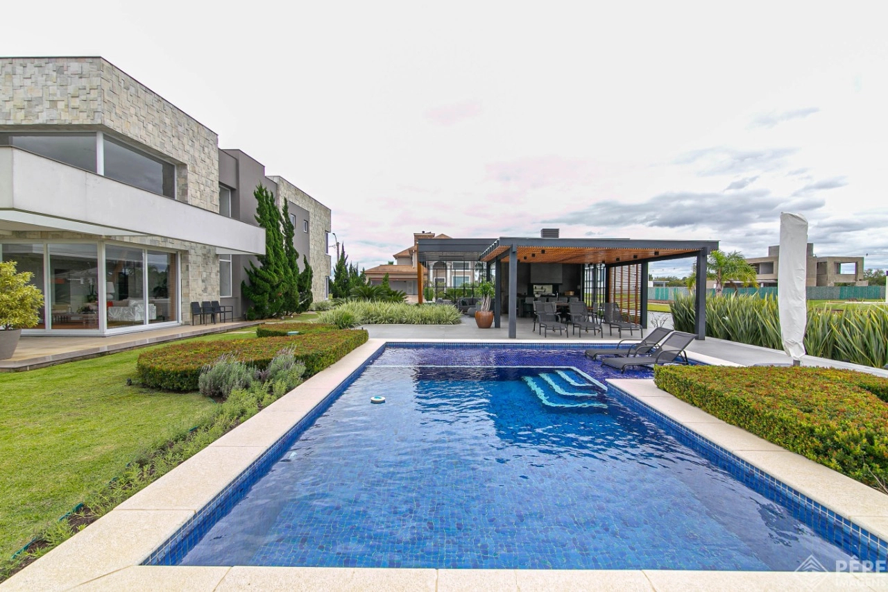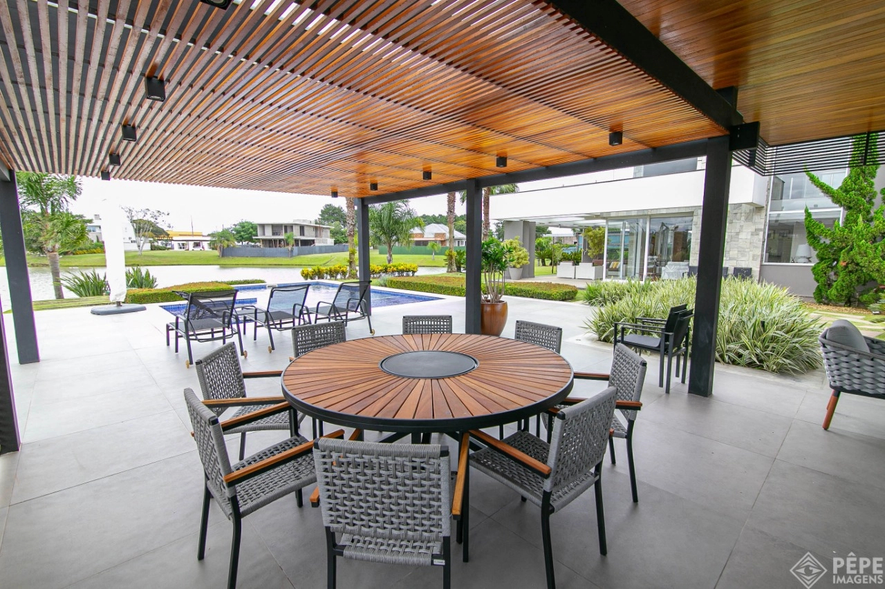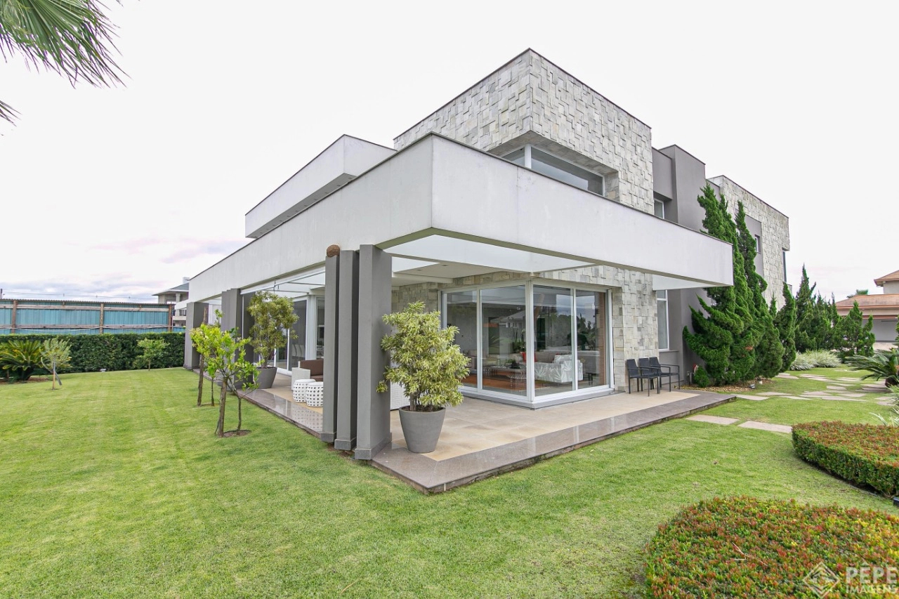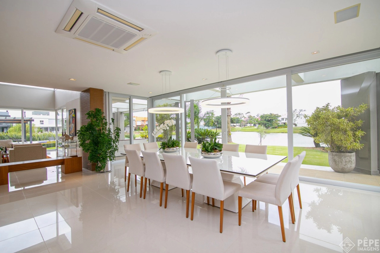 Magnífica casa com fachada revestida em quartzito, 100% mobiliada e equipada com o que a de melhor ! Edificada sobre os dois melhores terrenos do condomínio, são 740 metros privativos distribuídos em um imenso Living com pé direito duplo , lareira, lavabo, uma das 4 suítes ,banheiro social com acesso para a piscina e área externa, espaço gourmet com churrasqueira + sala de jantar integrada ao todo. Cozinha gourmet super equipada com ilha e piso aquecido, ampla área de serviço com dependência completa de empregada. Na parte superior 3 lindas suítes, sendo a master com sacadão em L, banheiro ele e ela com piso aquecido, e um closet com claraboia encantador. O imóvel possui, calefação e split em todas as peças, sistema de som e é completamente automatizado assim como as persianas. Na área externa temos um quiosque diferenciado com cozinha de apoio, churrasqueira, sala de estar com tv integrado a uma bela piscina com deck molhado edificada sobre um magnífico jardim projetado junto ao lago. O imóvel foi arquitetado e concebido por concorrida profissional, o que resultou em publicação de conceituada revista de arquitetura. Condomínio de infraestrutura completíssima com trapiche.