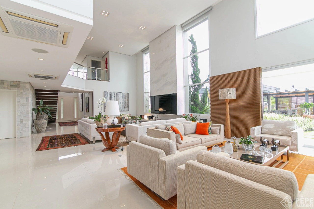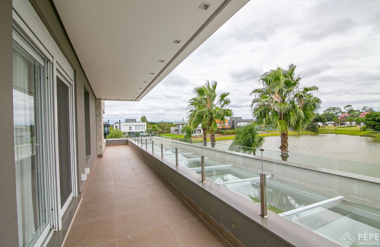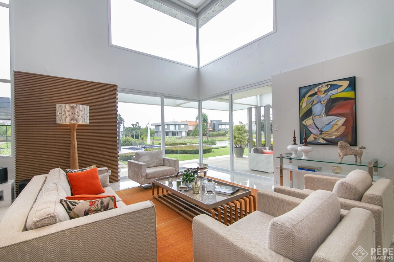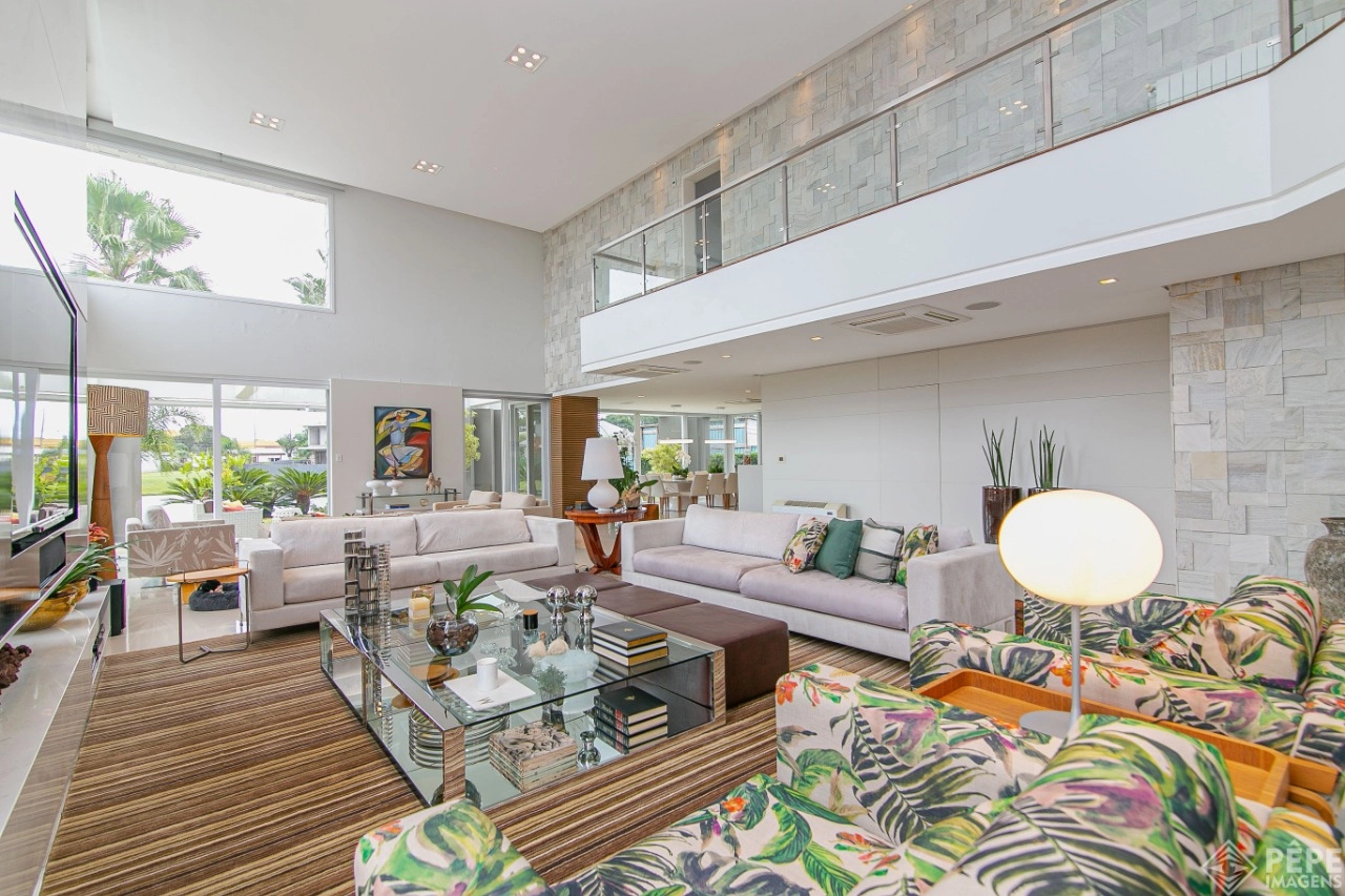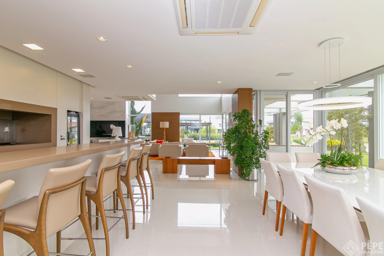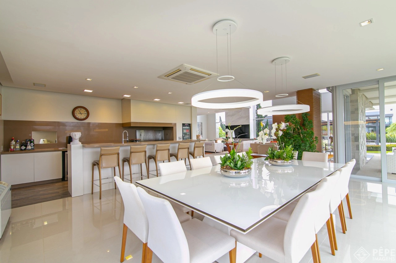Magnífica casa com fachada revestida em quartzito, 100% mobiliada e equipada com o que a de melhor ! Edificada sobre os dois melhores terrenos do condomínio, são 740 metros privativos distribuídos em um imenso Living com pé direito duplo , lareira, lavabo, uma das 4 suítes ,banheiro social com acesso para a piscina e área externa, espaço gourmet com churrasqueira + sala de jantar integrada ao todo. Cozinha gourmet super equipada com ilha e piso aquecido, ampla área de serviço com dependência completa de empregada. Na parte superior 3 lindas suítes, sendo a master com sacadão em L, banheiro ele e ela com piso aquecido, e um closet com claraboia encantador. O imóvel possui, calefação e split em todas as peças, sistema de som e é completamente automatizado assim como as persianas. Na área externa temos um quiosque diferenciado com cozinha de apoio, churrasqueira, sala de estar com tv integrado a uma bela piscina com deck molhado edificada sobre um magnífico jardim projetado junto ao lago. O imóvel foi arquitetado e concebido por concorrida profissional, o que resultou em publicação de conceituada revista de arquitetura. Condomínio de infraestrutura completíssima com trapiche.