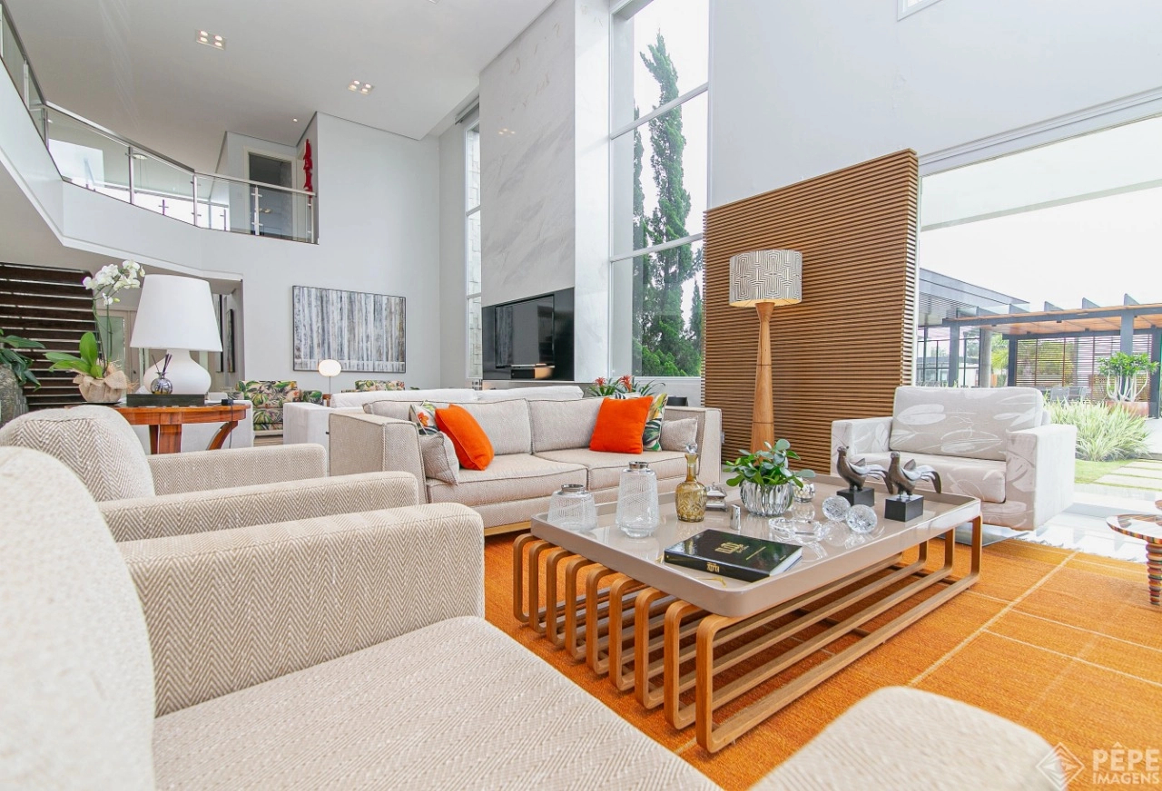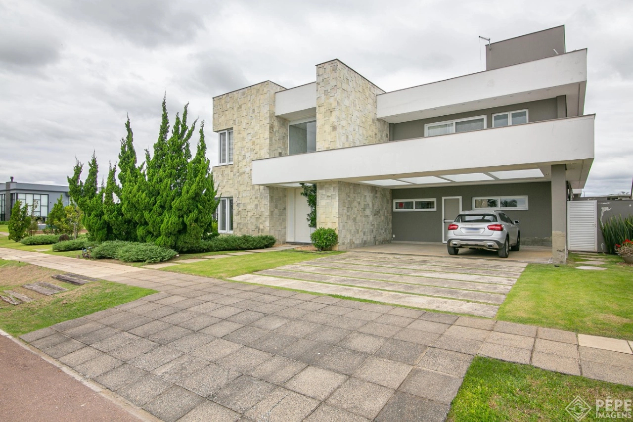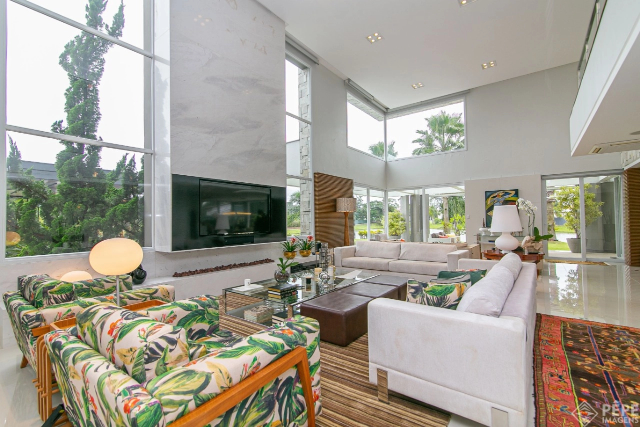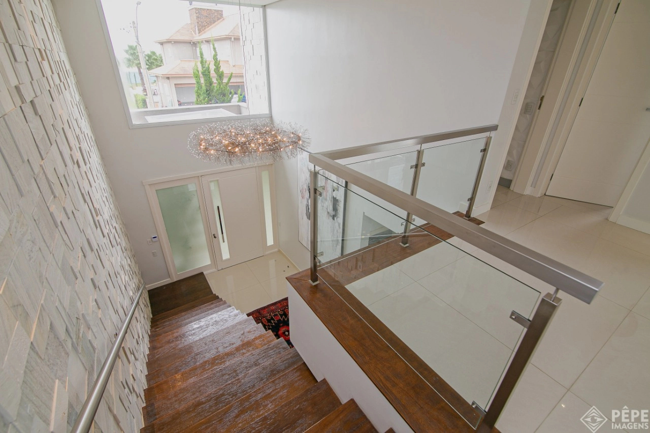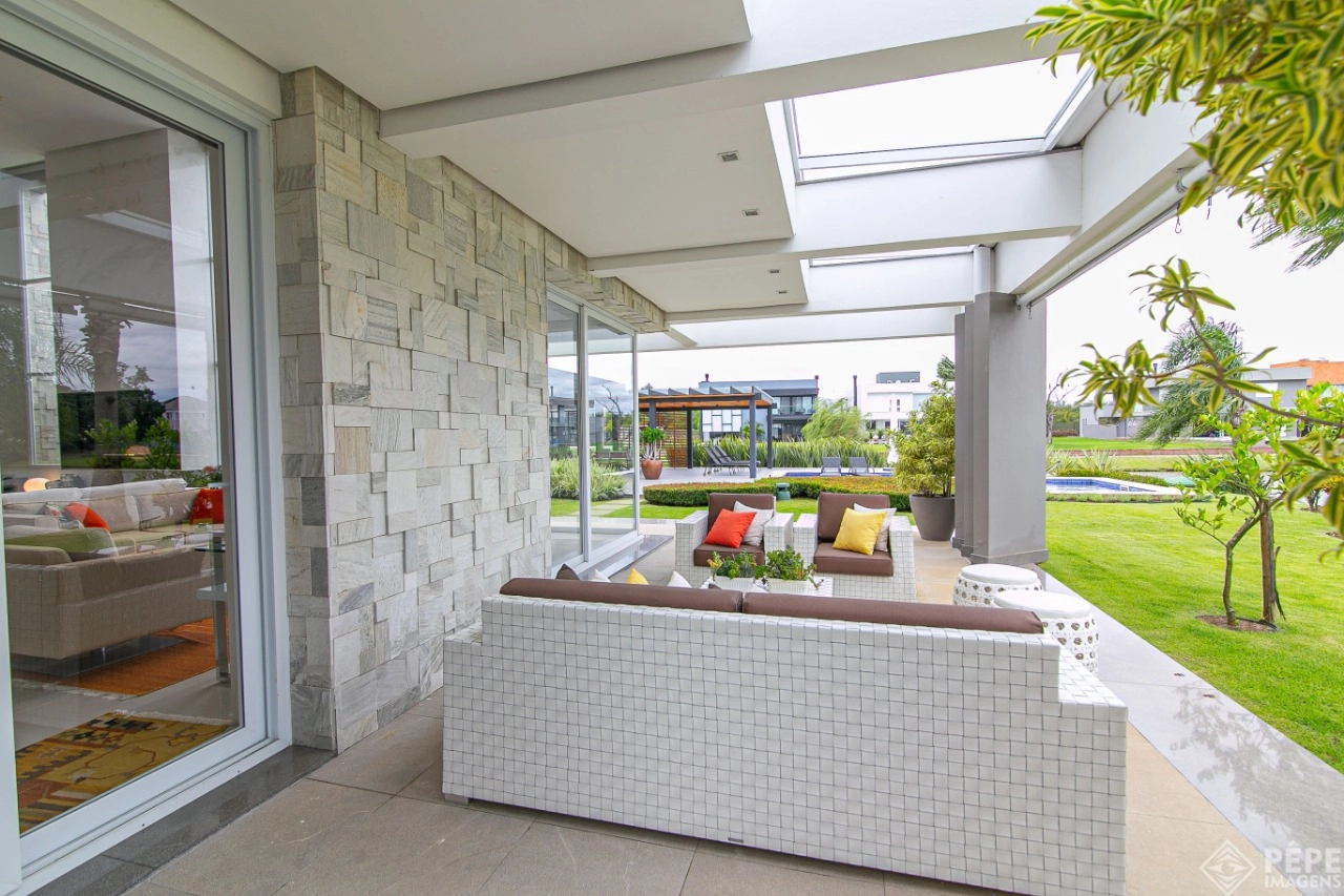 Magnífica casa com fachada revestida em quartzito, 100% mobiliada e equipada com o que a de melhor ! Edificada sobre os dois melhores terrenos do condomínio, são 740 metros privativos distribuídos em um imenso Living com pé direito duplo , lareira, lavabo, uma das 4 suítes ,banheiro social com acesso para a piscina e área externa, espaço gourmet com churrasqueira + sala de jantar integrada ao todo. Cozinha gourmet super equipada com ilha e piso aquecido, ampla área de serviço com dependência completa de empregada. Na parte superior 3 lindas suítes, sendo a master com sacadão em L, banheiro ele e ela com piso aquecido, e um closet com claraboia encantador. O imóvel possui, calefação e split em todas as peças, sistema de som e é completamente automatizado assim como as persianas. Na área externa temos um quiosque diferenciado com cozinha de apoio, churrasqueira, sala de estar com tv integrado a uma bela piscina com deck molhado edificada sobre um magnífico jardim projetado junto ao lago. O imóvel foi arquitetado e concebido por concorrida profissional, o que resultou em publicação de conceituada revista de arquitetura. Condomínio de infraestrutura completíssima com trapiche.