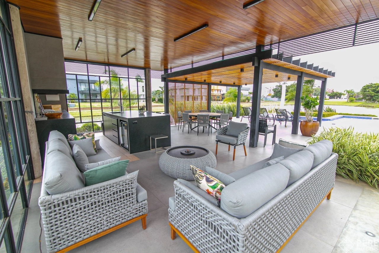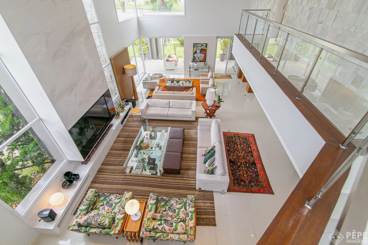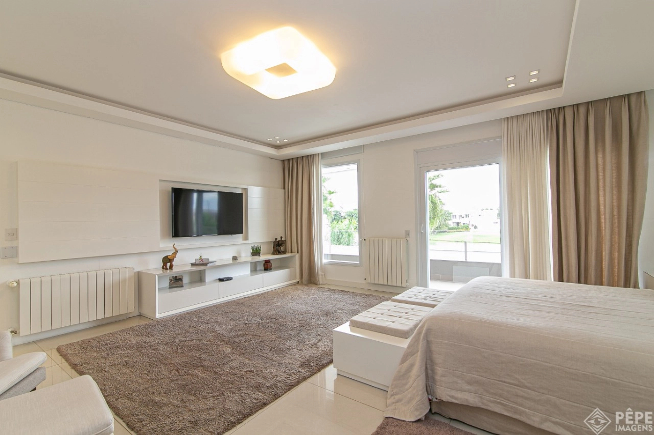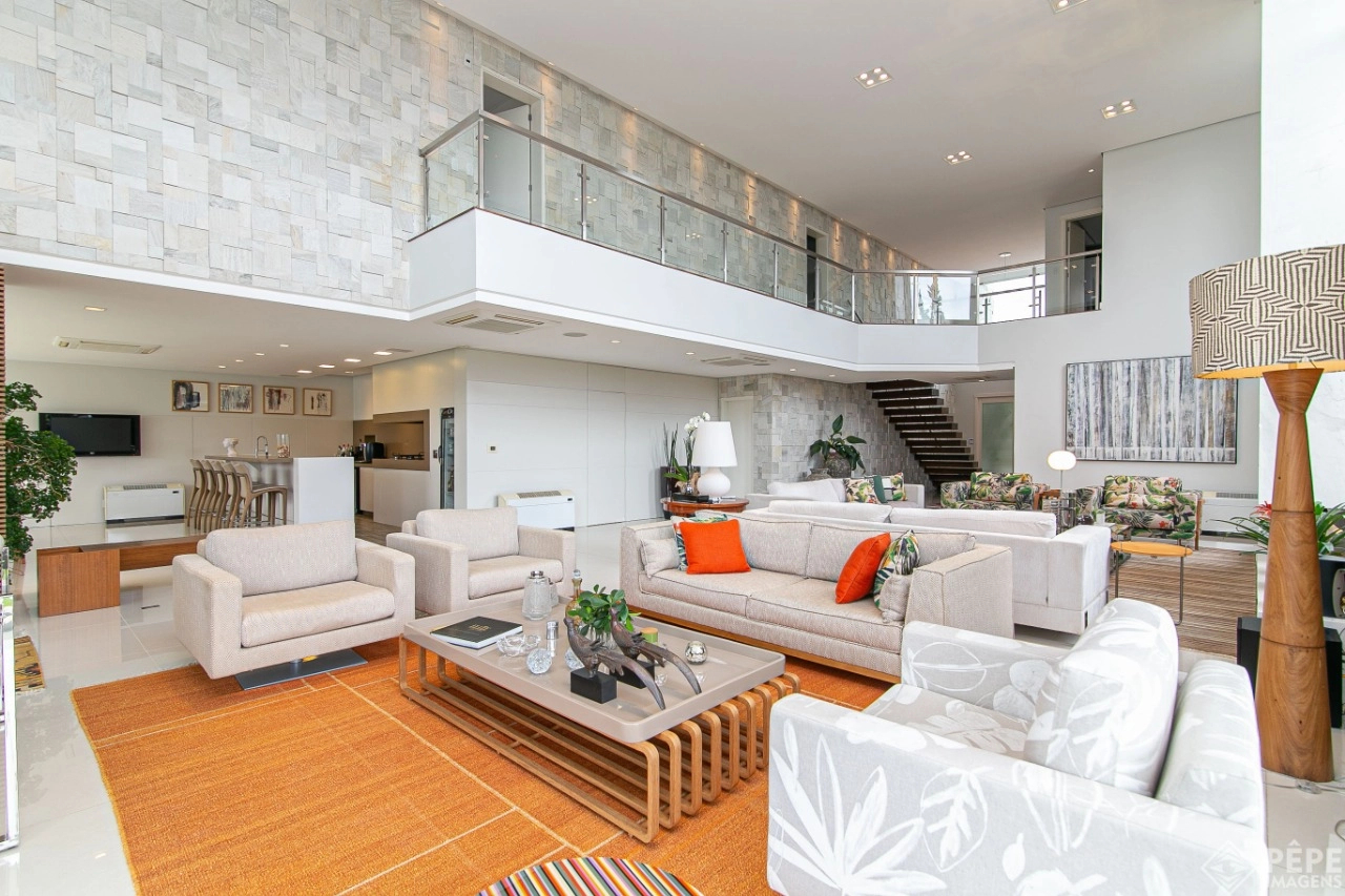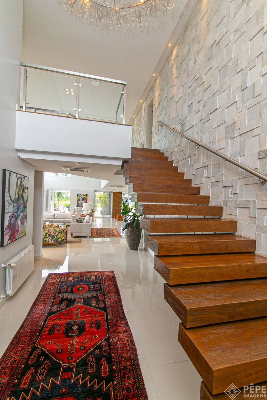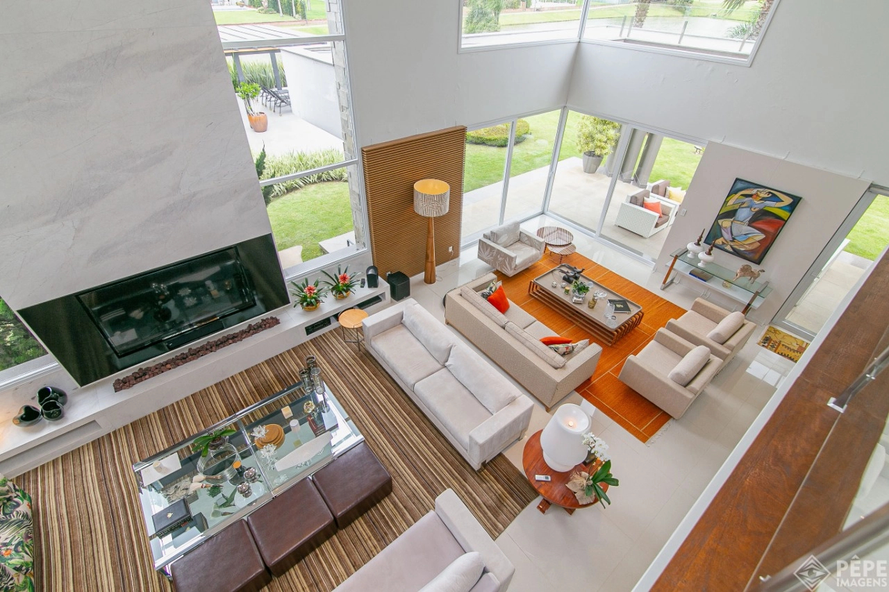 Magnífica casa com fachada revestida em quartzito, 100% mobiliada e equipada com o que a de melhor ! Edificada sobre os dois melhores terrenos do condomínio, são 740 metros privativos distribuídos em um imenso Living com pé direito duplo , lareira, lavabo, uma das 4 suítes ,banheiro social com acesso para a piscina e área externa, espaço gourmet com churrasqueira + sala de jantar integrada ao todo. Cozinha gourmet super equipada com ilha e piso aquecido, ampla área de serviço com dependência completa de empregada. Na parte superior 3 lindas suítes, sendo a master com sacadão em L, banheiro ele e ela com piso aquecido, e um closet com claraboia encantador. O imóvel possui, calefação e split em todas as peças, sistema de som e é completamente automatizado assim como as persianas. Na área externa temos um quiosque diferenciado com cozinha de apoio, churrasqueira, sala de estar com tv integrado a uma bela piscina com deck molhado edificada sobre um magnífico jardim projetado junto ao lago. O imóvel foi arquitetado e concebido por concorrida profissional, o que resultou em publicação de conceituada revista de arquitetura. Condomínio de infraestrutura completíssima com trapiche.