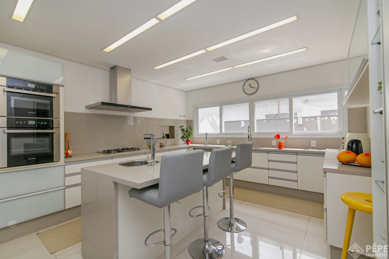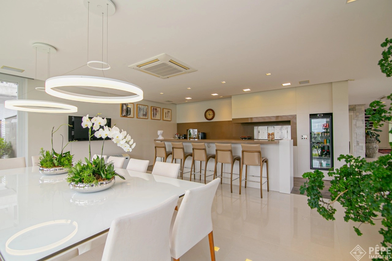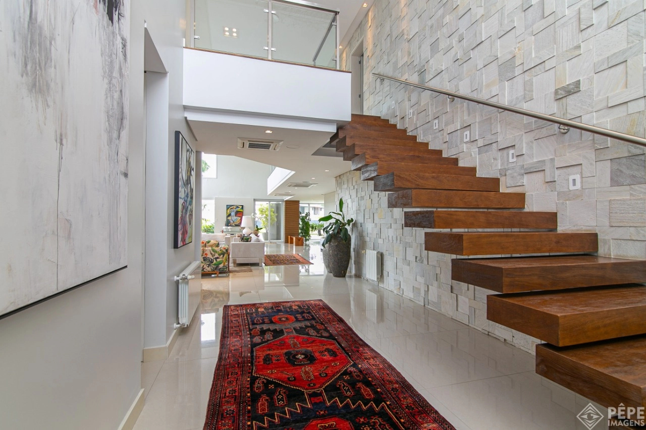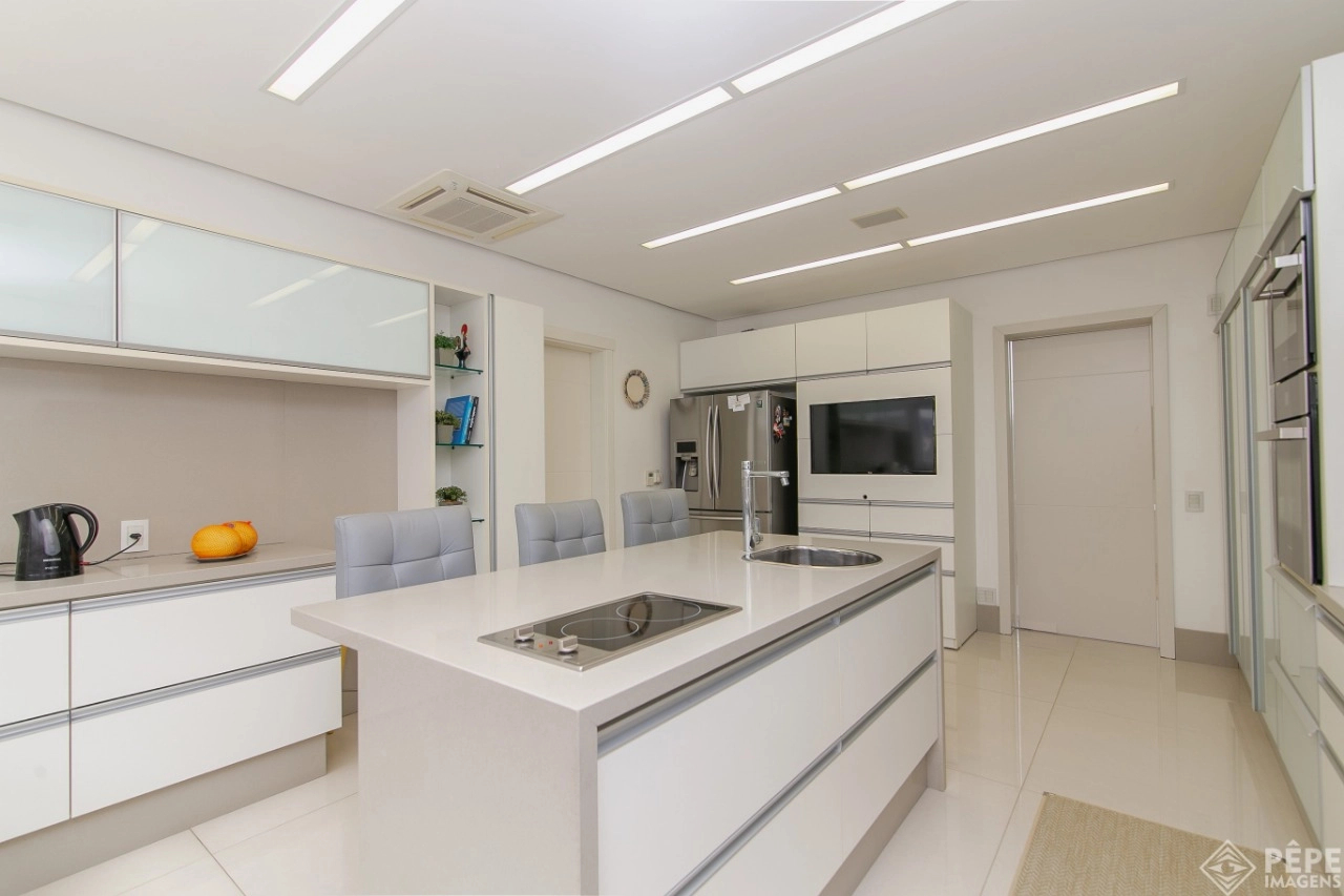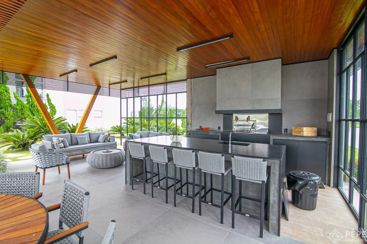 Magnífica casa com fachada revestida em quartzito, 100% mobiliada e equipada com o que a de melhor ! Edificada sobre os dois melhores terrenos do condomínio, são 740 metros privativos distribuídos em um imenso Living com pé direito duplo , lareira, lavabo, uma das 4 suítes ,banheiro social com acesso para a piscina e área externa, espaço gourmet com churrasqueira + sala de jantar integrada ao todo. Cozinha gourmet super equipada com ilha e piso aquecido, ampla área de serviço com dependência completa de empregada. Na parte superior 3 lindas suítes, sendo a master com sacadão em L, banheiro ele e ela com piso aquecido, e um closet com claraboia encantador. O imóvel possui, calefação e split em todas as peças, sistema de som e é completamente automatizado assim como as persianas. Na área externa temos um quiosque diferenciado com cozinha de apoio, churrasqueira, sala de estar com tv integrado a uma bela piscina com deck molhado edificada sobre um magnífico jardim projetado junto ao lago. O imóvel foi arquitetado e concebido por concorrida profissional, o que resultou em publicação de conceituada revista de arquitetura. Condomínio de infraestrutura completíssima com trapiche.