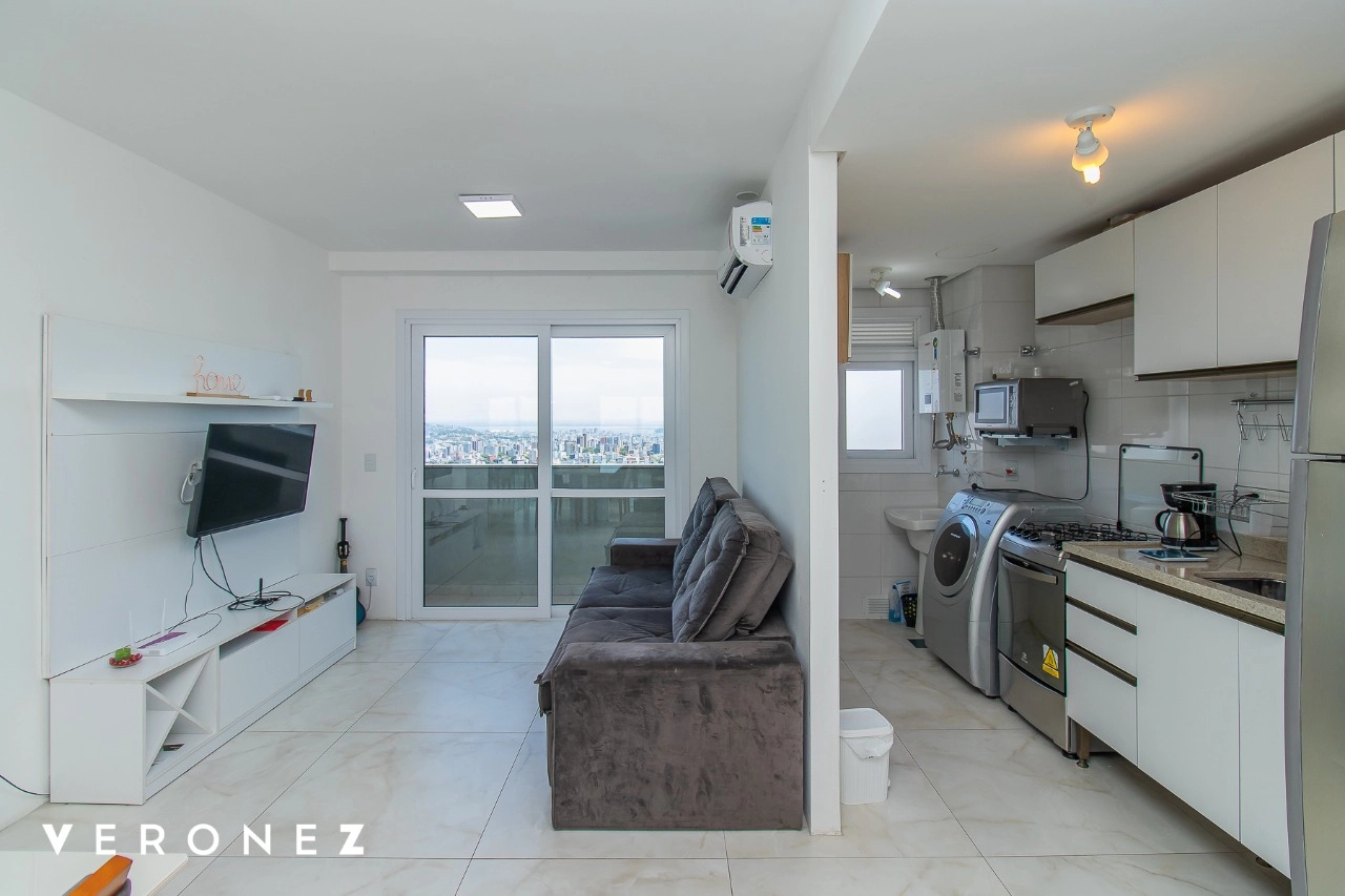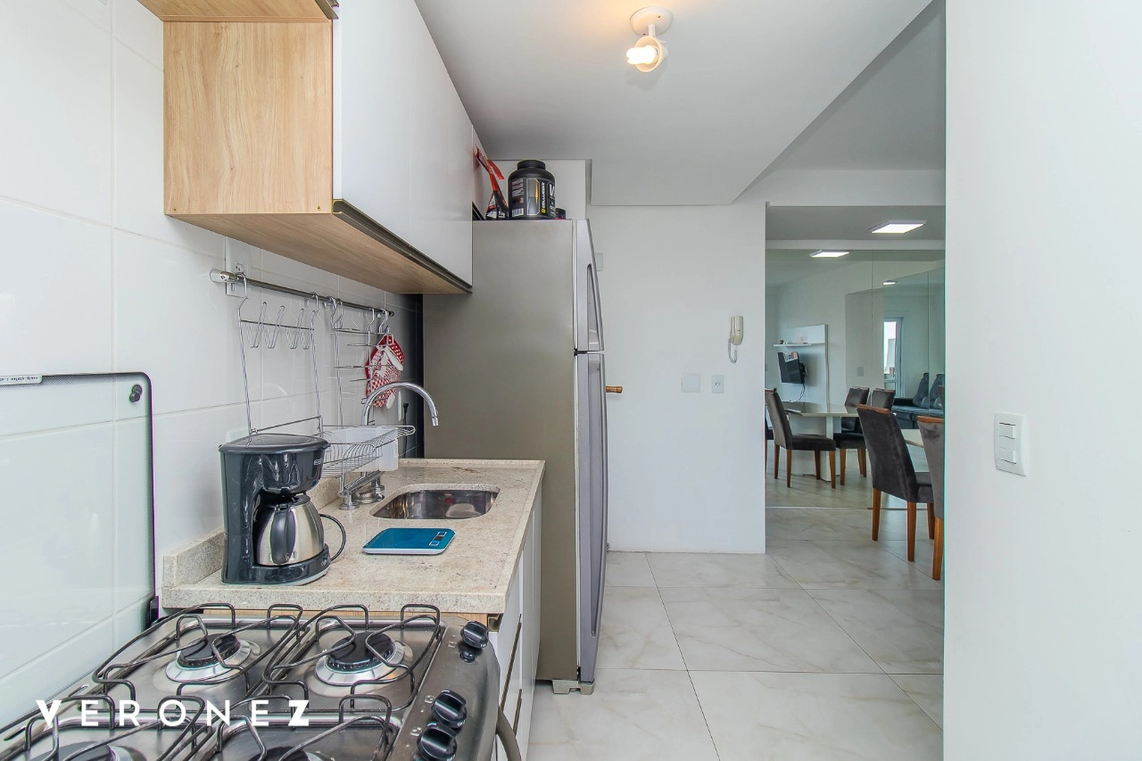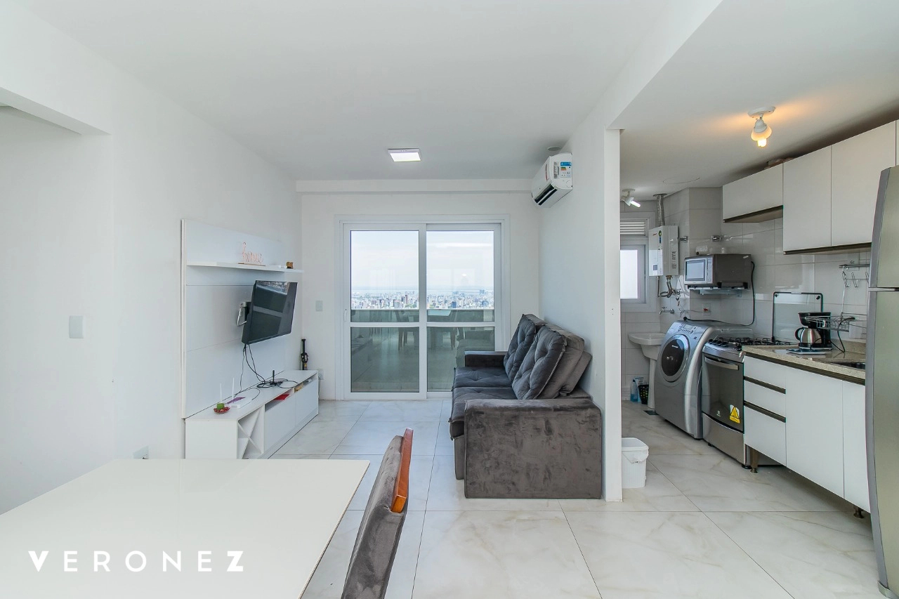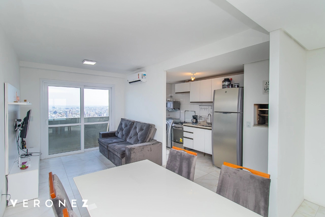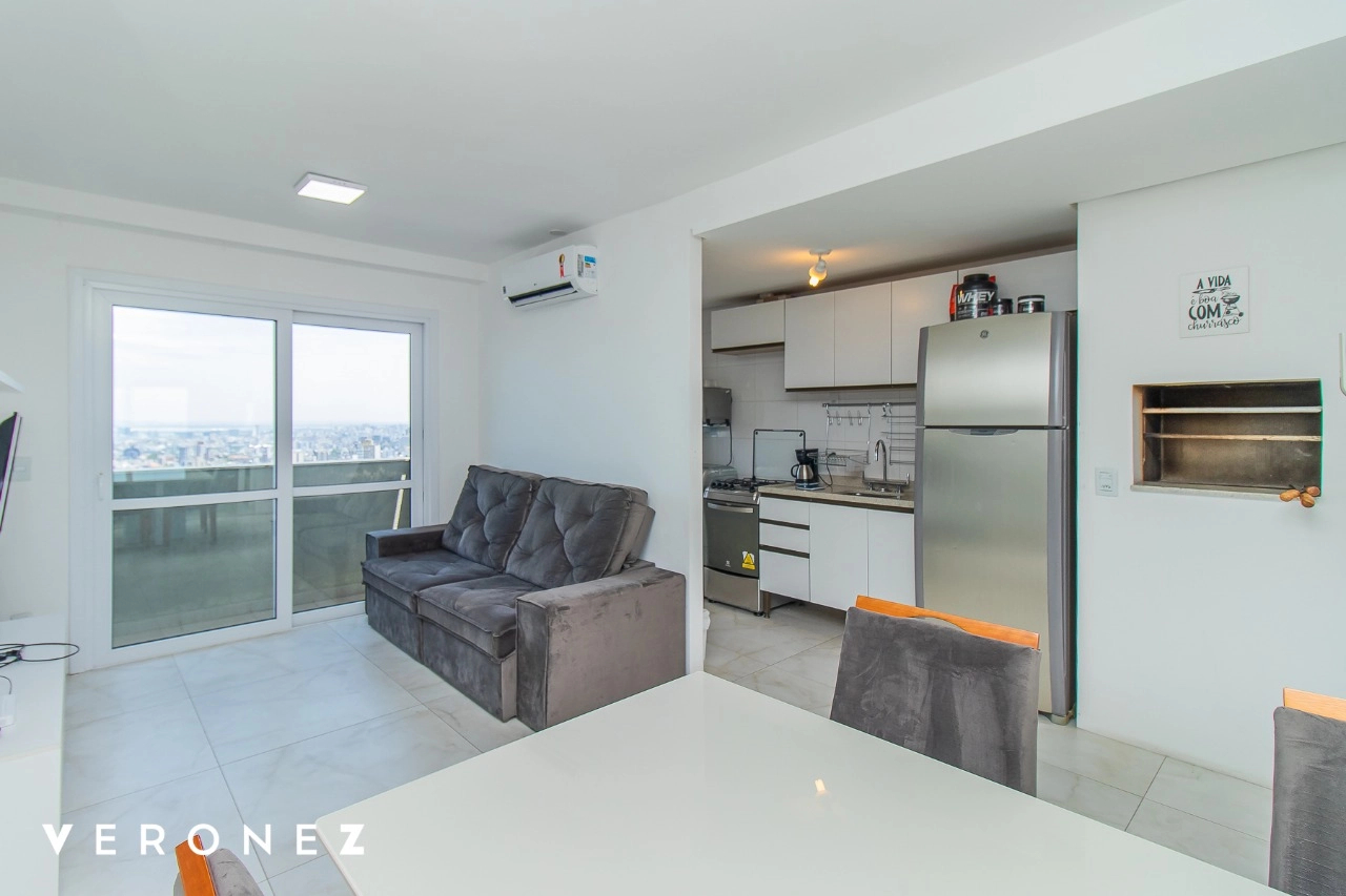 Apartamento de 2 dormitórios sendo 1 suíte, sacada com vista aberta em andar alto, cozinha integrada ao living mobiliado, churrasqueira, split e banheiro social com armários.