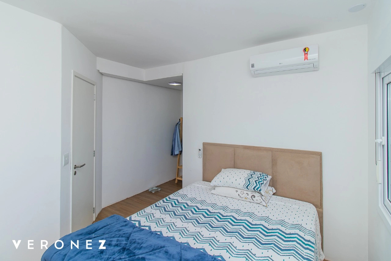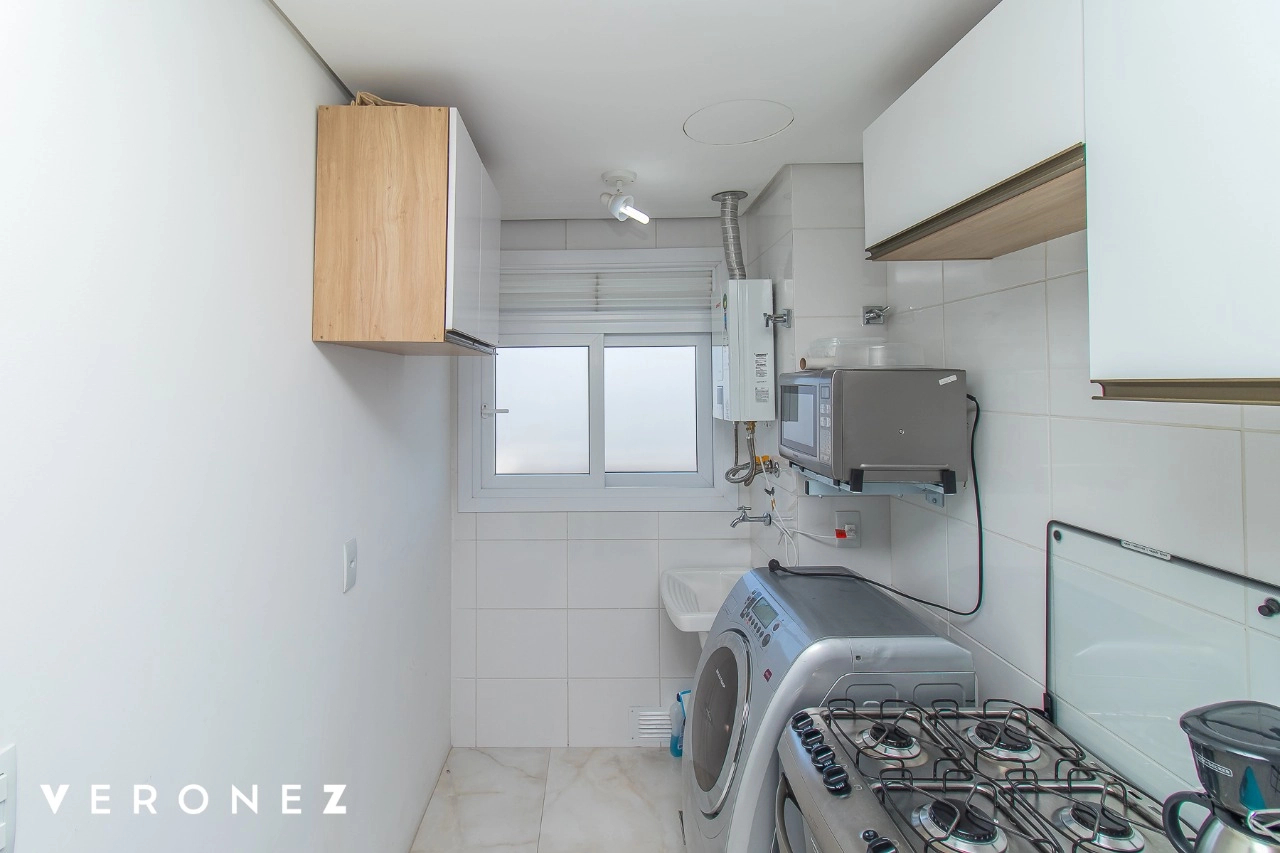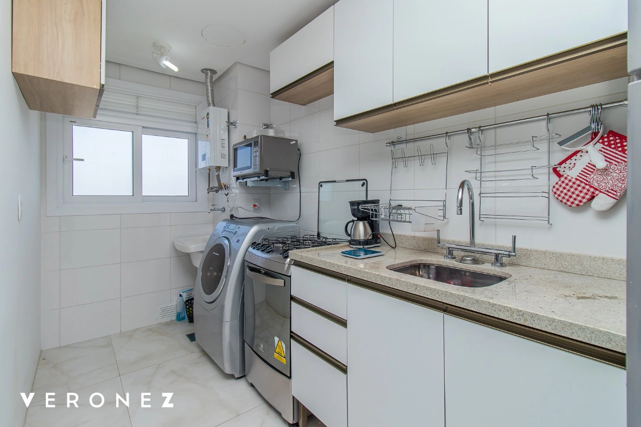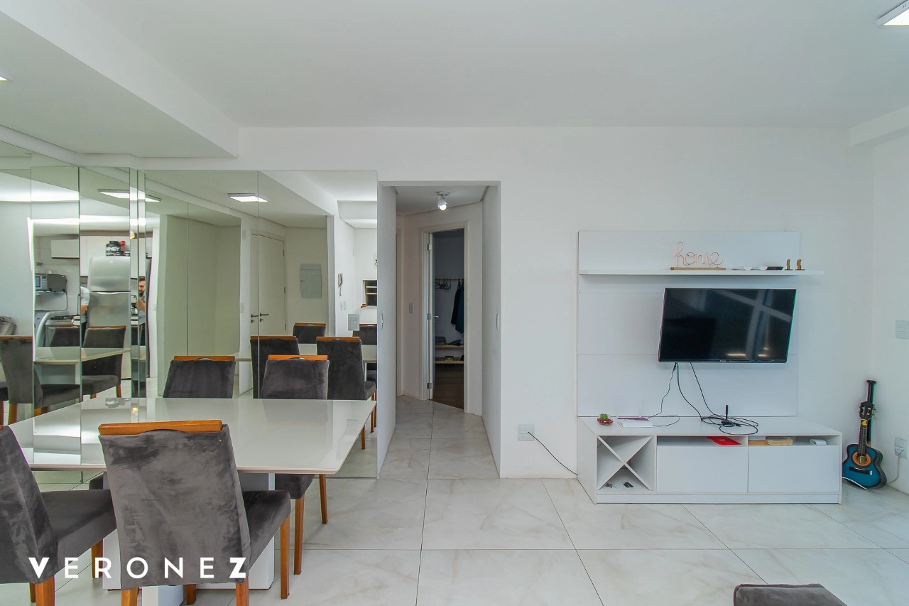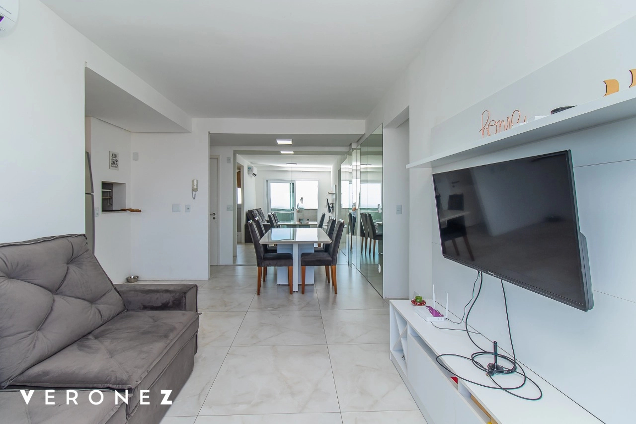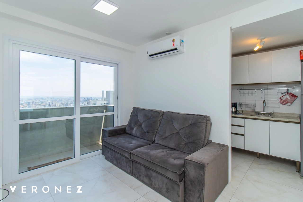 Apartamento de 2 dormitórios sendo 1 suíte, sacada com vista aberta em andar alto, cozinha integrada ao living mobiliado, churrasqueira, split e banheiro social com armários.