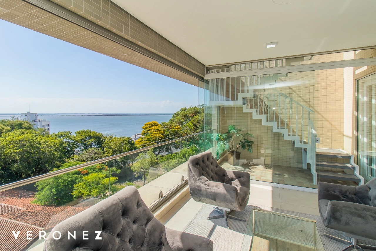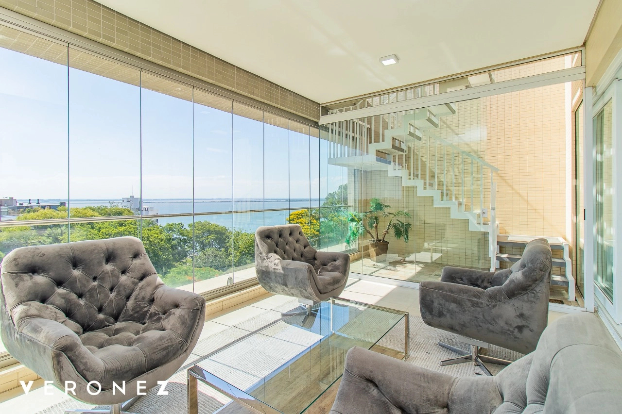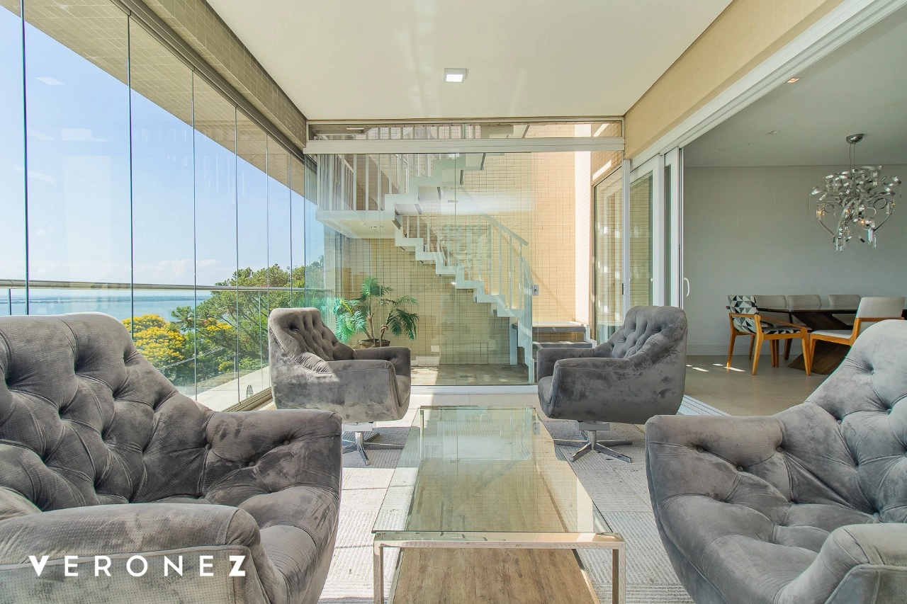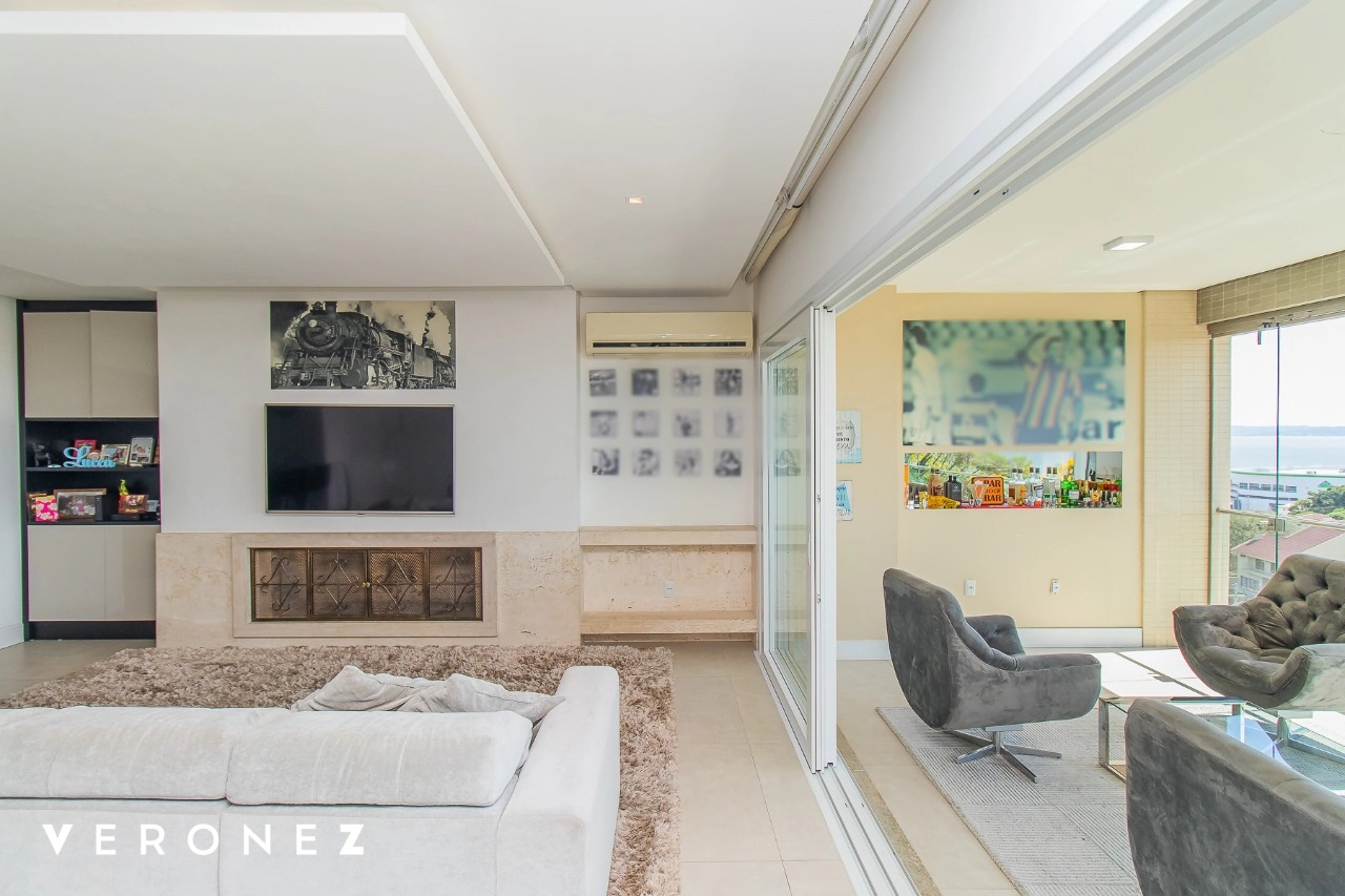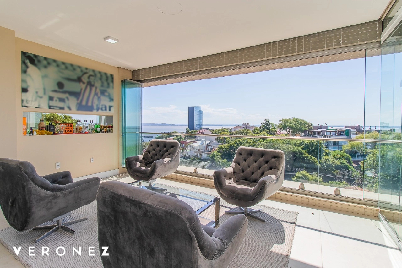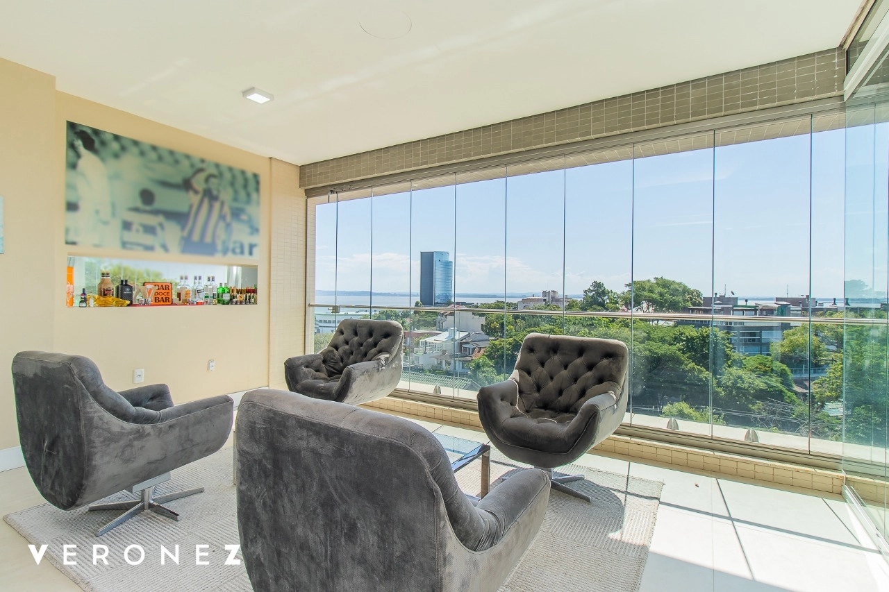 São 320 m² privativos, 3 amplas suítes com persianas elétricas e split instalado. Na suíte master tem uma varanda com jacuzzi e esteira! Passando os dormitórios você encontra uma aconchegante sala de cinema, projetada para ficar totalmente escura e proporcionar a melhor experiencia de um filme em família! No living temos lavabo, amplo ambiente de TV com lareira, split, varanda integrada com linda vista para o Guaíba, cozinha americana com churrasqueira e área de serviço separada com banheiro auxiliar! Na cobertura, piscina com deck molhado, amplo ambiente para churrasco com mesa de sinuca, TV, split e lavabo! O elevador chega diretamente no andar superior!