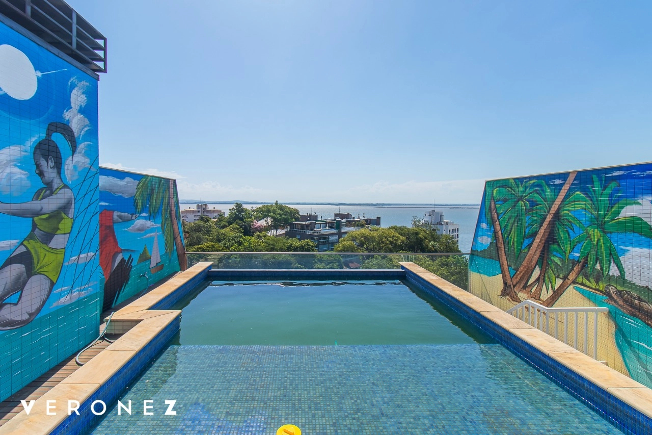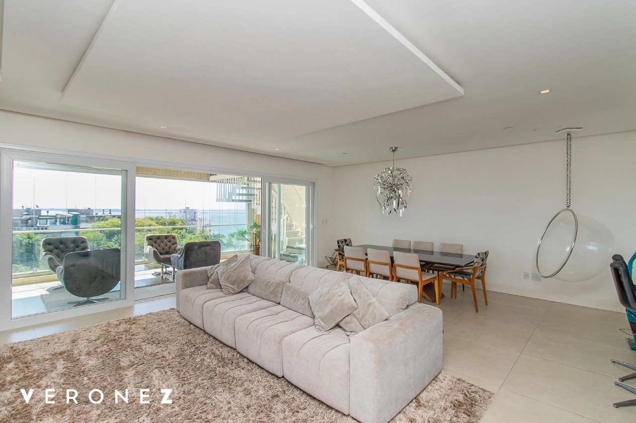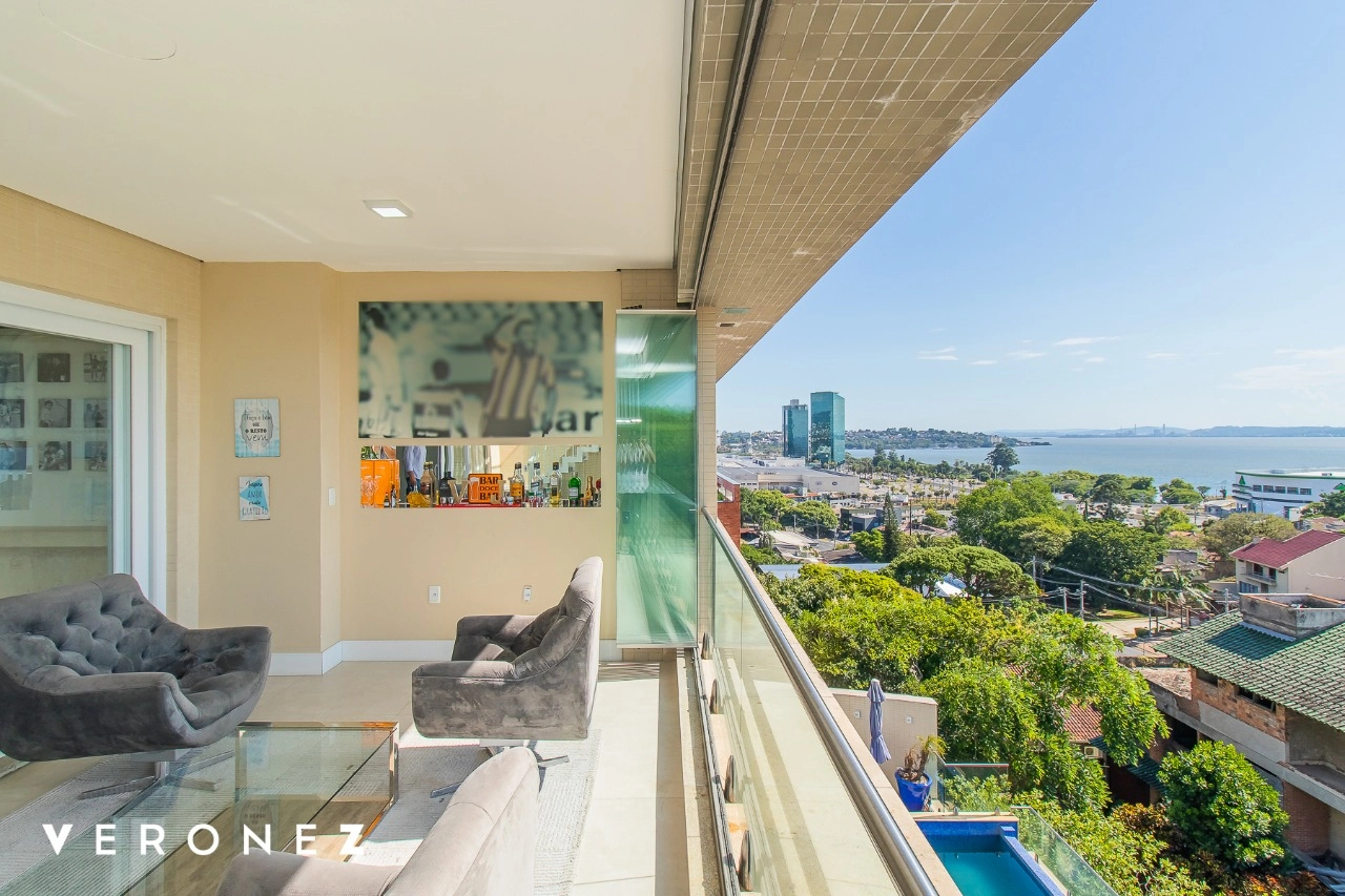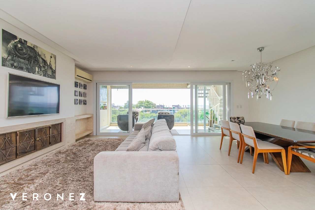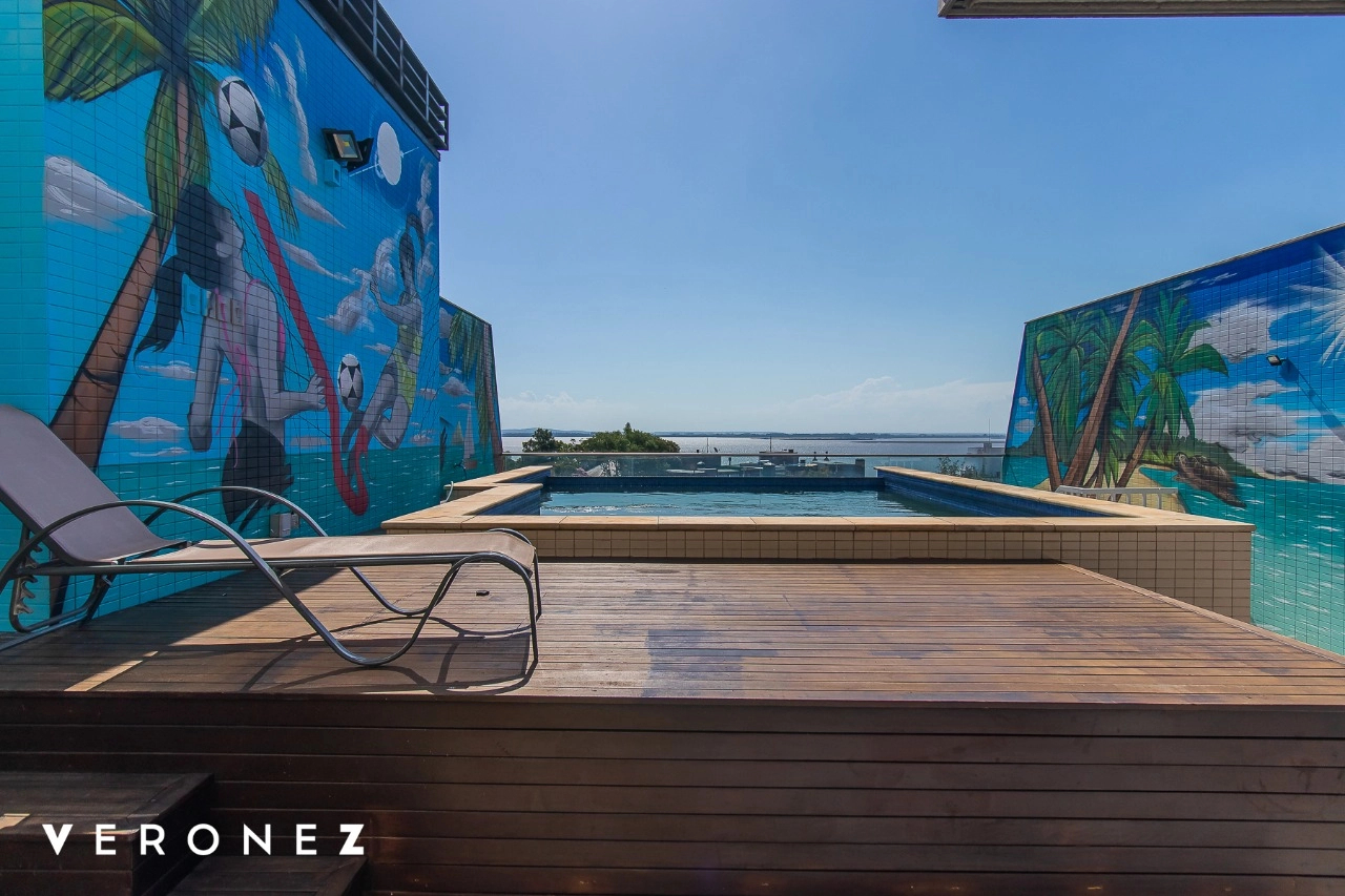 São 320 m² privativos, 3 amplas suítes com persianas elétricas e split instalado. Na suíte master tem uma varanda com jacuzzi e esteira! Passando os dormitórios você encontra uma aconchegante sala de cinema, projetada para ficar totalmente escura e proporcionar a melhor experiencia de um filme em família! No living temos lavabo, amplo ambiente de TV com lareira, split, varanda integrada com linda vista para o Guaíba, cozinha americana com churrasqueira e área de serviço separada com banheiro auxiliar! Na cobertura, piscina com deck molhado, amplo ambiente para churrasco com mesa de sinuca, TV, split e lavabo! O elevador chega diretamente no andar superior!