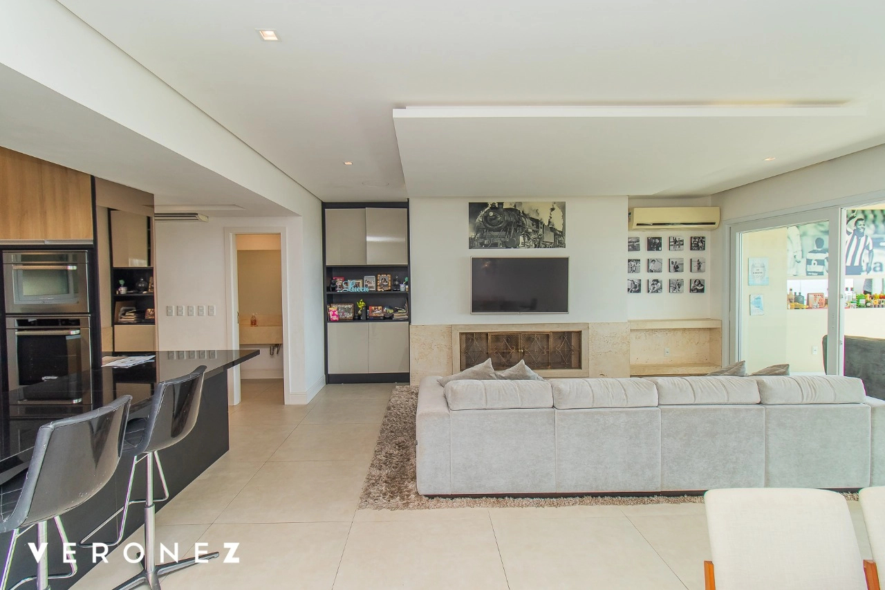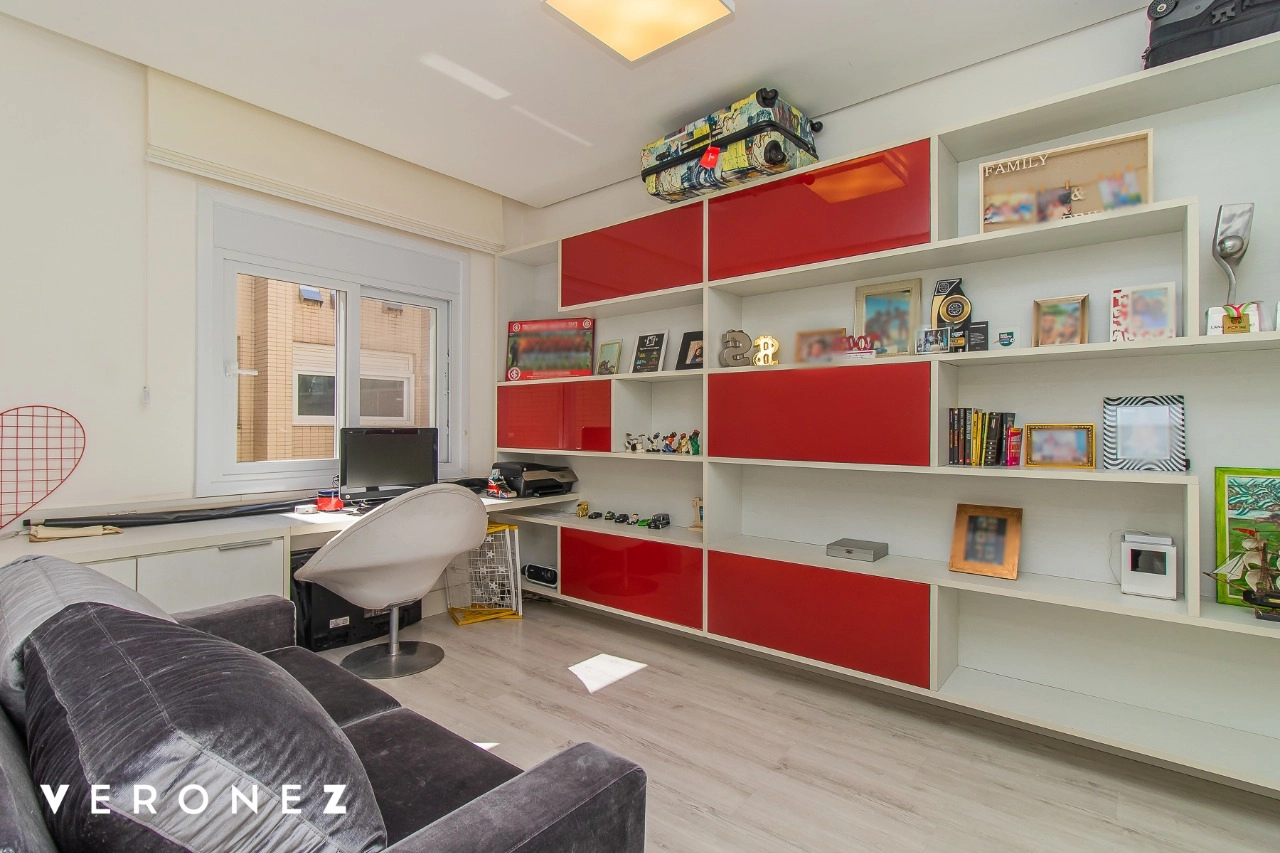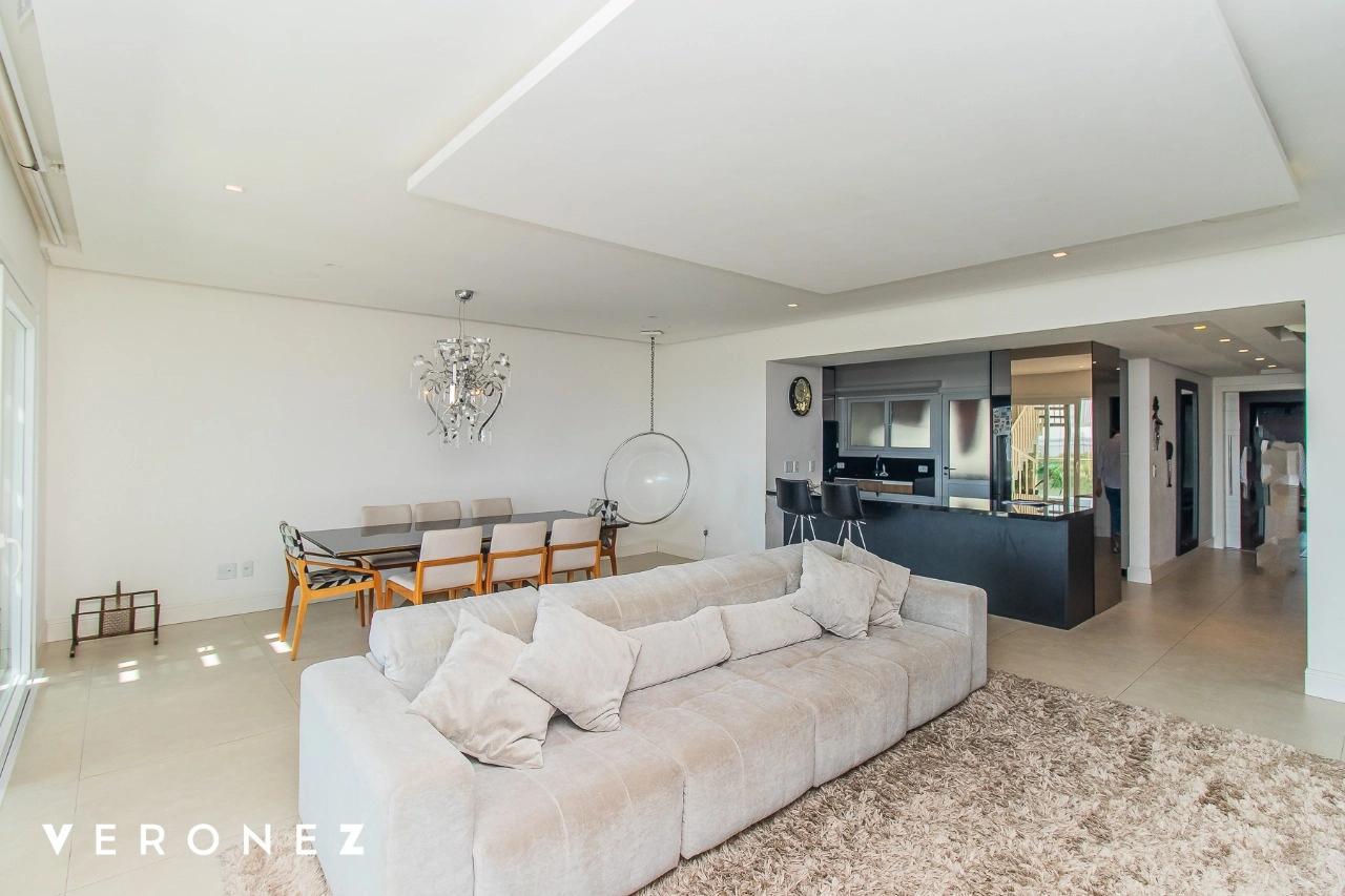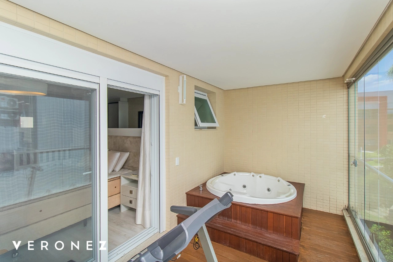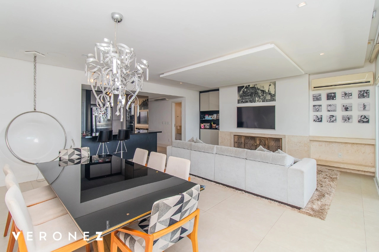 São 320 m² privativos, 3 amplas suítes com persianas elétricas e split instalado. Na suíte master tem uma varanda com jacuzzi e esteira! Passando os dormitórios você encontra uma aconchegante sala de cinema, projetada para ficar totalmente escura e proporcionar a melhor experiencia de um filme em família! No living temos lavabo, amplo ambiente de TV com lareira, split, varanda integrada com linda vista para o Guaíba, cozinha americana com churrasqueira e área de serviço separada com banheiro auxiliar! Na cobertura, piscina com deck molhado, amplo ambiente para churrasco com mesa de sinuca, TV, split e lavabo! O elevador chega diretamente no andar superior!