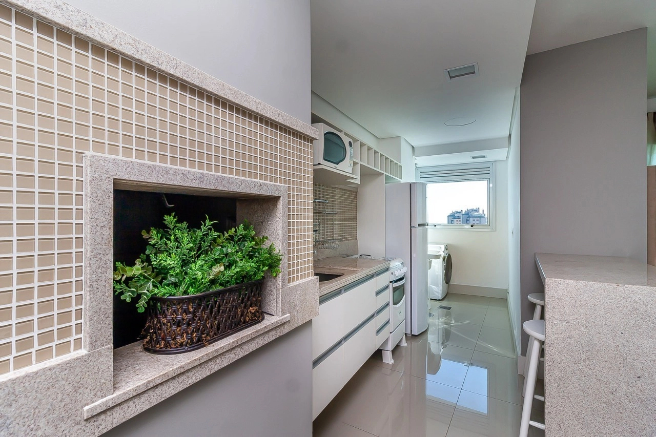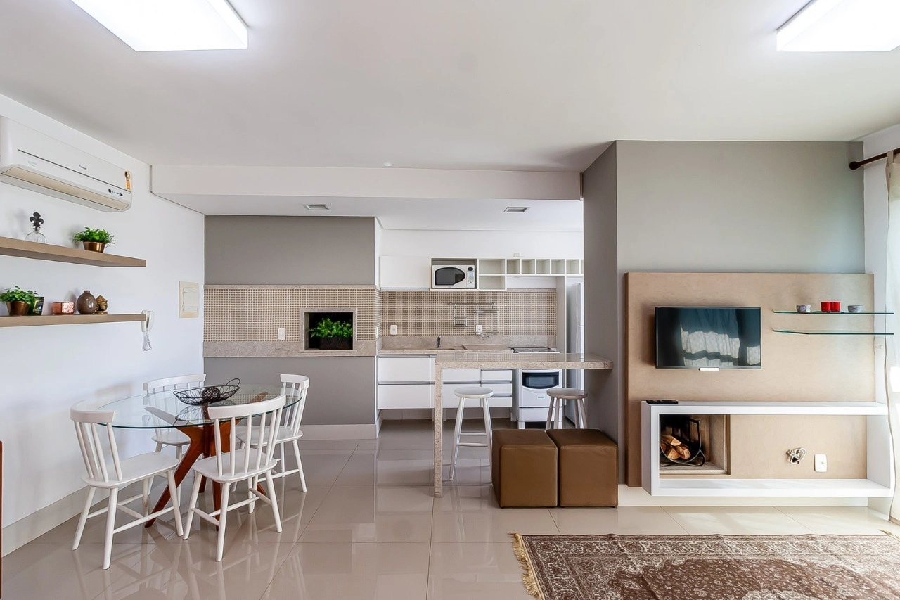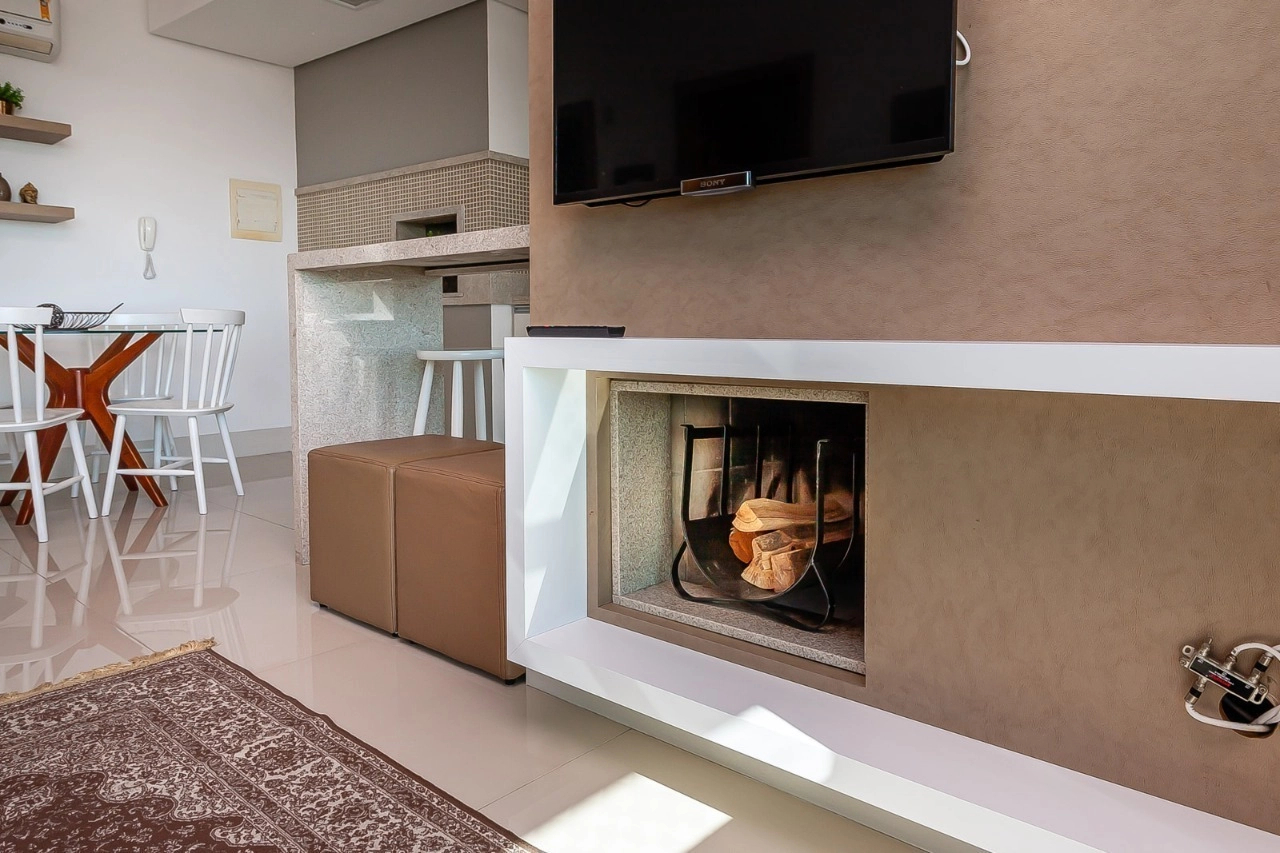 Conta com cozinha americana, móveis sob medida, churrasqueira, sala com lareira, sacada, dormitório com suíte.