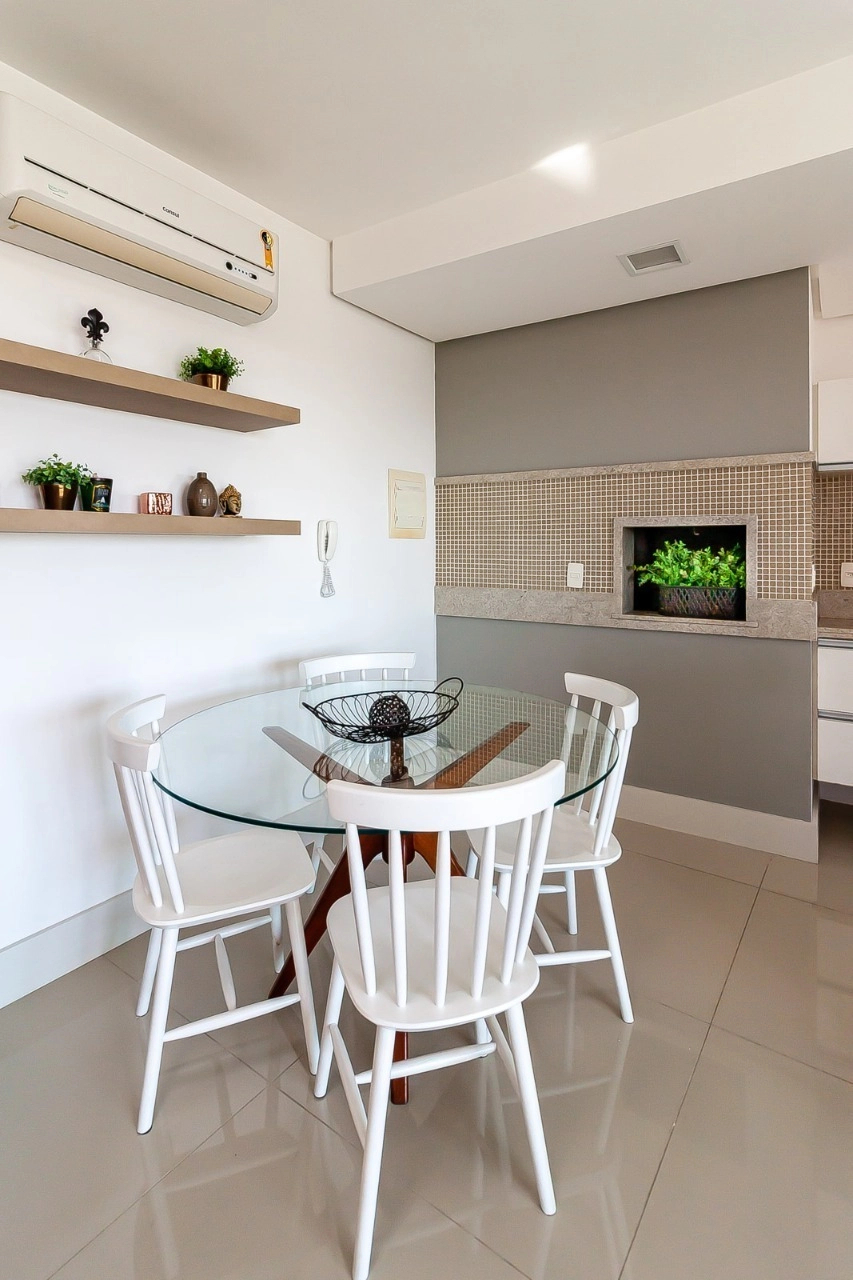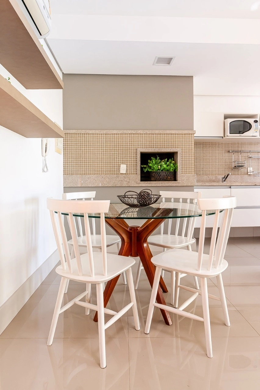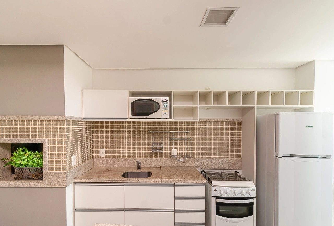 Conta com cozinha americana, móveis sob medida, churrasqueira, sala com lareira, sacada, dormitório com suíte.