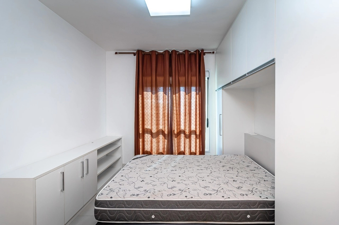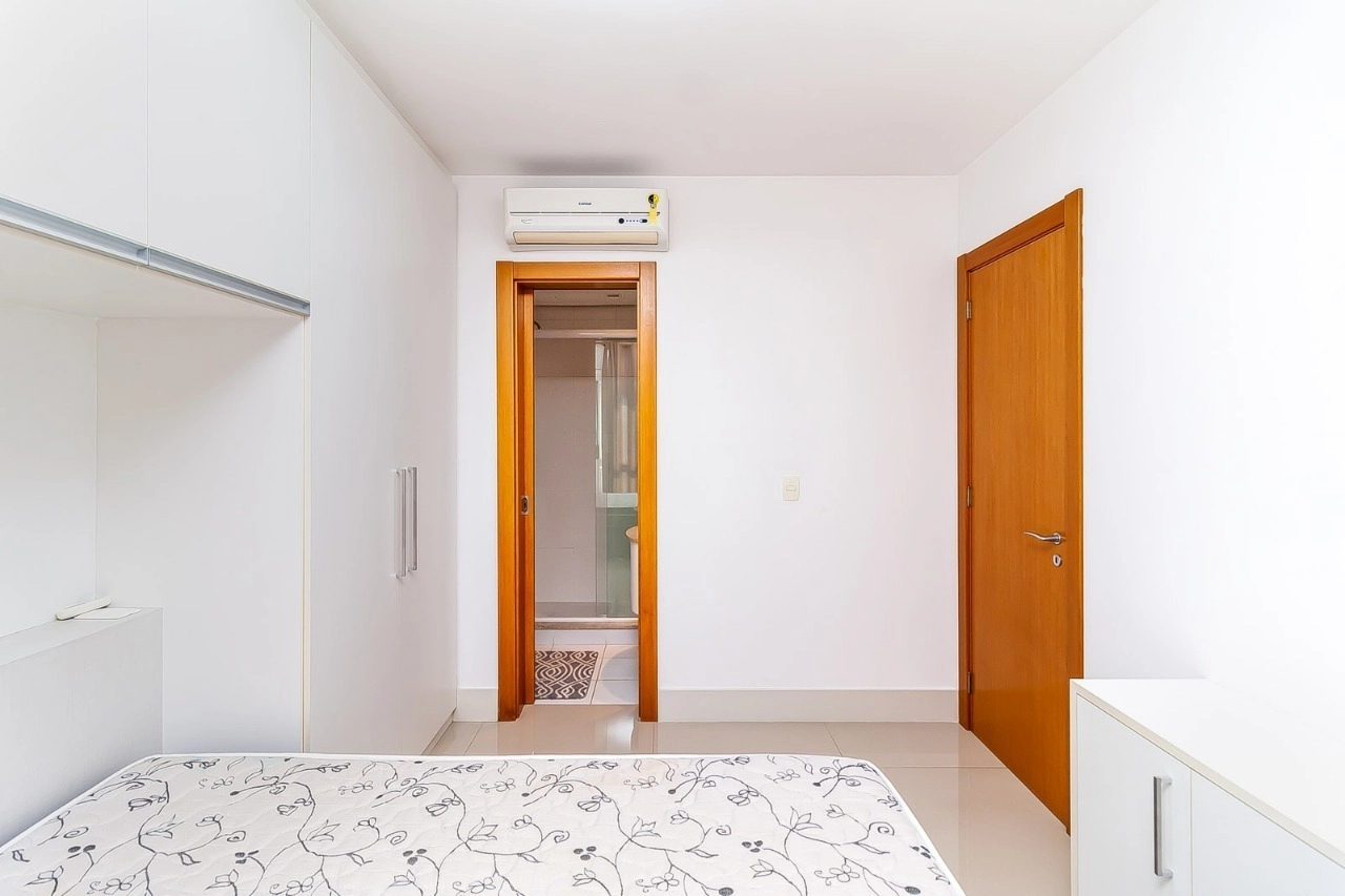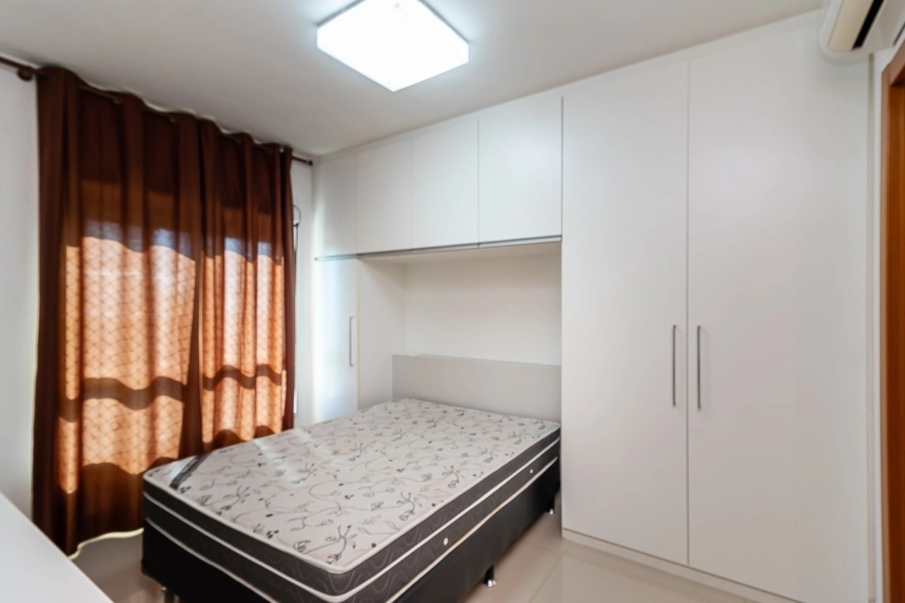 Apartamento mobiliado com ar condicionado na sala, cooktop, geladeira, forno embutido, maquina lava e seca, sofá, mesa de 4 lugares, cama e armários.